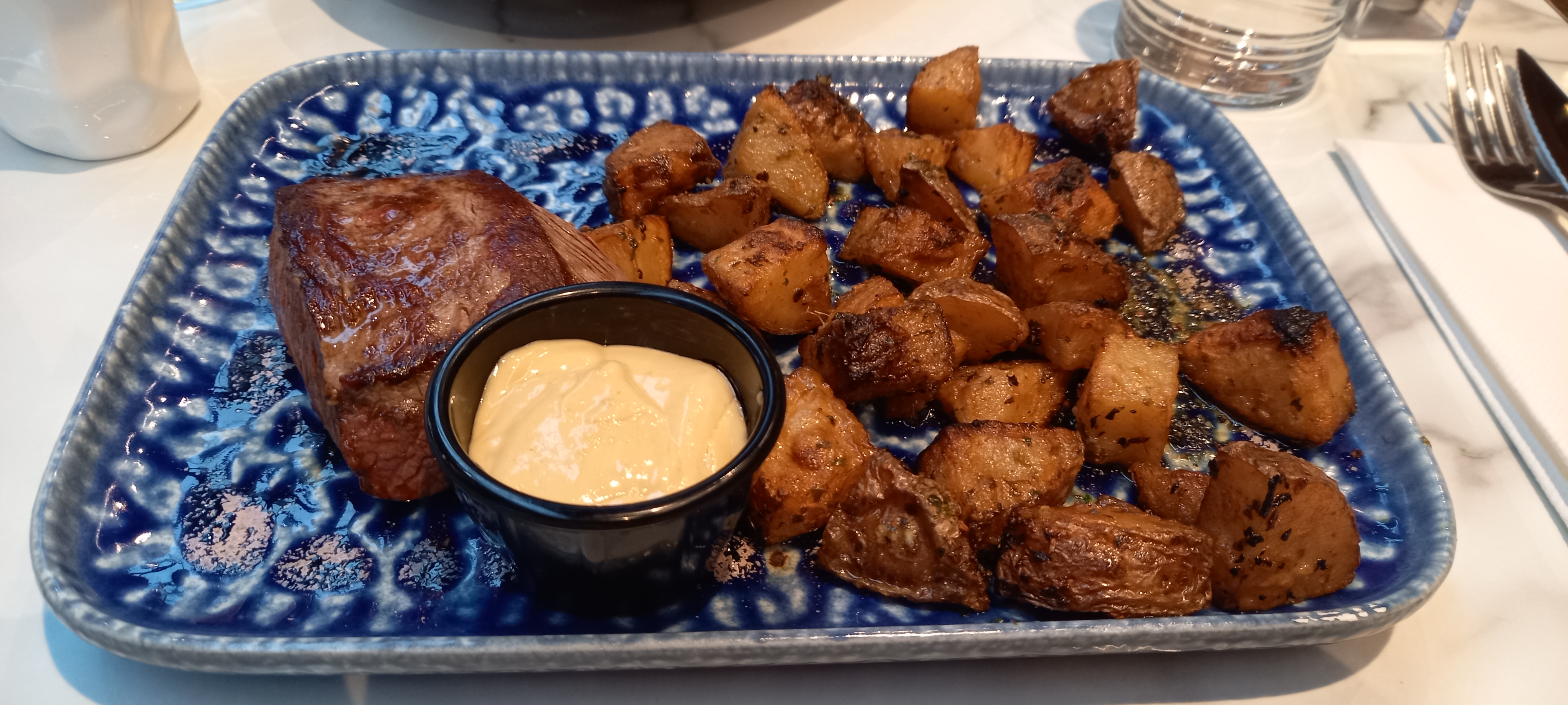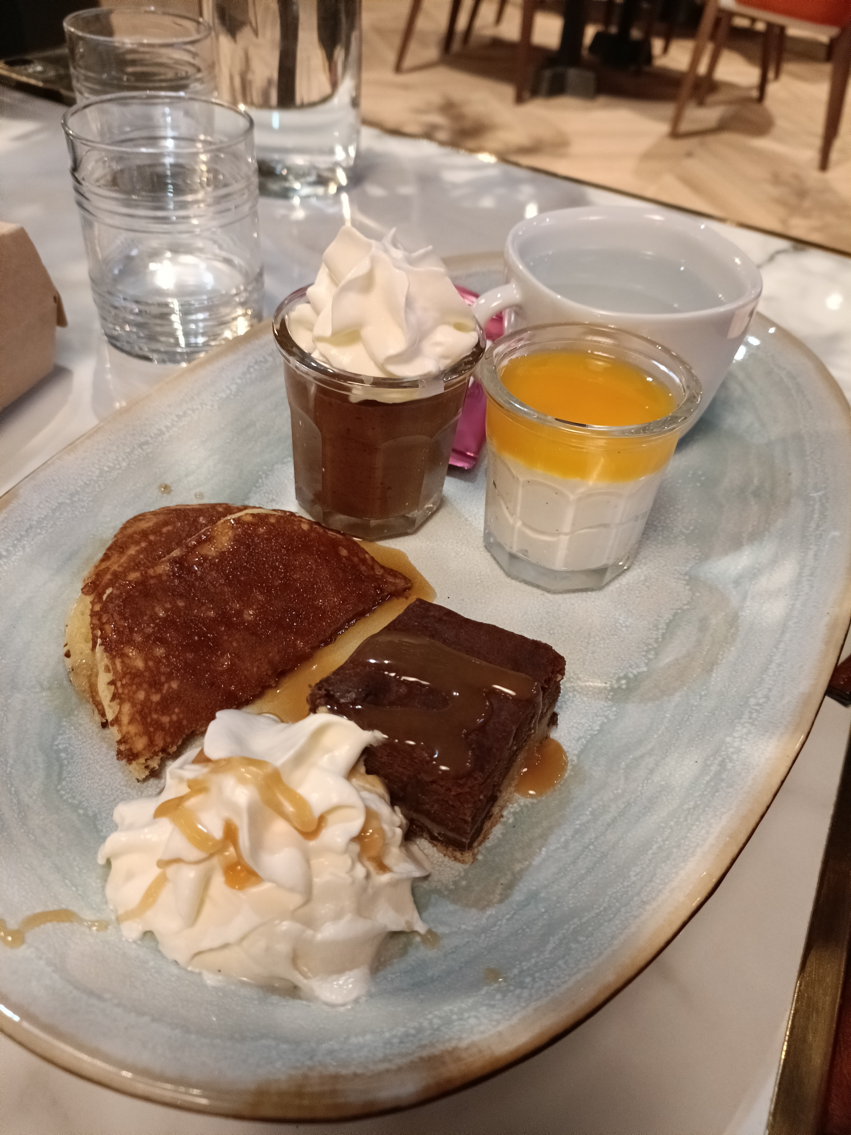 Nous étions en groupe et n'avons pas eu le choix que de prendre un menu, le plat du menu n'était pas à la hauteur du prix (23 euros pr chicken rolls (qui s'apparentait à un kebab frites dans une assiette version effiloché de poulet) et un café gourmand). Ceux qui avait pris comme moi étaient tout aussi déçu de l'assiette ainsi que du goût.