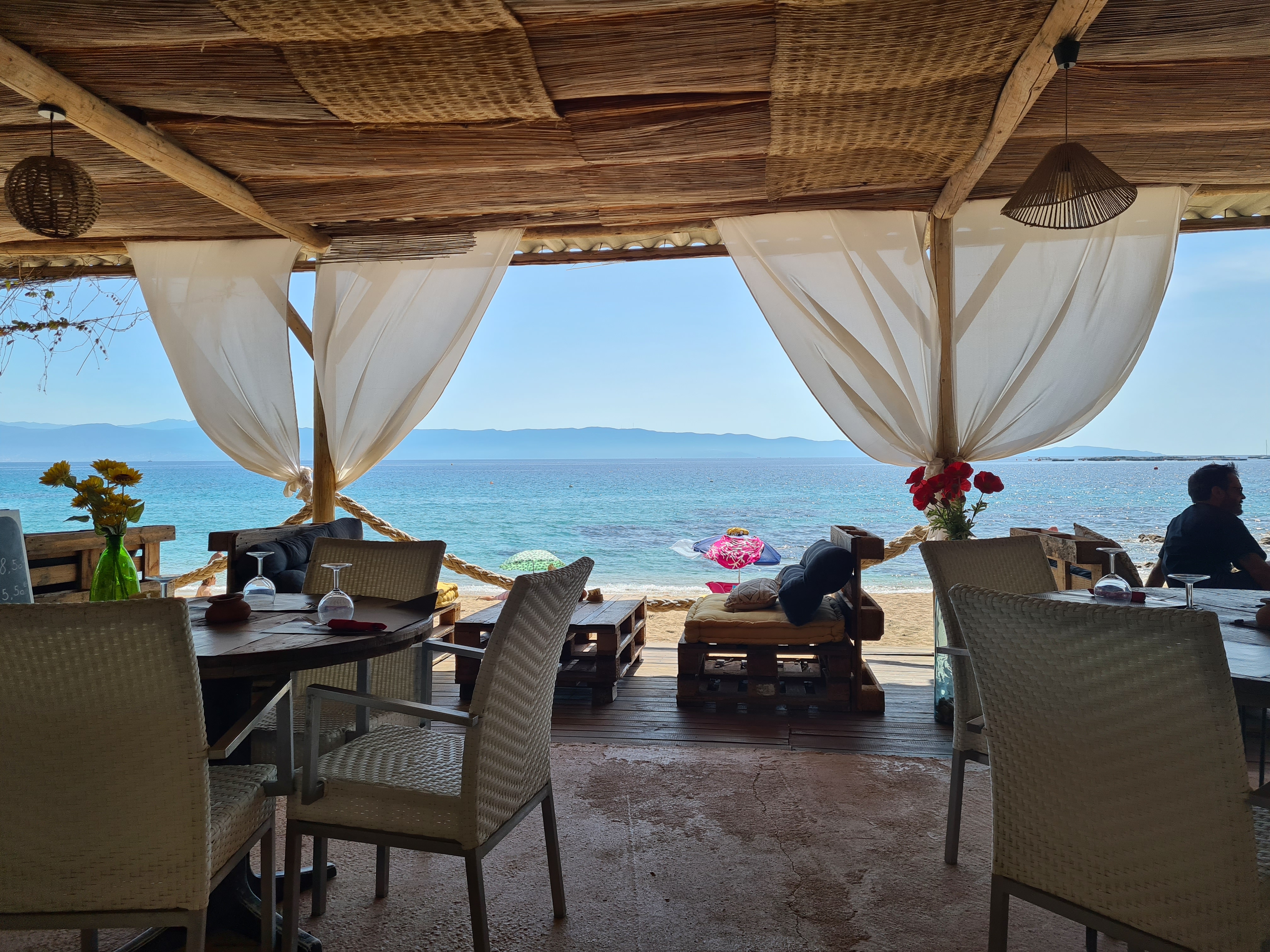 Cadre magnifique, Carte un peu light a l heure du goûter, plus de choix dans les glaces (industrielles), et un peu de monde, service débordé, de l'attente au service, à l encaissement... mais le cadre nous le fait oublier... c est les vacances ! La plage en revanche est ma préférée de la région d Ajaccio. Fan de Snorkeling, de toute celles que j ai faite dans la région, c est la plus intéressante.