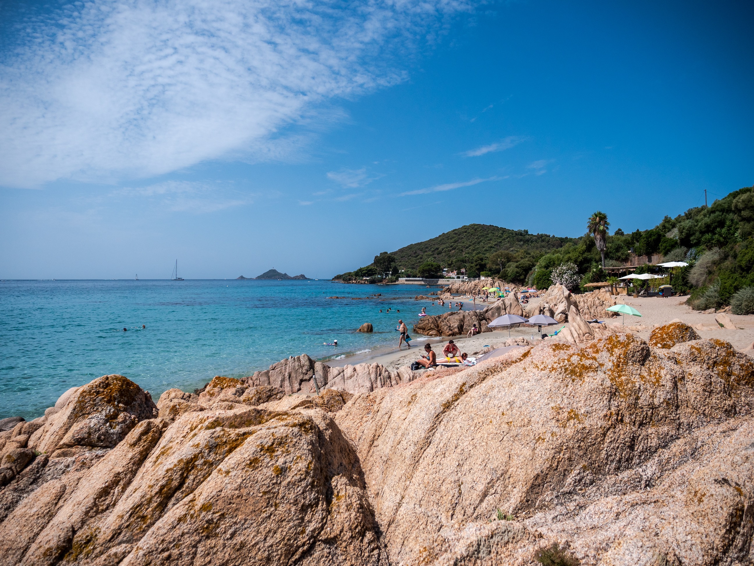 bar de plage parfaitement décoré dans le thème bohème. La plage qu’il surplombe est parfaite : grâce aux rochers dans l’eau la mer a de magnifiques camaïeux et des fonds marins impressionnants !