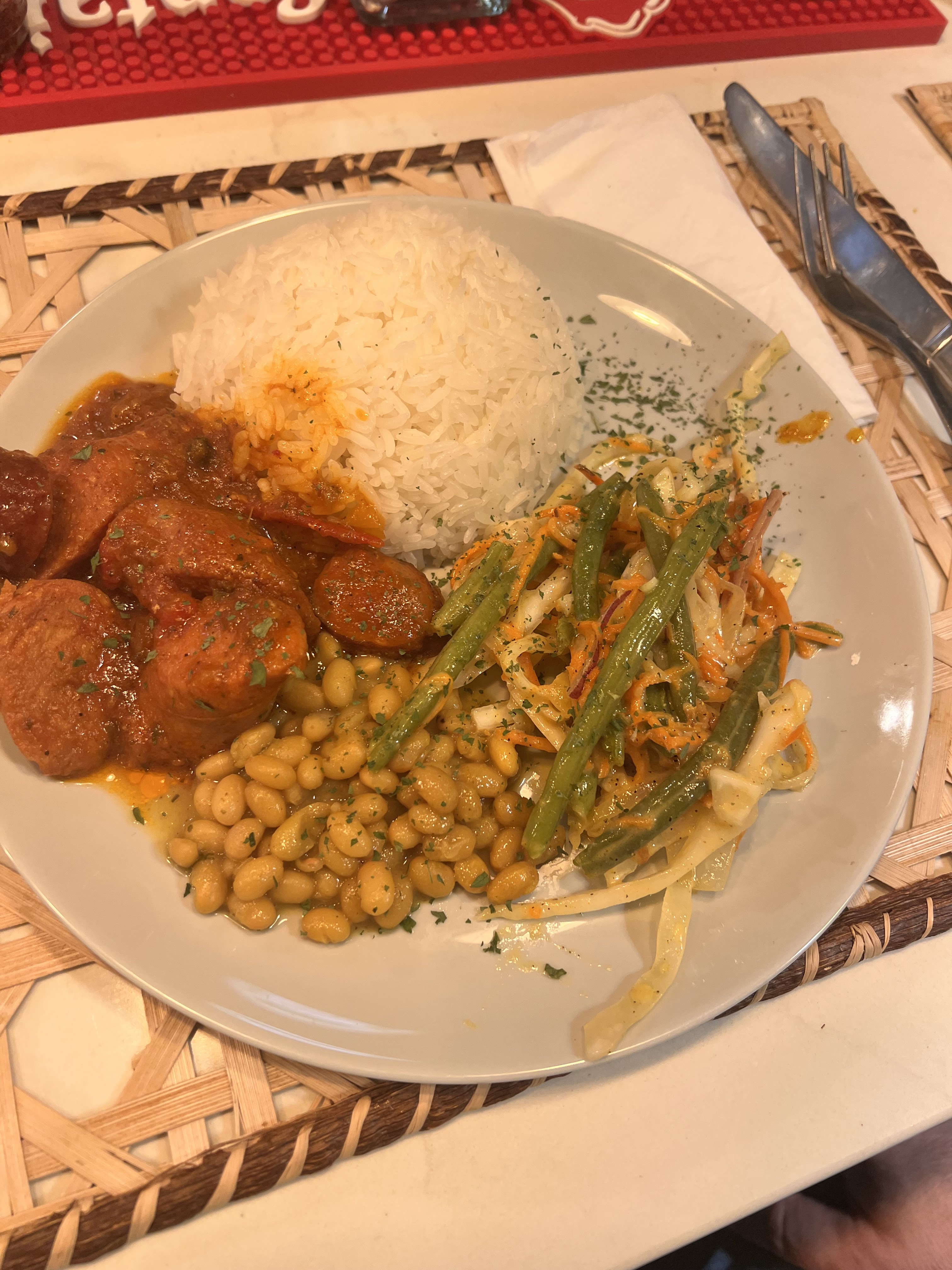 Une belle surprise que de découvrir un restaurant malgache ! Ravitoto. Rougai saucisses et brochettes. Super bon et les légumes savoureux avec le riz. On aurait aimé une plus grande part car c était délicieux.