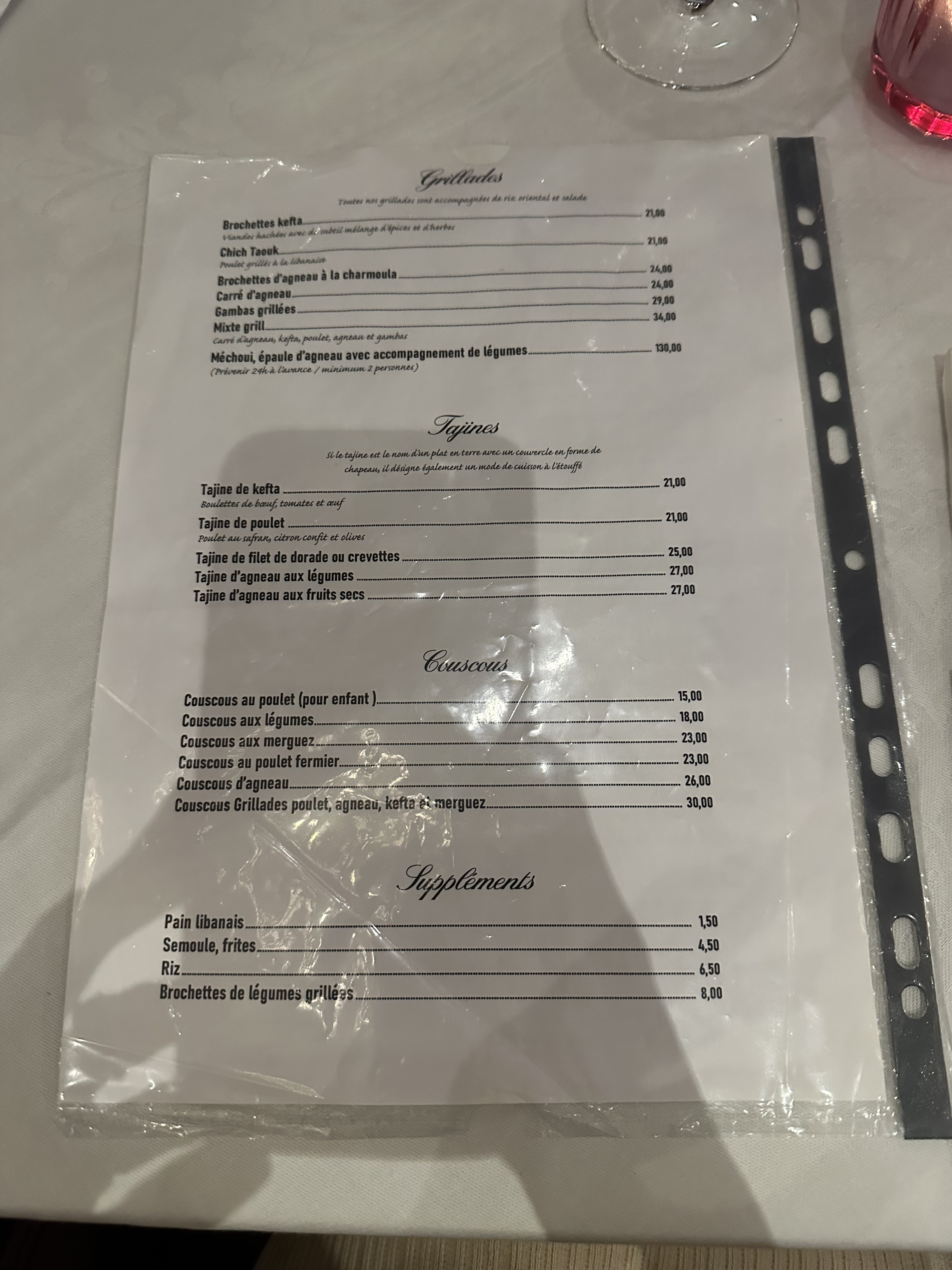Ce soir avec une amie Cadre agréable chaud Accueil sympathique Entrée : une pastilla au poulet un régal Plat tajine aux crevettes beaucoup trop pimentée pour moi (ce détail pourrait être mentionné sur la carte) Je le signale j’ai les excuses de la serveuse qui confirme que ce soir ce plat est vraiment fort. Les desserts frais et bons Le thé à la menthe nous sera offert