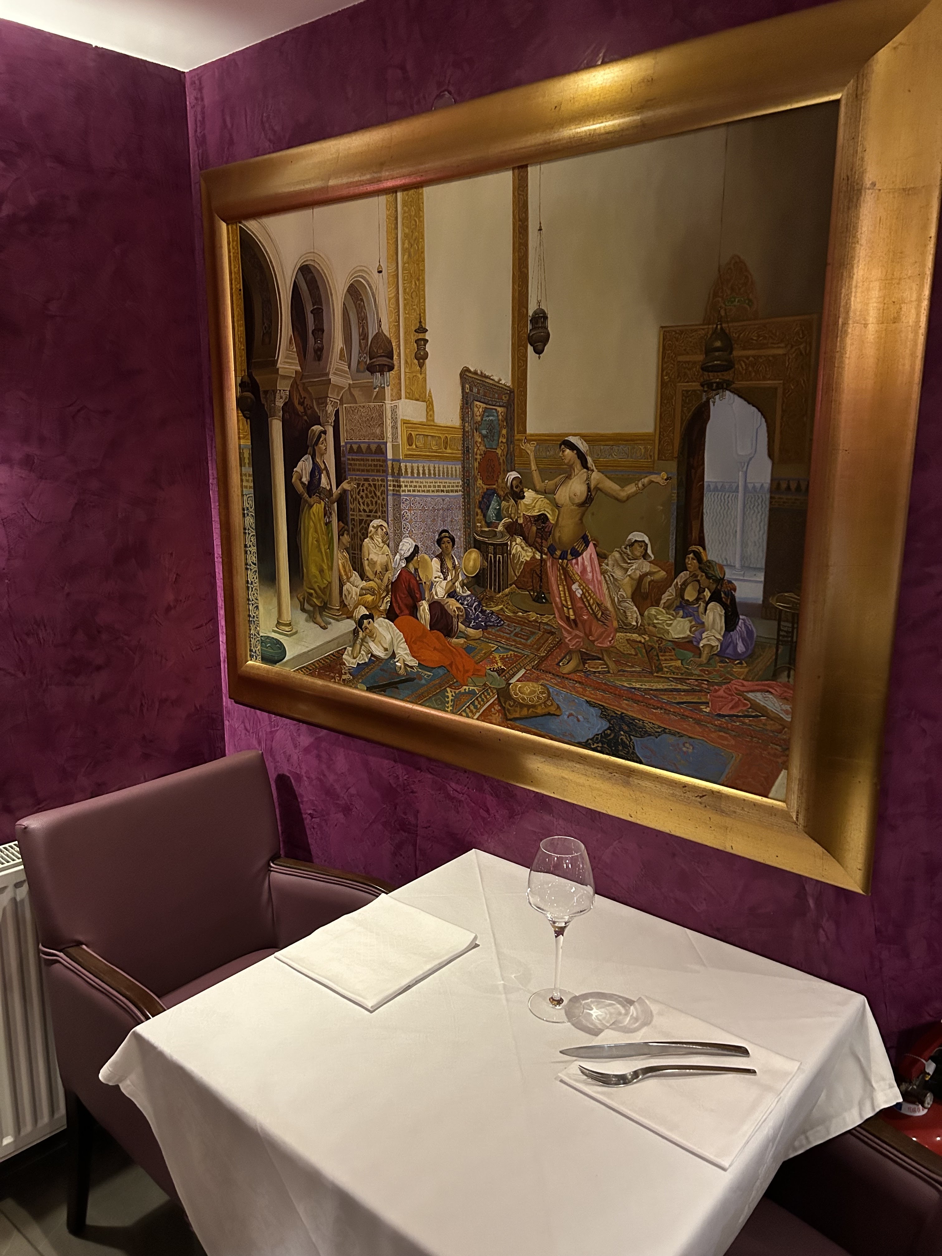 Mélange de cuisine libanaise et marocaine servi dans un décor oriental, fortement teinté de violet. Il y avait un mezze chaud libanais à moitié correct, la portion servie était ridicule, 6-7 pièces pour 25 €... Cher ! Il existe de meilleures options pour déjeuner dans la région.