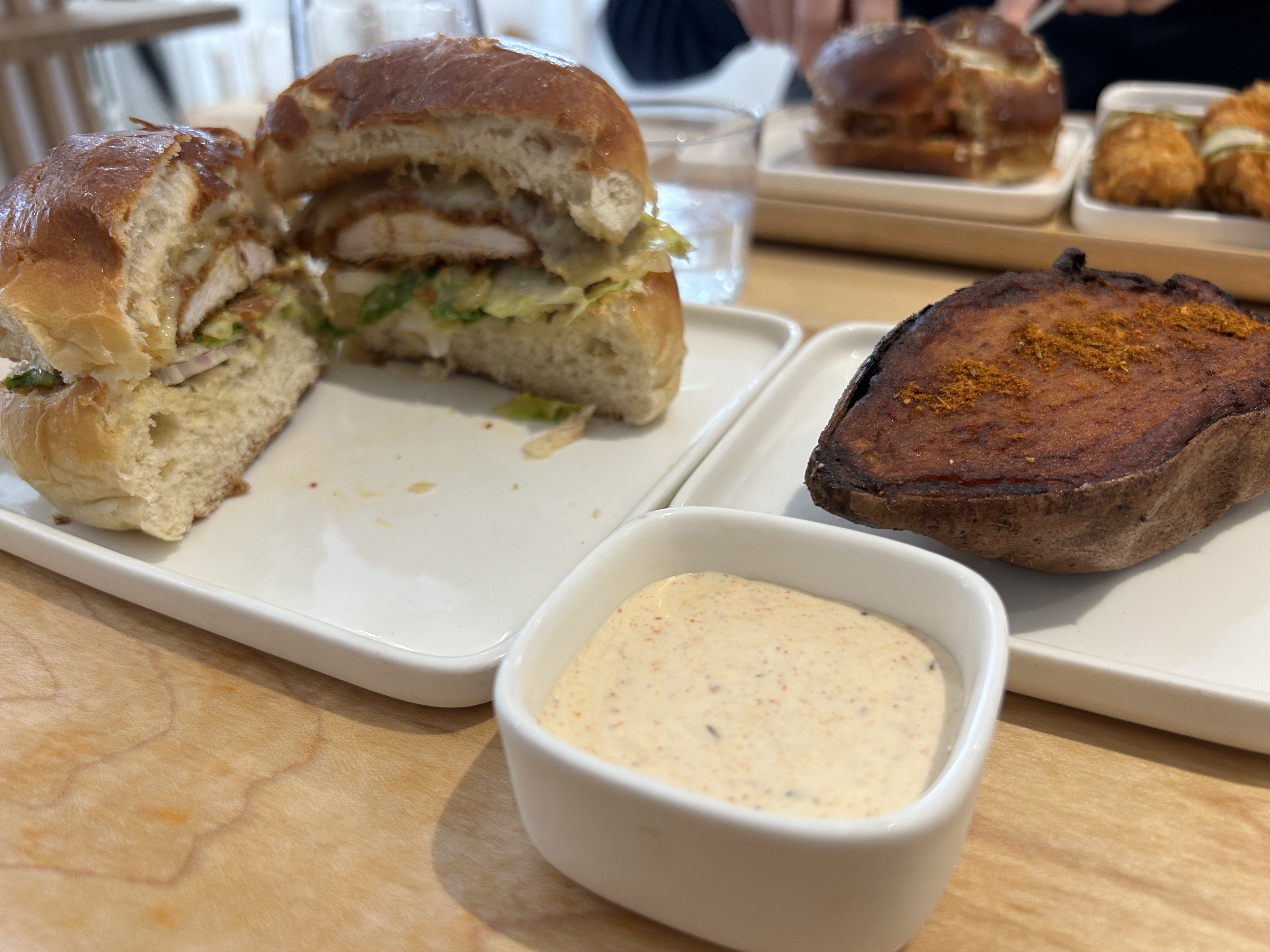 À DÉCOUVRIR ! Le pain bretzel est une folie. Les produits sont tous de qualité, le poulet pané et frit est très bon, la mayonnaise-miso est excellente également. Les frites de patate douce +++ avec la sauce légère. J'y retournerai avec plaisir !!