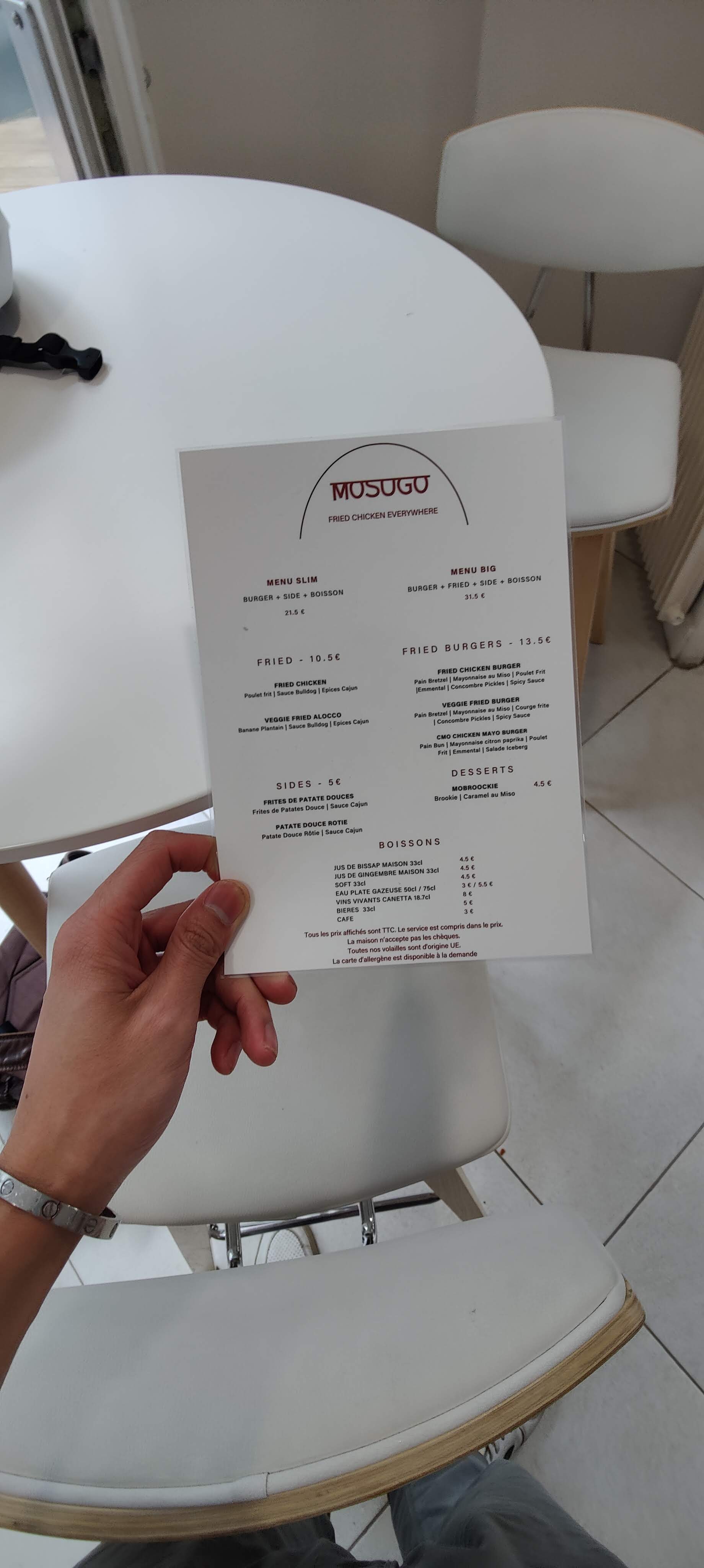 Excellent repas au Mosugo. Nous avions envie de découvrir cette adresse autour du poulet frit et nous n'avons pas été déçus. Le burger, les accompagnements frits, les légumes et les sauces, tout était délicieux. Nous avons apprécié aussi le jus de bissap, très parfumé sans être trop sucré, comme le jus de gingembre. L'endroit est calme et agréable et le service très sympa. Nous reviendrons découvrir les cartes des saisons prochaines !