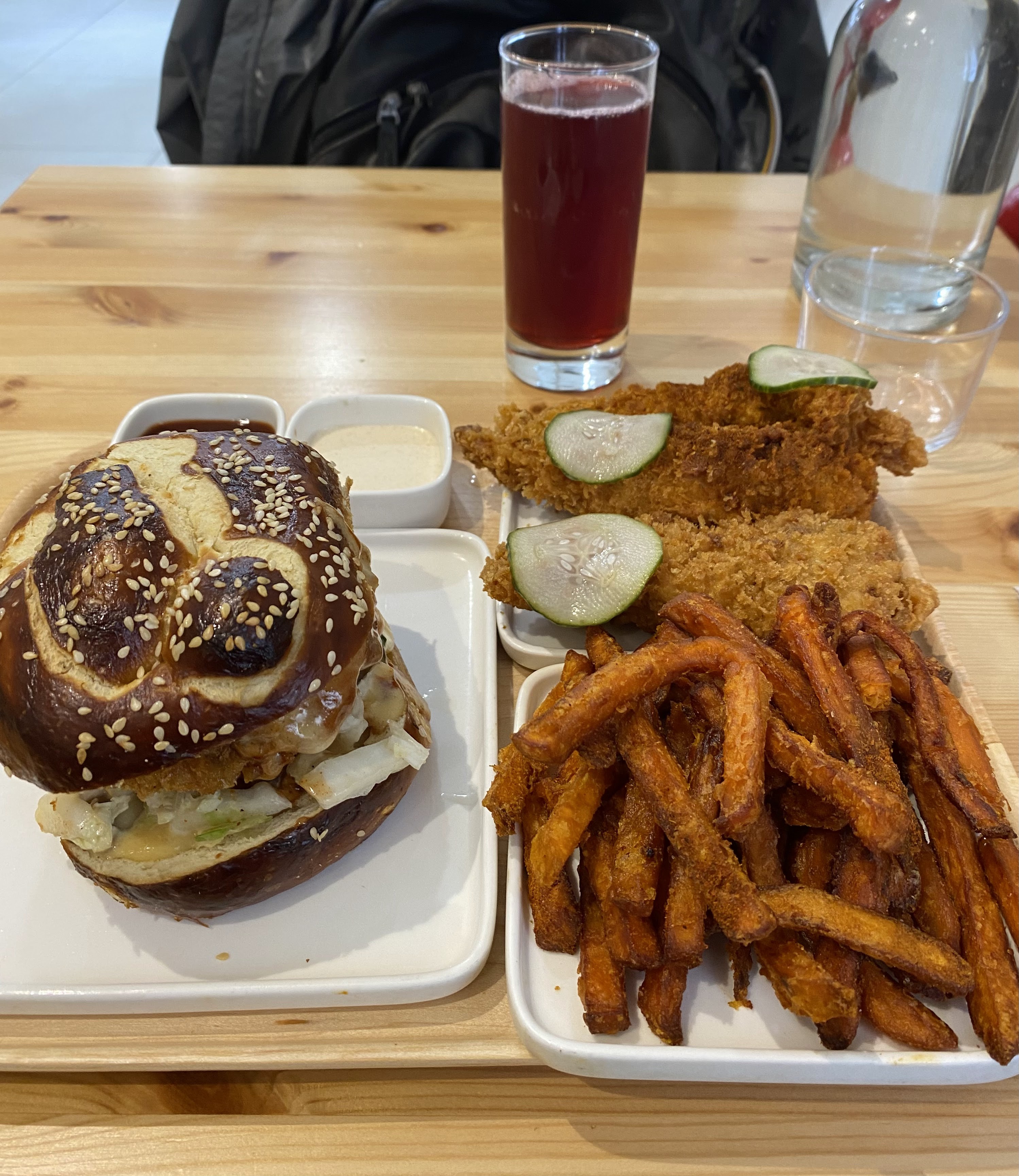 Nous avons déjeuné sur place. Il y avait une serveuse sympathique et professionnelle, et une deuxième, malheureusement, tout l'inverse ! Le burger (pain bretzel et poulet frit) est très bon et copieux. Nous avons partagé une portion de frites de patate douce pour deux et c'était suffisant !