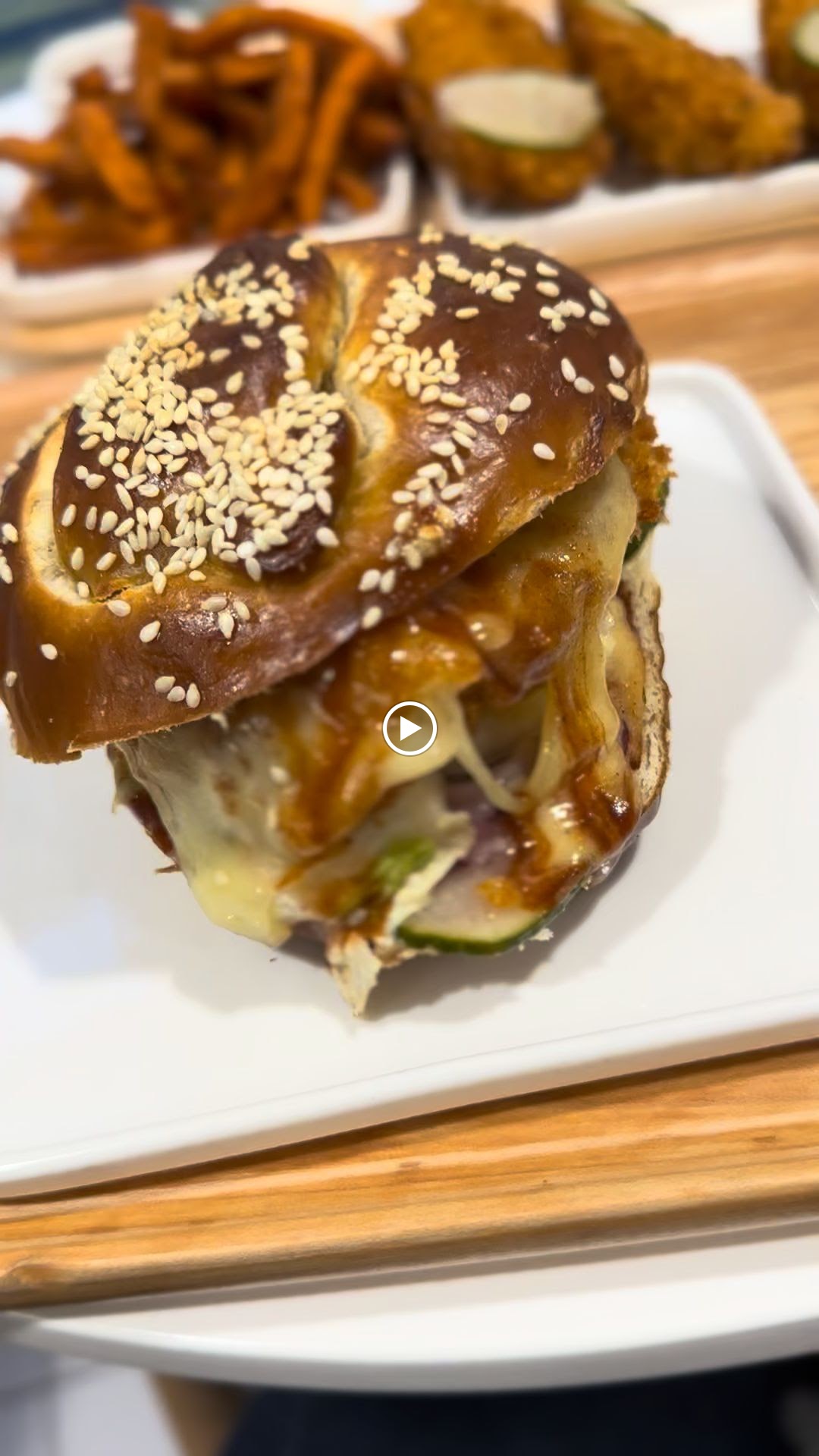 Un burger exceptionnel servi avec un pain bretzel croustillant, accompagné d'une mayonnaise épicée savoureuse. Une combinaison gagnante. 🍔