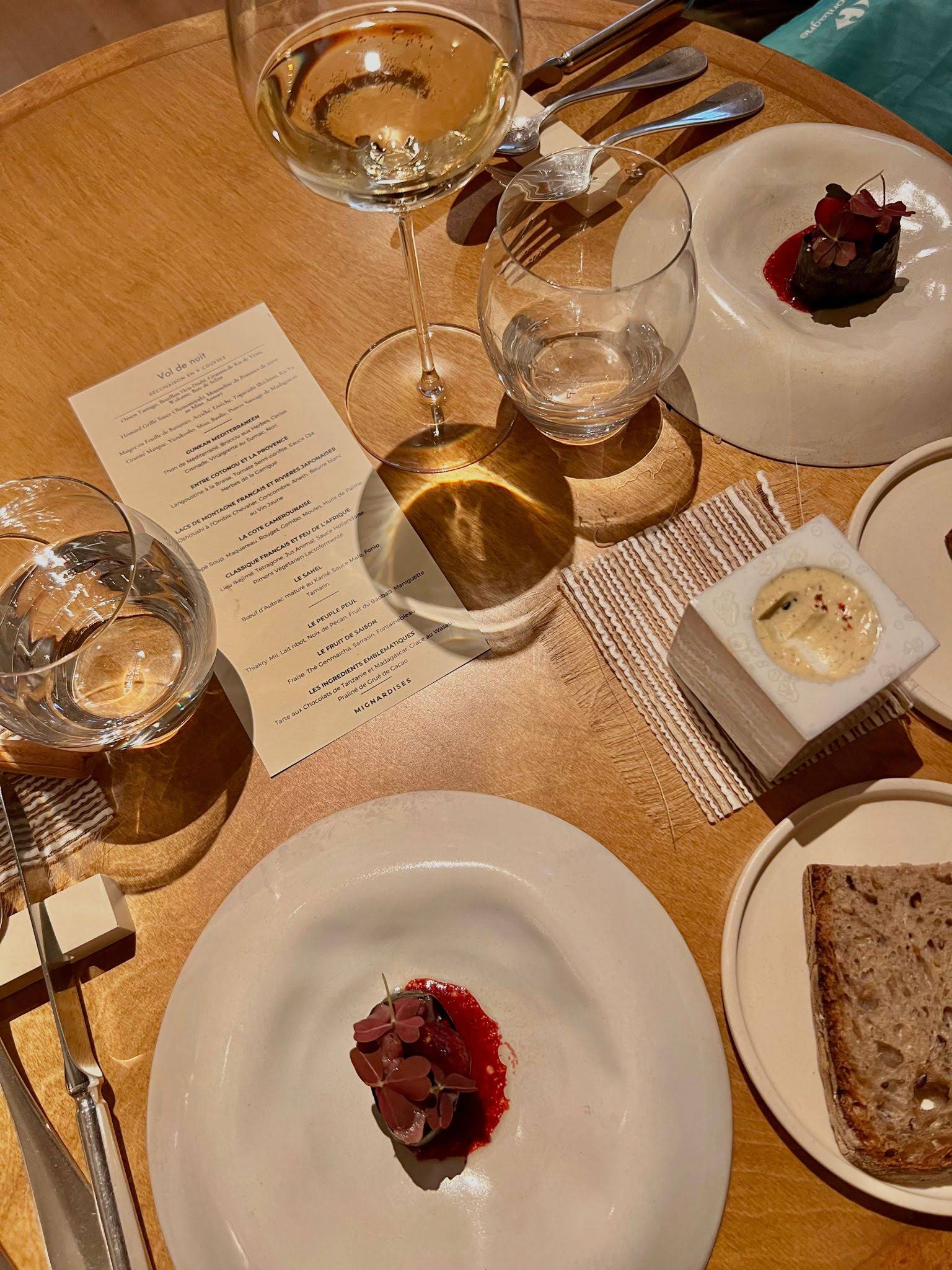 Une attente de 1 an pour enfin y être. Et quand on y est, on mesure la chance que l'on a. Une expérience culinaire unique, le menu Vol de nuit décliné en 9 courses. j'ai refusé de me plier au classement habituel des meilleurs plats, mon palais ne peut être critique vis-à-vis de réalisations aussi complexes mais si parfaites, je connais les ingrédients utilisés leur préparation en bouillon, mousseline, le bœuf de l'Aubrac maturé et j'en passe, mais je ne connais pas d'autres côme le Curry tanzanien, l'huître façon Sugaki, l'Oshisushi et j'en passe encore. Je ne connais sûrement pas cette combinaison de saveurs, je connais les notes mais pas la mélodie. Le dîner était divin. Bravo Chef Mory Sakho.