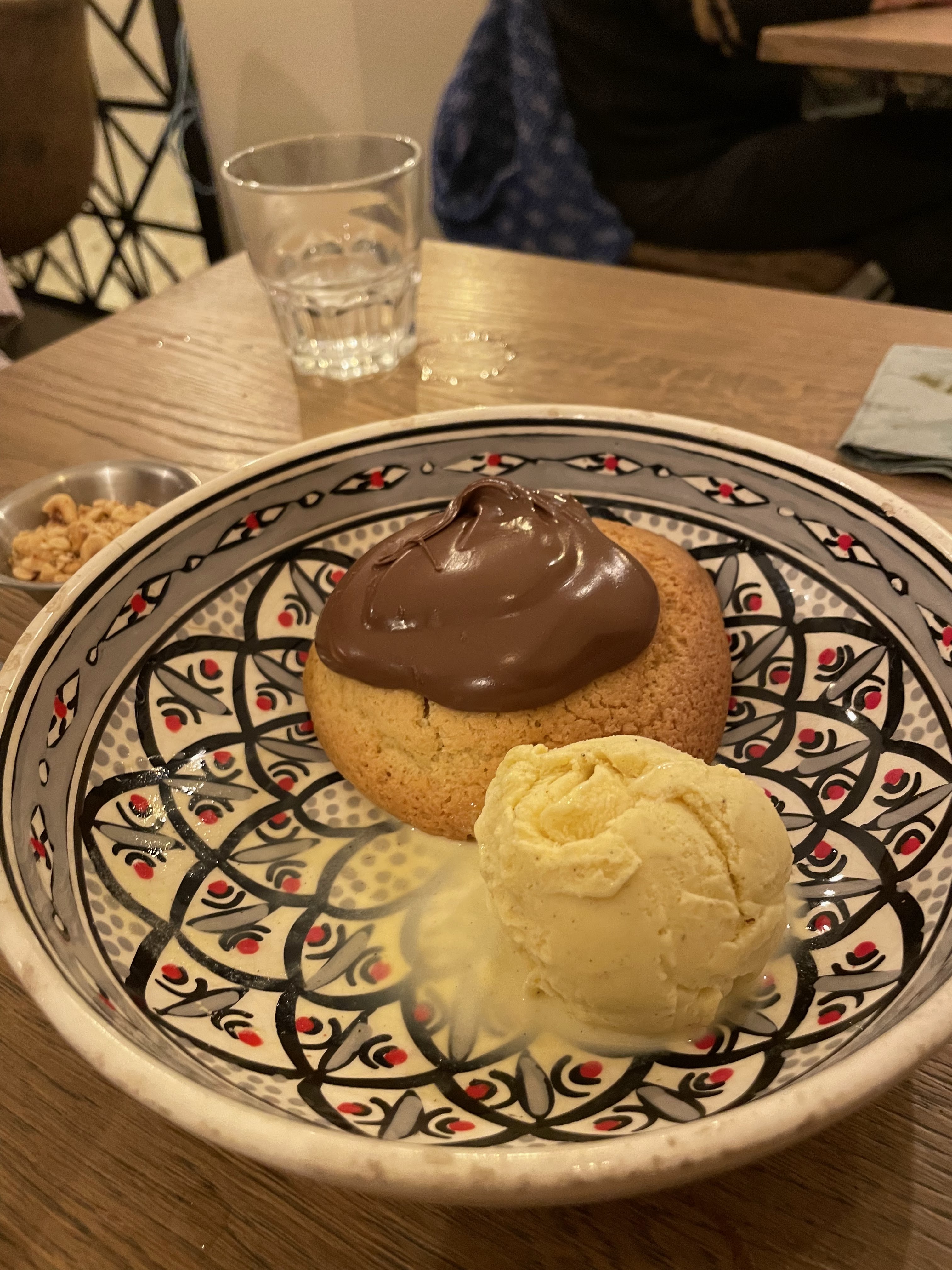 L’entrée et le plat étaient bon avec des saveurs prononcées. En revanche le rapport qualité prix n’y est pas 10€ pour 5 tranches d’aubergines et pas d’accompagnement sans supplément avec le chakchouka (15€) c’est un peu limite. Le dessert est inintéressant: gros cookie avec des énormes cuillères de nutella posé dessus.. Bon service aimable