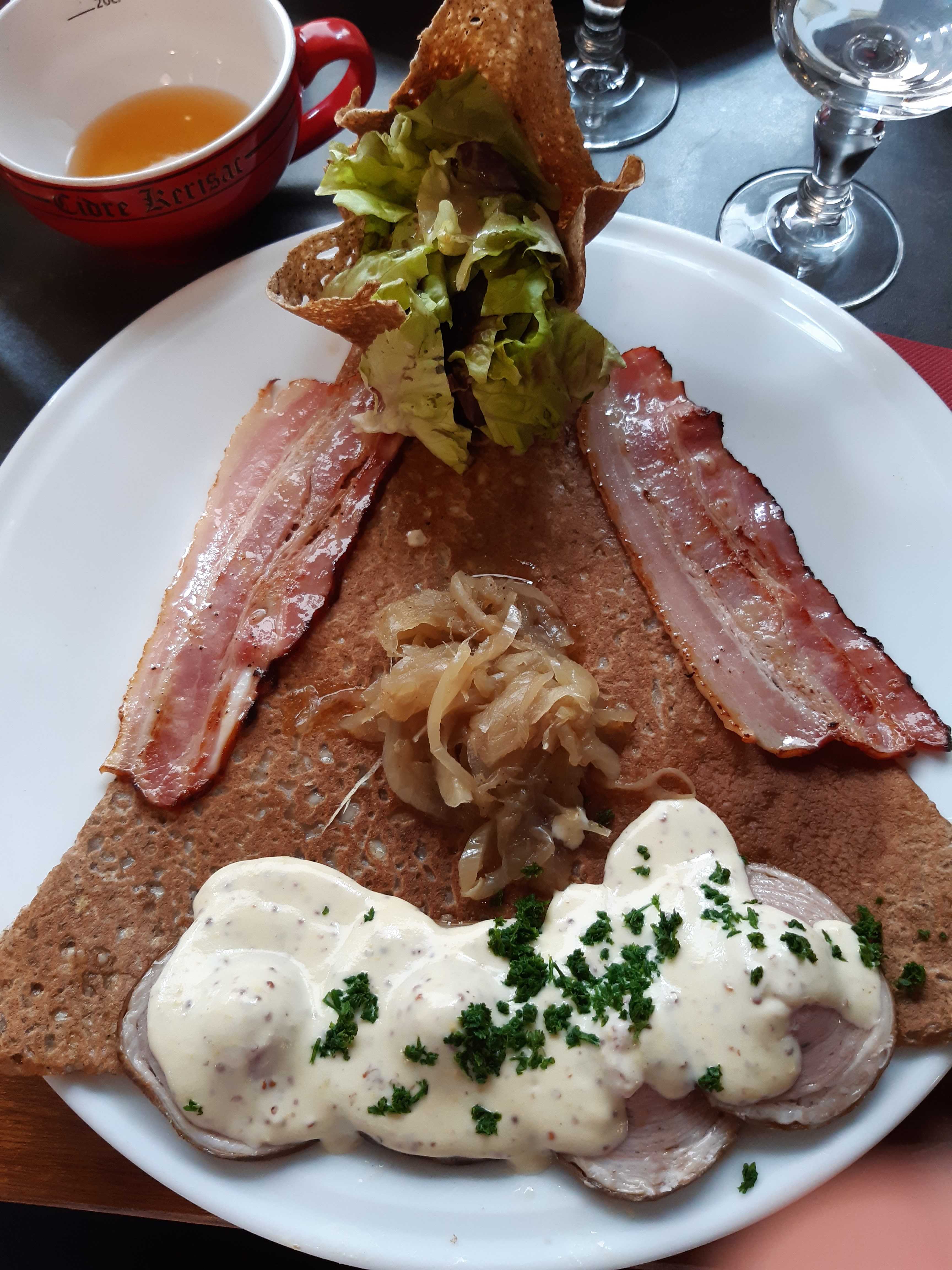 Exceptionnel ! Galette gravelax maison épinards et l'autre Gillet mignon confit au cidre et pommes de terre sautées ! Les meilleures qu'on ait goûté en Bretagne