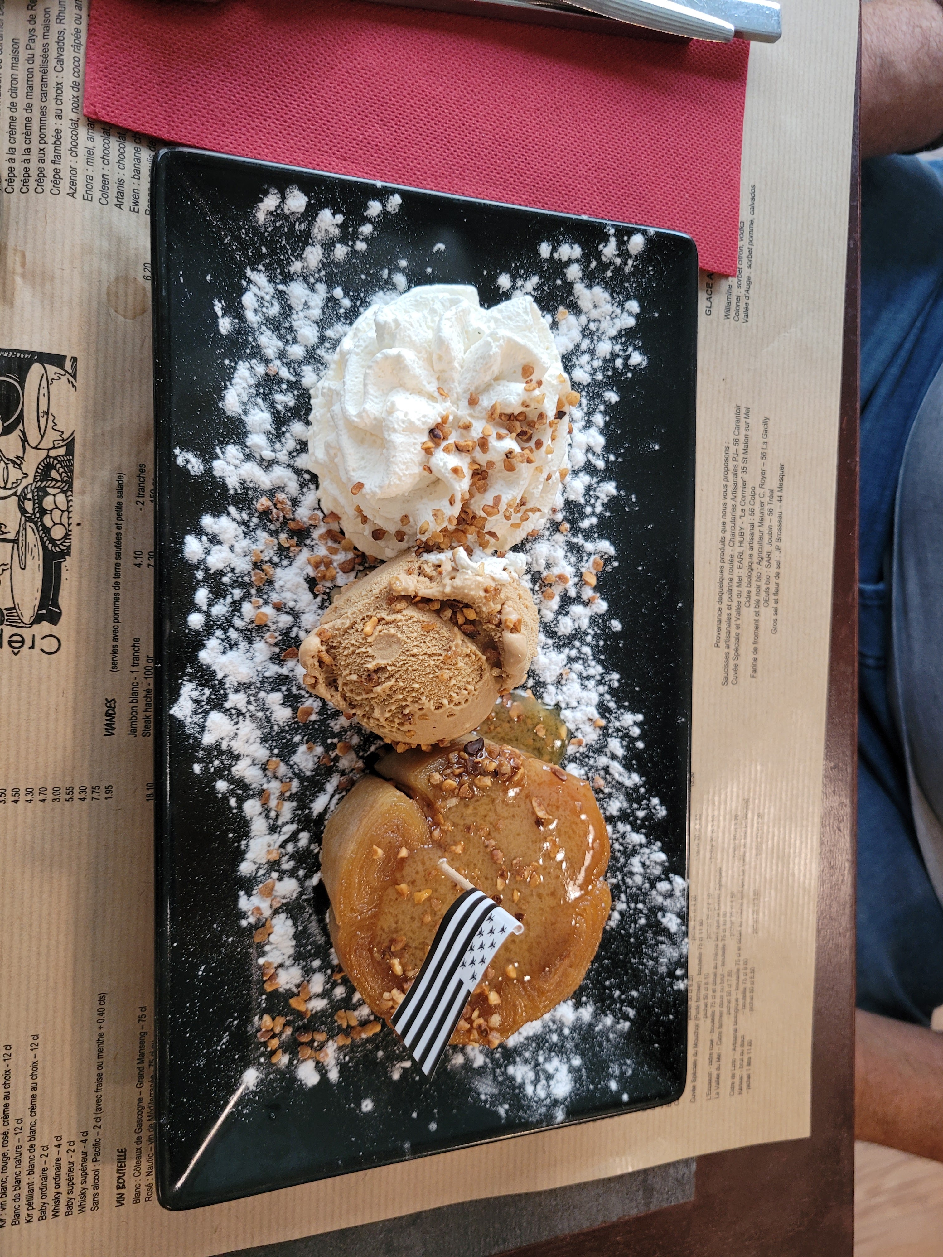 A chaque fois que je viens dans le coin , je viens me régalée ici ( le dessert en photo une turie ) , c’est mon passage obligatoire et je vous recommande cette crêperie et de belles choses a visiter dans cette ville la Gacilly ( expo photos , yves rocher et une boutique de macarons excellent)