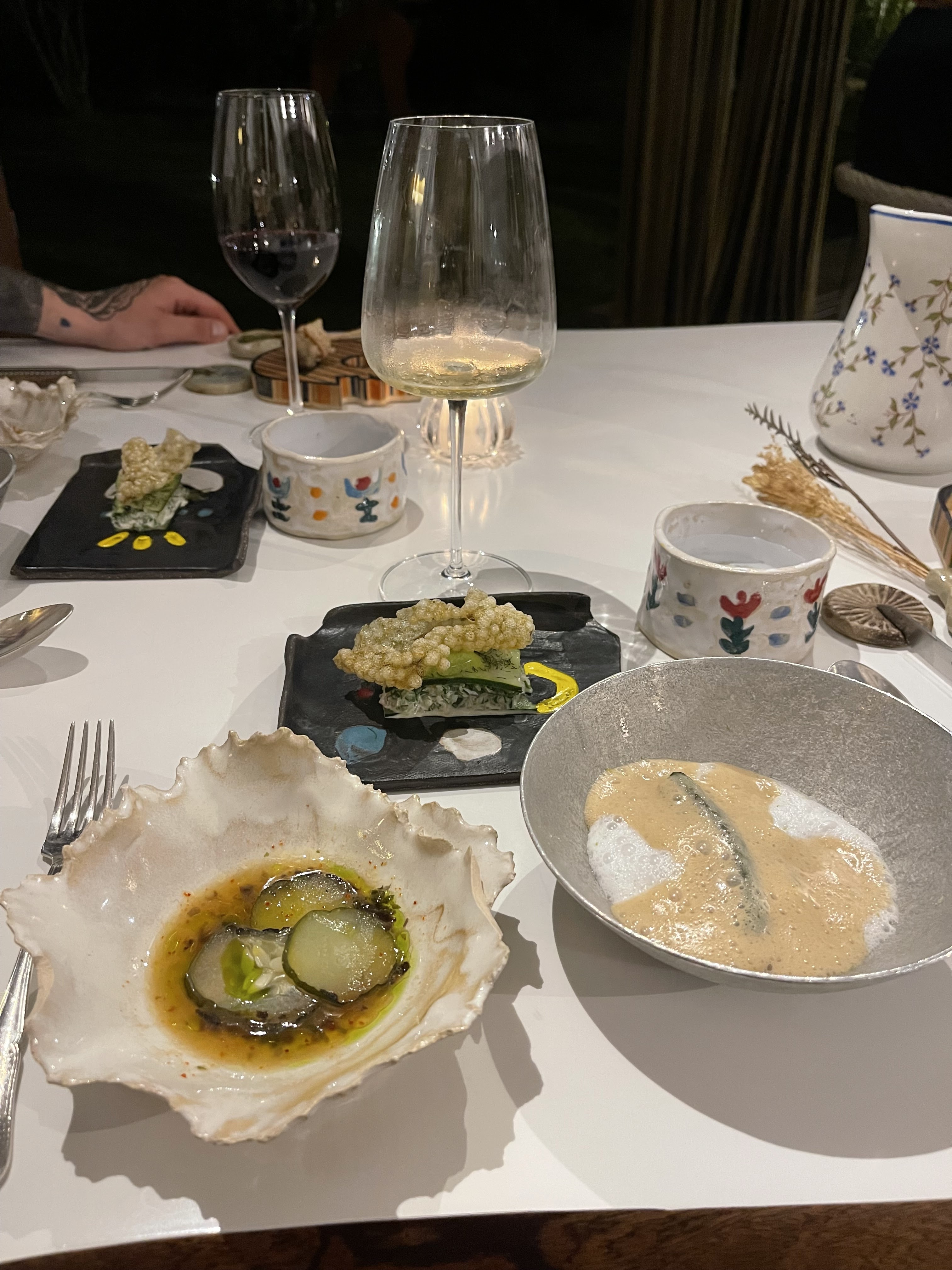 Menu végétal délicieux. Les plats sont très créatifs et travaillés. Chaque assiette explore des saveurs bien distinctes alliant parfaitement harmonie et contraste entre les ingrédients. Le vin naturel qui nous a été conseillé etait très bon et à un prix raisonnable.