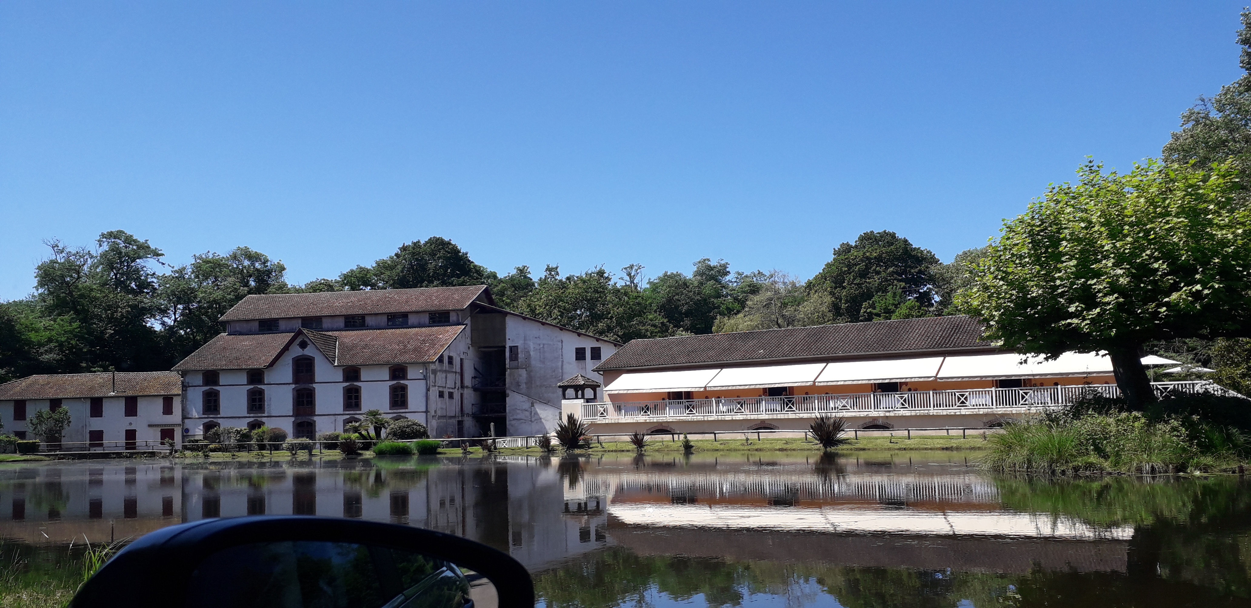 Moulin typique des Landes avec restaurant et lac juste à côté.