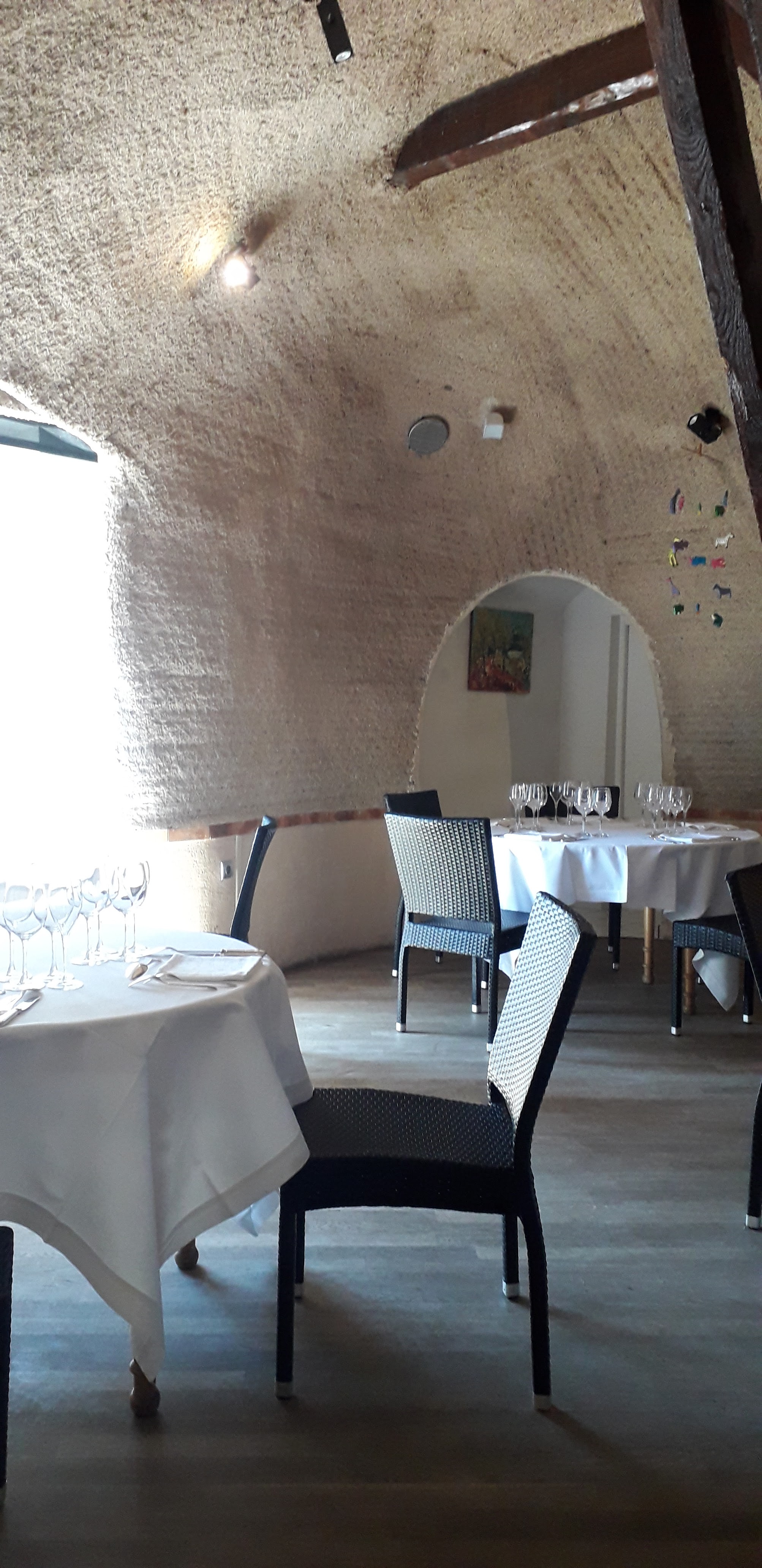 Restaurant à l'atmosphère assez atypique avec une grande salle avec poutre apparente et une architecture originale. Très bien accueilli et service aux p'tits soins. Des amuses bouches de qualité et un p'tit potage excellent qui vous ouvre l'appétit. Entrée foie gras mi cuit bien copieux, p'tite confiture de figues, gros sel et poivre, un régal Un plat exquis, un bar avec des légumes savoureux et fondants. Sauce très bonne. P'tite déception pour le dessert qui est vraiment très fourni au chocolat mi chaud mais un peu trop cuit pour la croûte. Le repas est à la hauteur des 85€ le menu. C'est gastronomique gourmand et vraiment bien rempli. On a passé un très bon moment gustatif. Merci