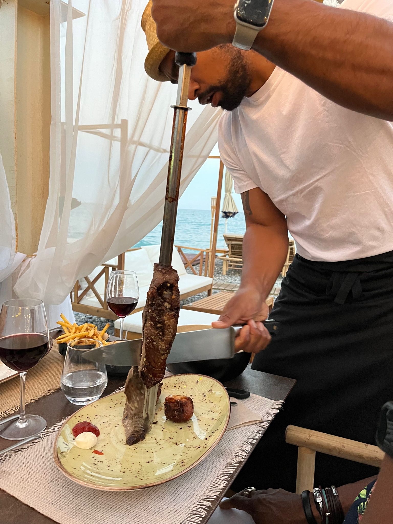 Nous étions heureux d'avoir trouvé cet endroit! Les prix des chaises de plage pour cette partie de la plage sont corrects à 15 €/par personne (pas comme d'autres autour d'un minimum de 25 €/par personne). Nous y sommes allés trois fois et avons apprécié le déjeuner une fois et le dîner une fois ! Un excellent repas non seulement à l'oeil mais aussi au goût ! Super endroit, personnel super sympa et attentionné, musique cool. Tout est ici !