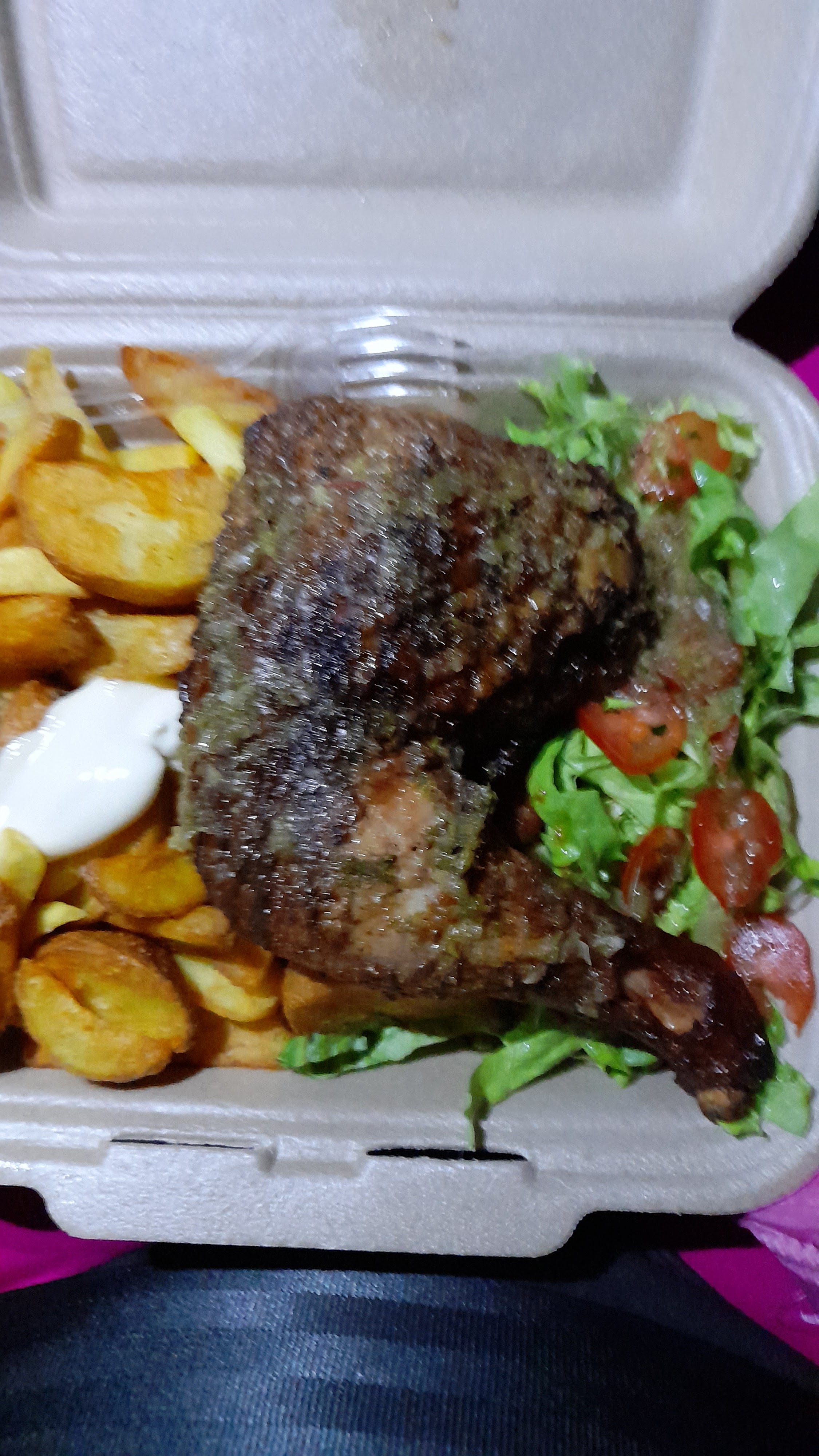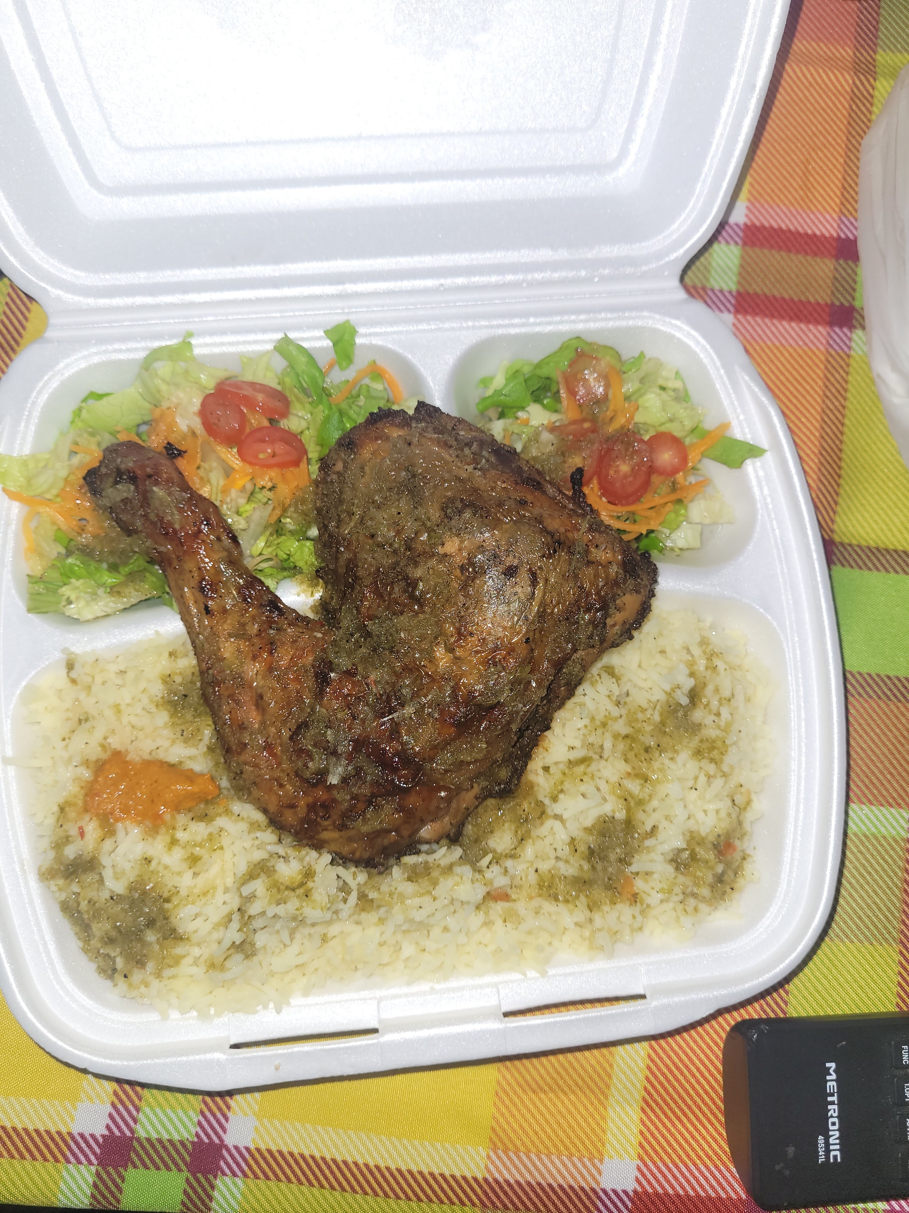 Plats trop bon 🤤🤤 j'ai pris une aile de dinde boucanée, du riz (avec une sauce chien 🤤) et des haricots rouges, ma fille a pris une cuisse de poulet boucanée et des frites Plat bien servis et prix abordables