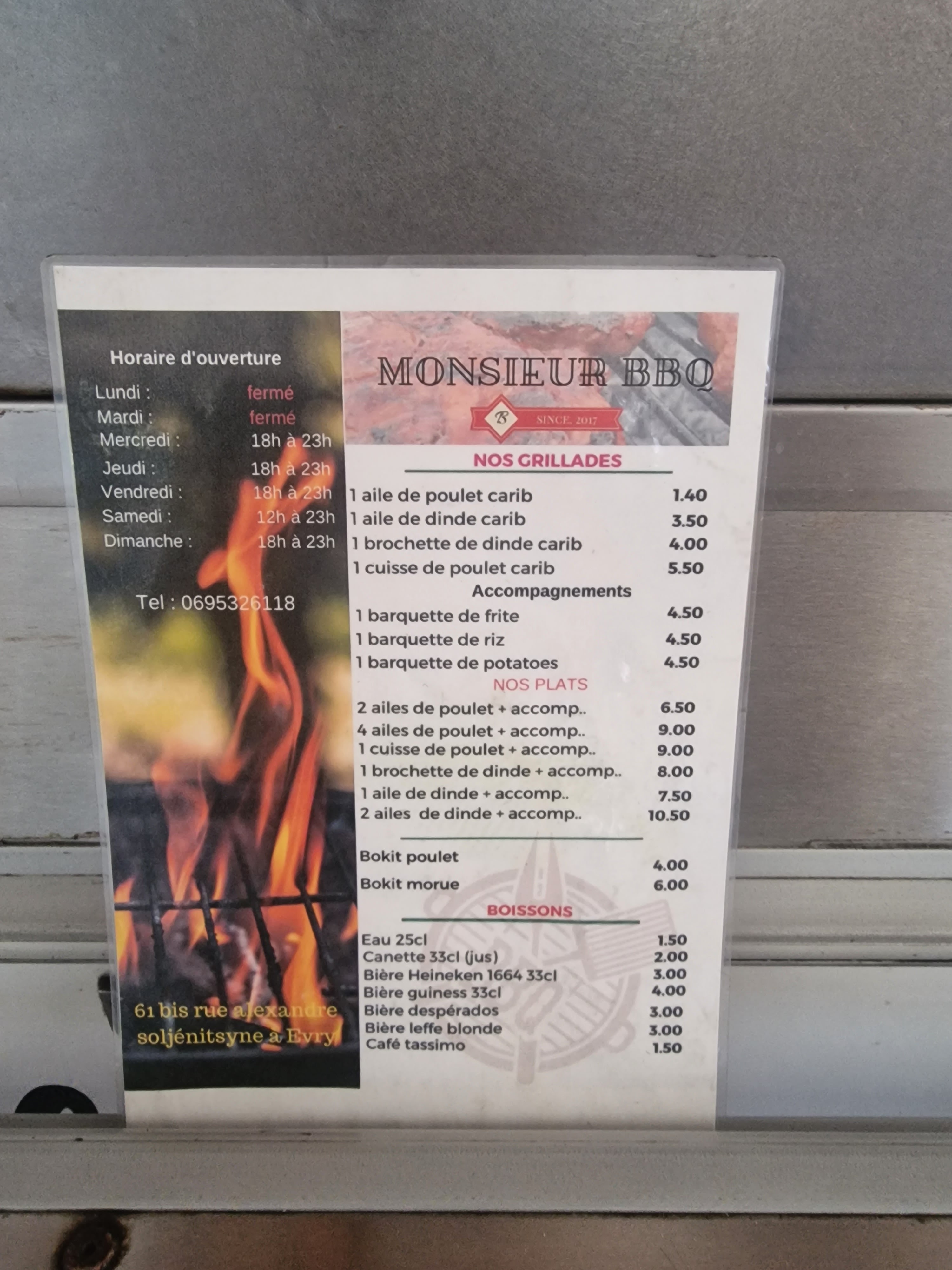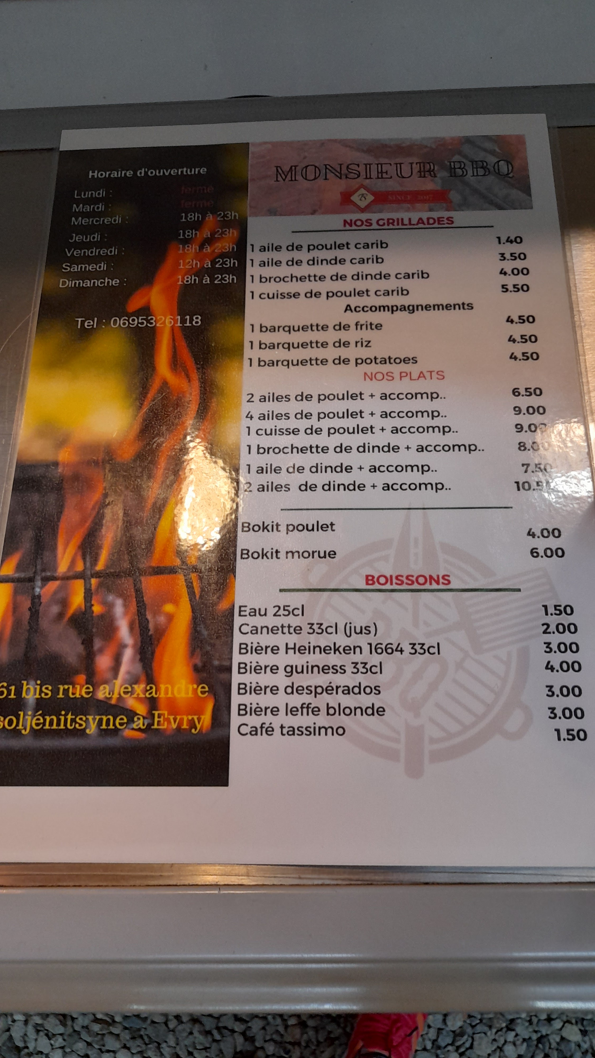 J’ai testé Mr bbq hier lieu originale et hors du commun , une carte au menu clair et précis et le chef est présent pour répondre à toutes les questions, accueil au top , ayant pris un plat à emporter la barquette est bien garni et pratique donc adapté pour les transport . Je serais bien rester sur place car l’ambiance y est paisible ce seras pour une prochaine car j’y retournerais avec plaisir . Je le recommande ps: le petit frigo sur le comptoir un peu plus fruité serais un plus 🤜🏾🤛🏾 bonne continuation et à bientôt.