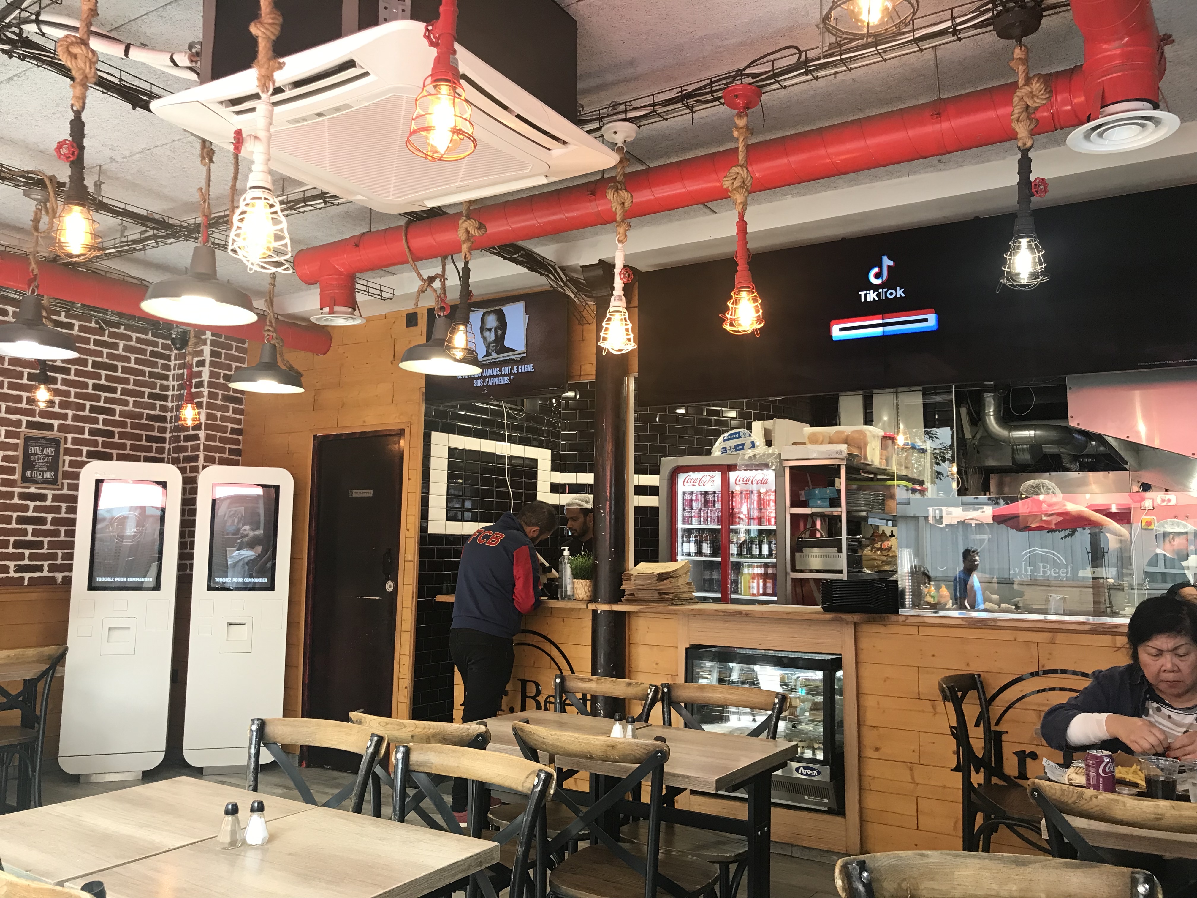 Endroit très sympa vous pouvez commander sur un tableau vous recevez votre ticket vous le donner au serveurs il vous donne un alerte quand votre plat est près votre alerte sonne et vous pouvez allé chercher votre plateau repas et vous assoir où vous voulez . Pris raisonnable.