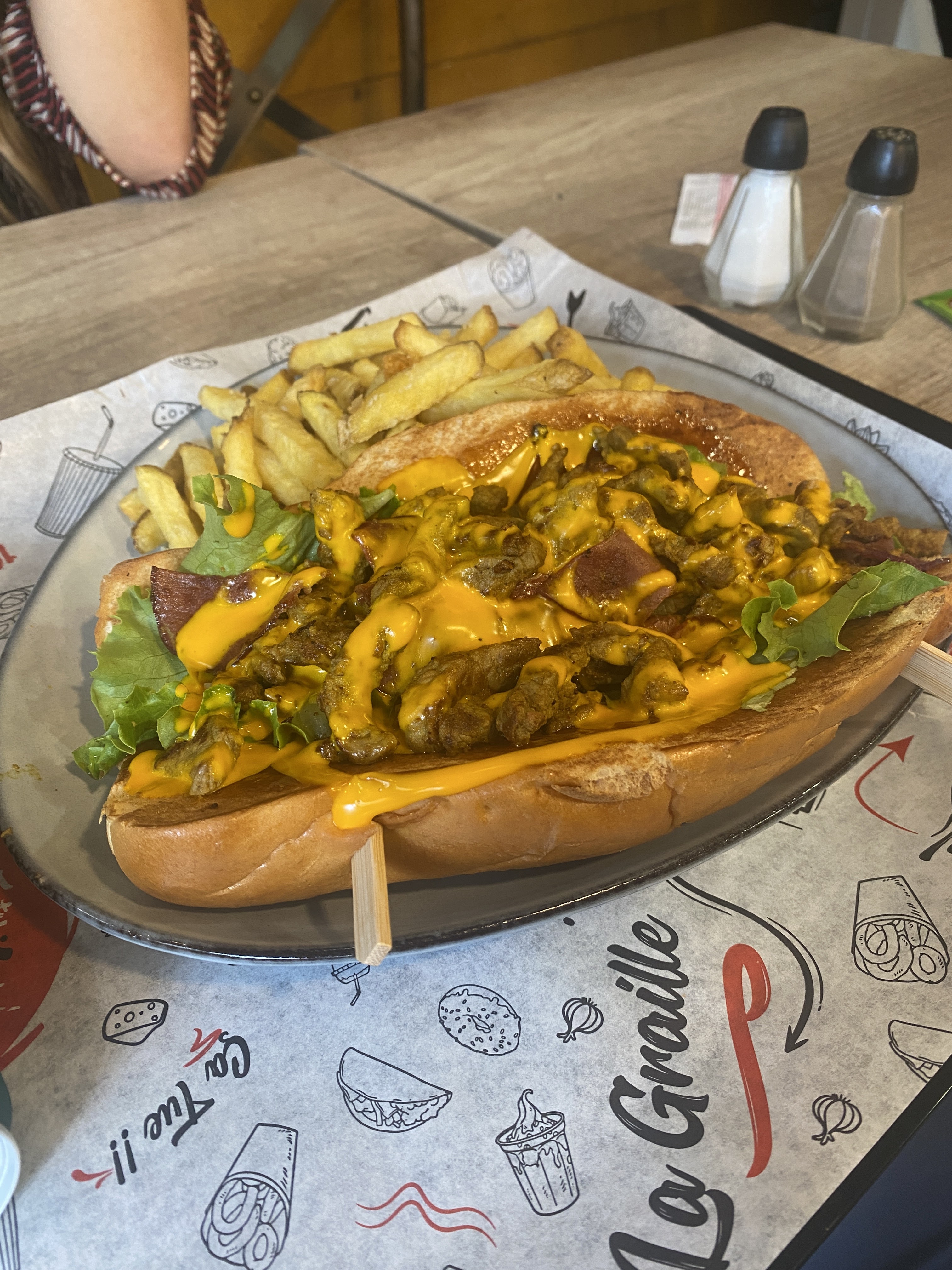 Restaurant sympathique avec beaucoup de choix. J’ai pris le sandwich Philly’s Classic avec émincé de bœuf. C’était pas mal, mais j’ai pas compris pk il y avait du curry dedans. L’accompagnement j’ai pris des frites maison, elles étaient bonnes. Sinon ambiance moyenne c’est petit et bruyant.