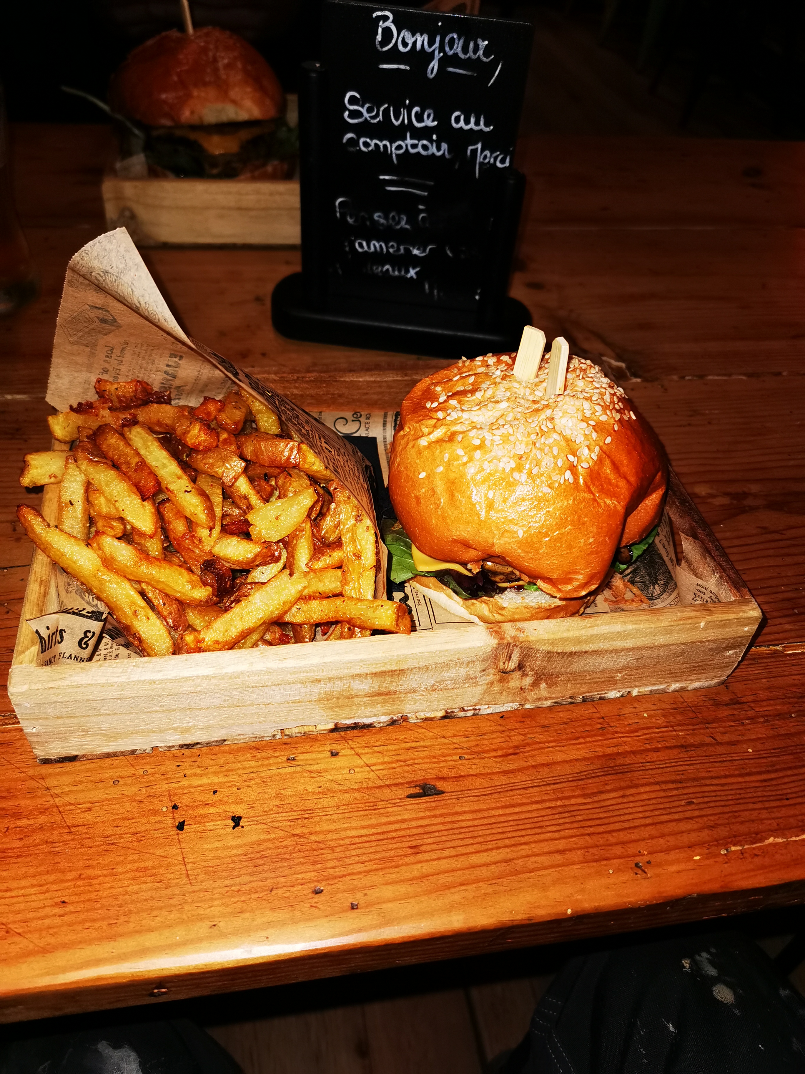 Service au comptoir très sympathique et professionnel. Ambiance sympa, musique rock/reggae Frites succulentes, burgers très bon, un peu petit pour le prix, mais je n'ai pas pris les doubles