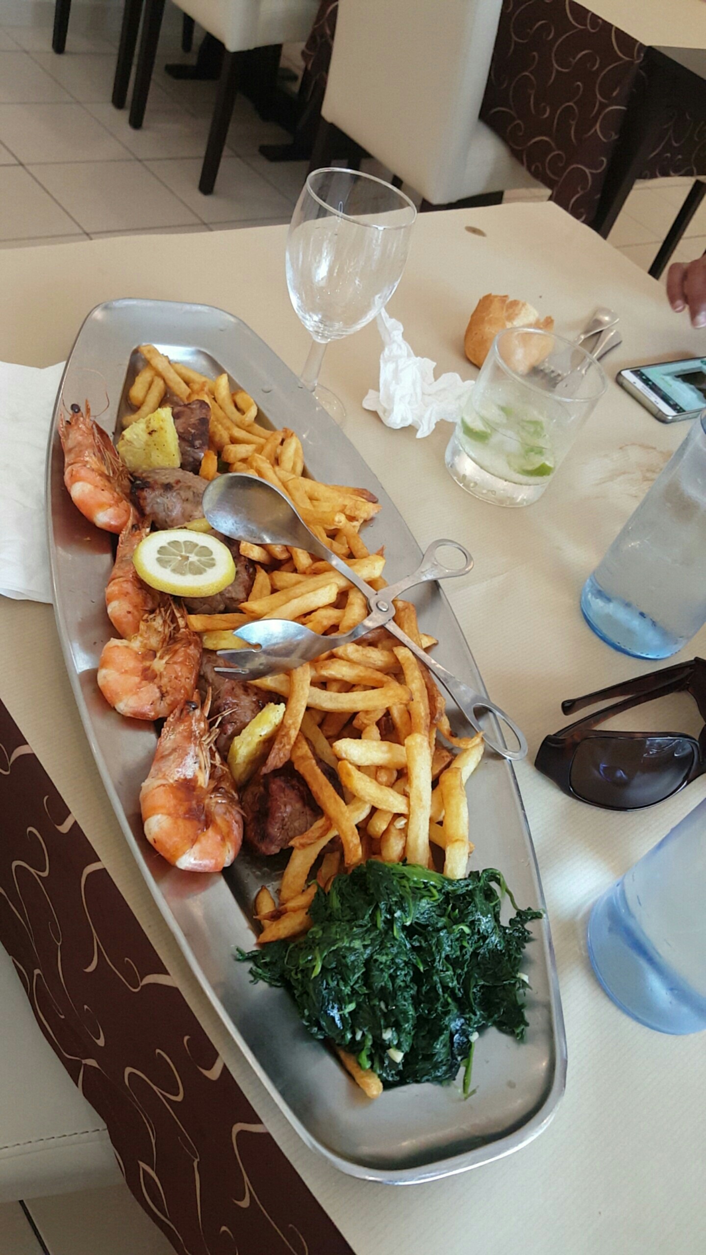 Dans l'ensemble tout est gras, les frites sont molles, la viande est sèche (travers de porc) et les épinards surgelés sont sans saveur. Le seul point positif c'est la générosité des portions. Mes amies qui avaient pris des pateis en dessert leur ont trouvé un goût de poisson??! Je n'ai pas été déçue par la glace ni par l'apéritif, généreusement servis.