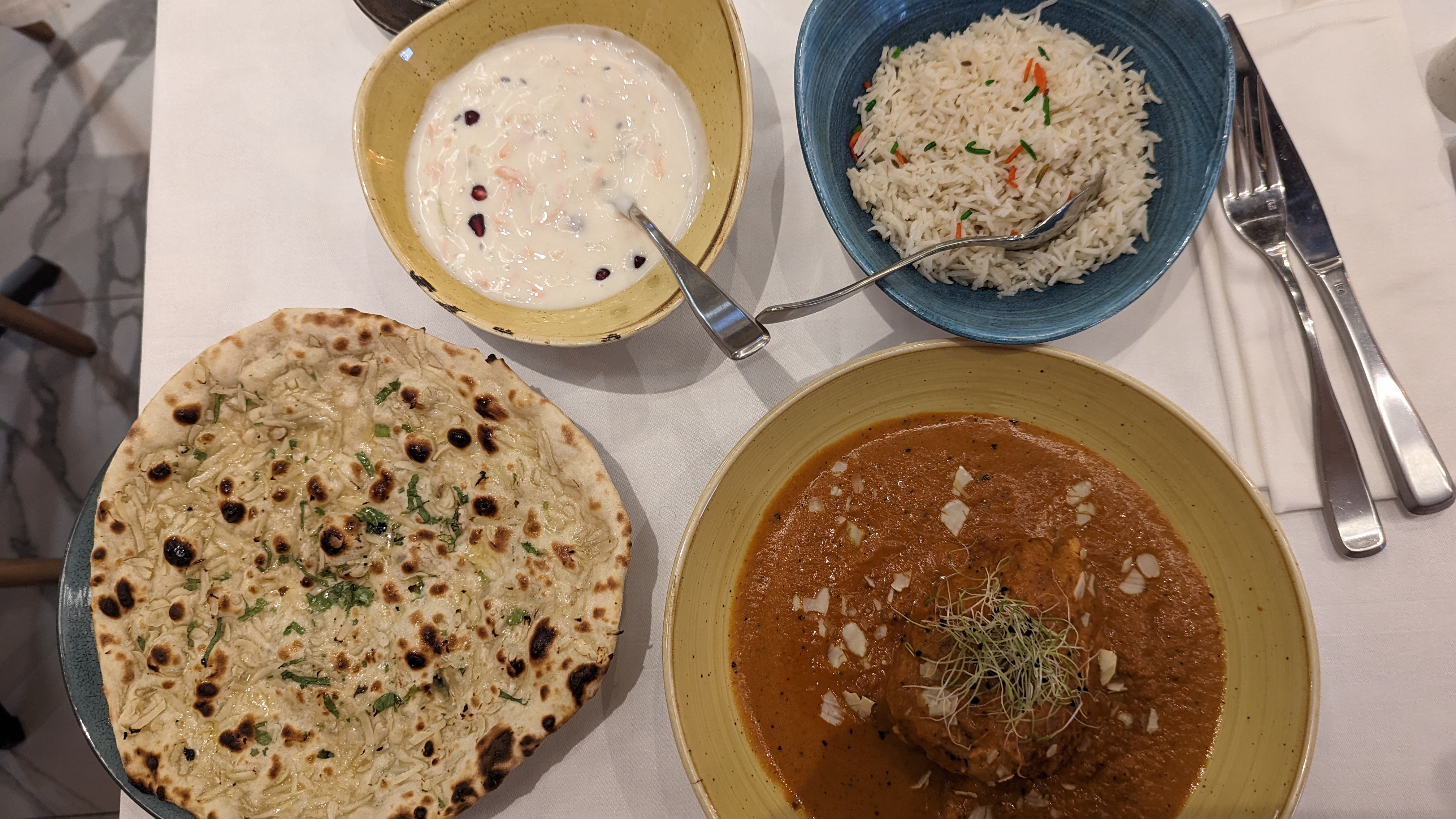 Belle présentation. Ameublement moderne. Très bonne nourriture. Poulet au beurre, naan à l'ail, riati. Excellent