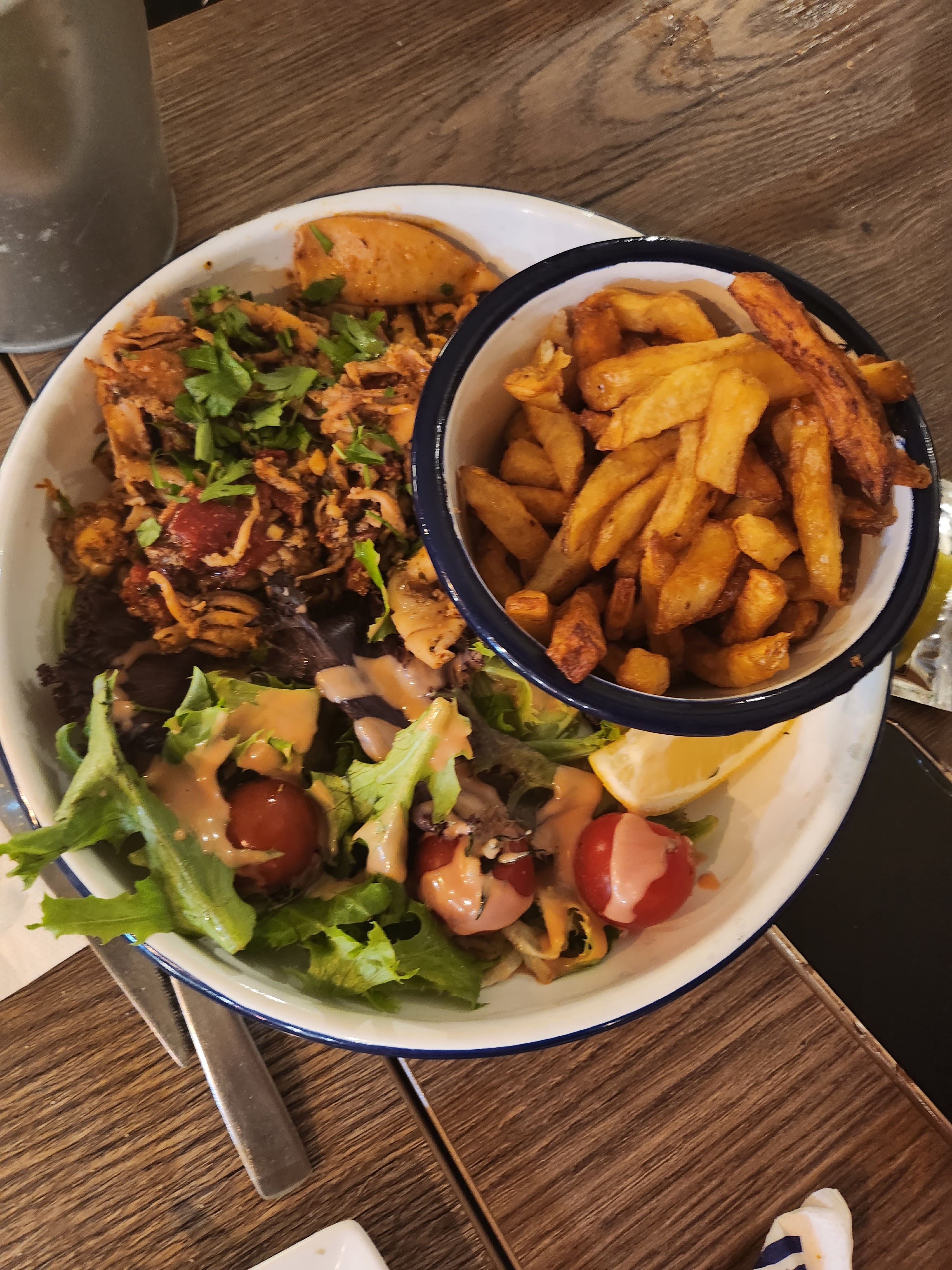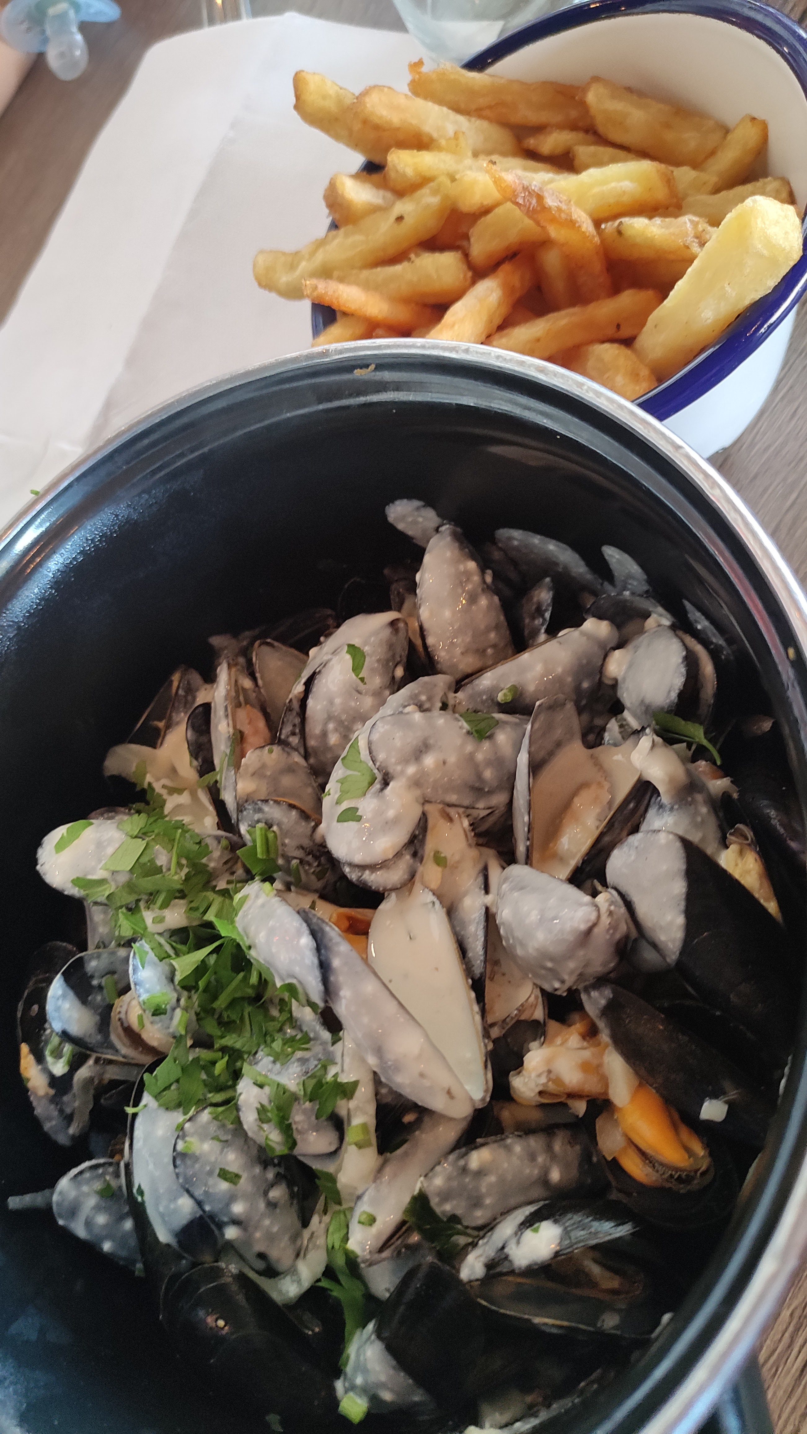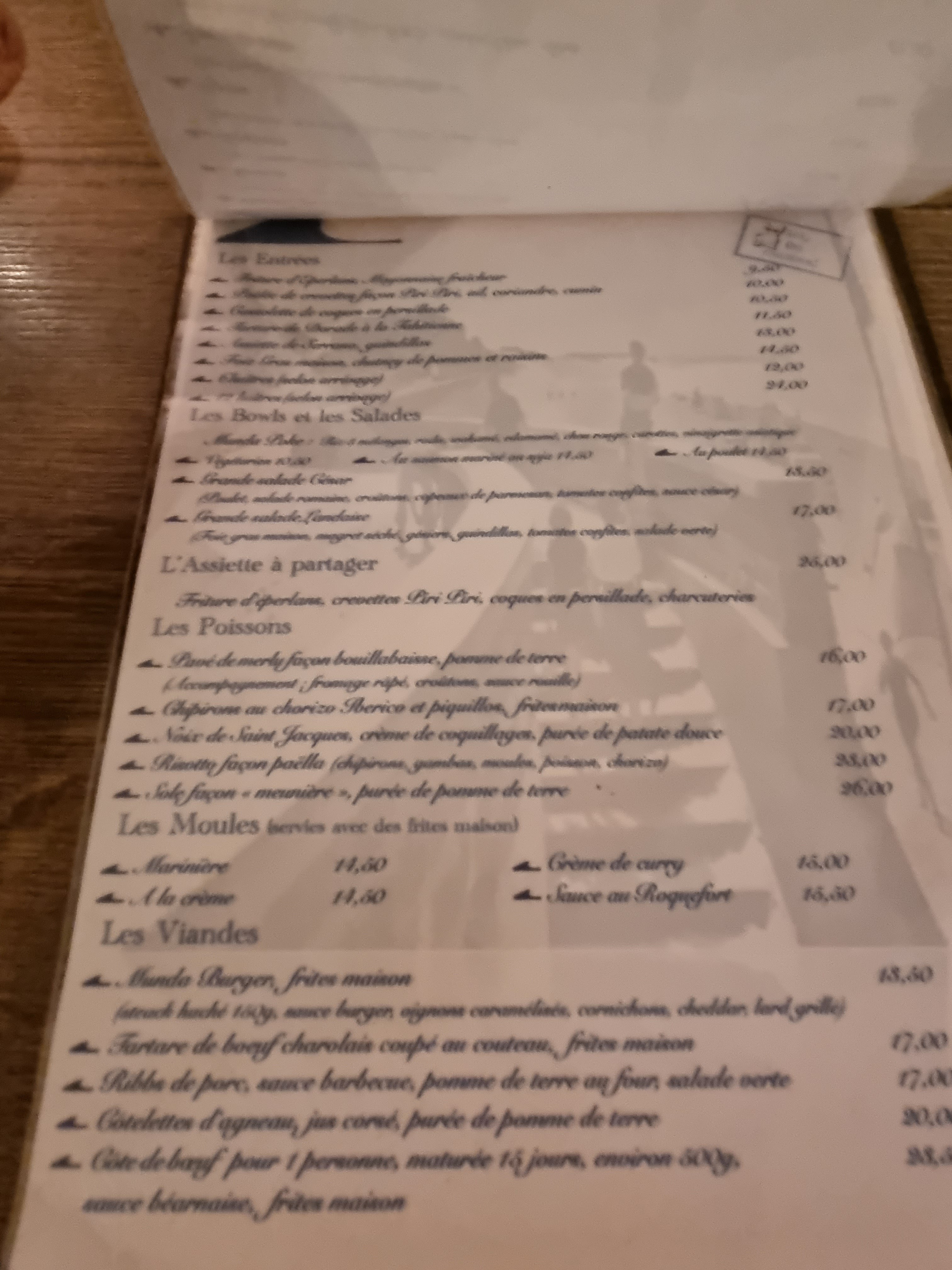 Pizza pas assez cuite , caoutchouteuse, collante au palais. Peu de garniture. Moules étaient sèches, pas de goût. Pas pris de dessert. Nous avons demandé plusieurs fois une carafe d'eau , on ne l'a jamais eu, il n'y avait pas grand monde pourtant. Je n'y retournerai pas.