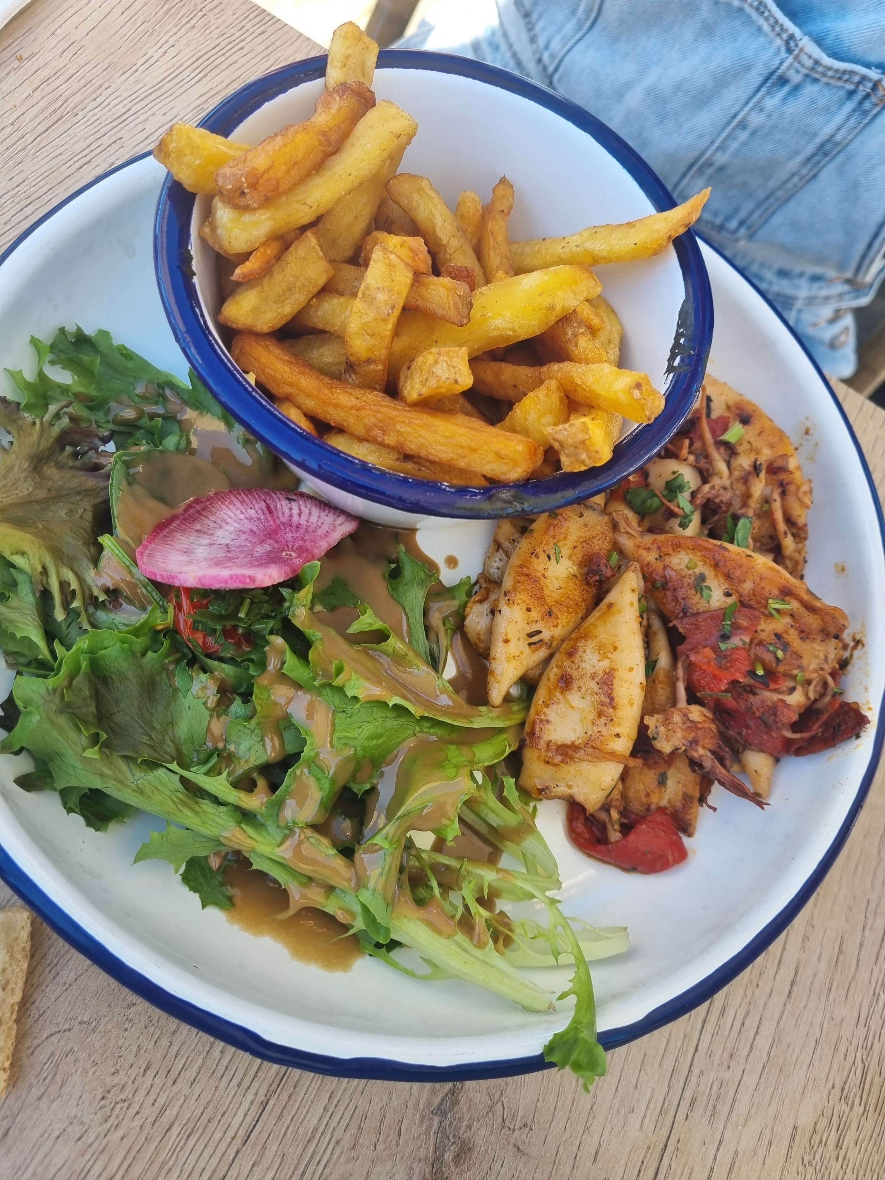 Chipirons & chorizo & frites = le bonheur! Jolie terrasse surplombant l'océan.