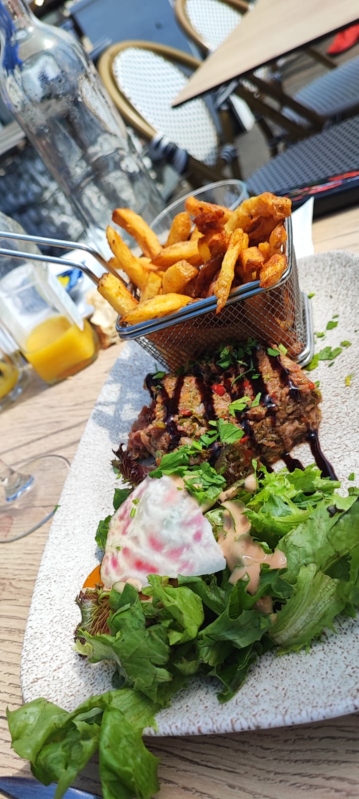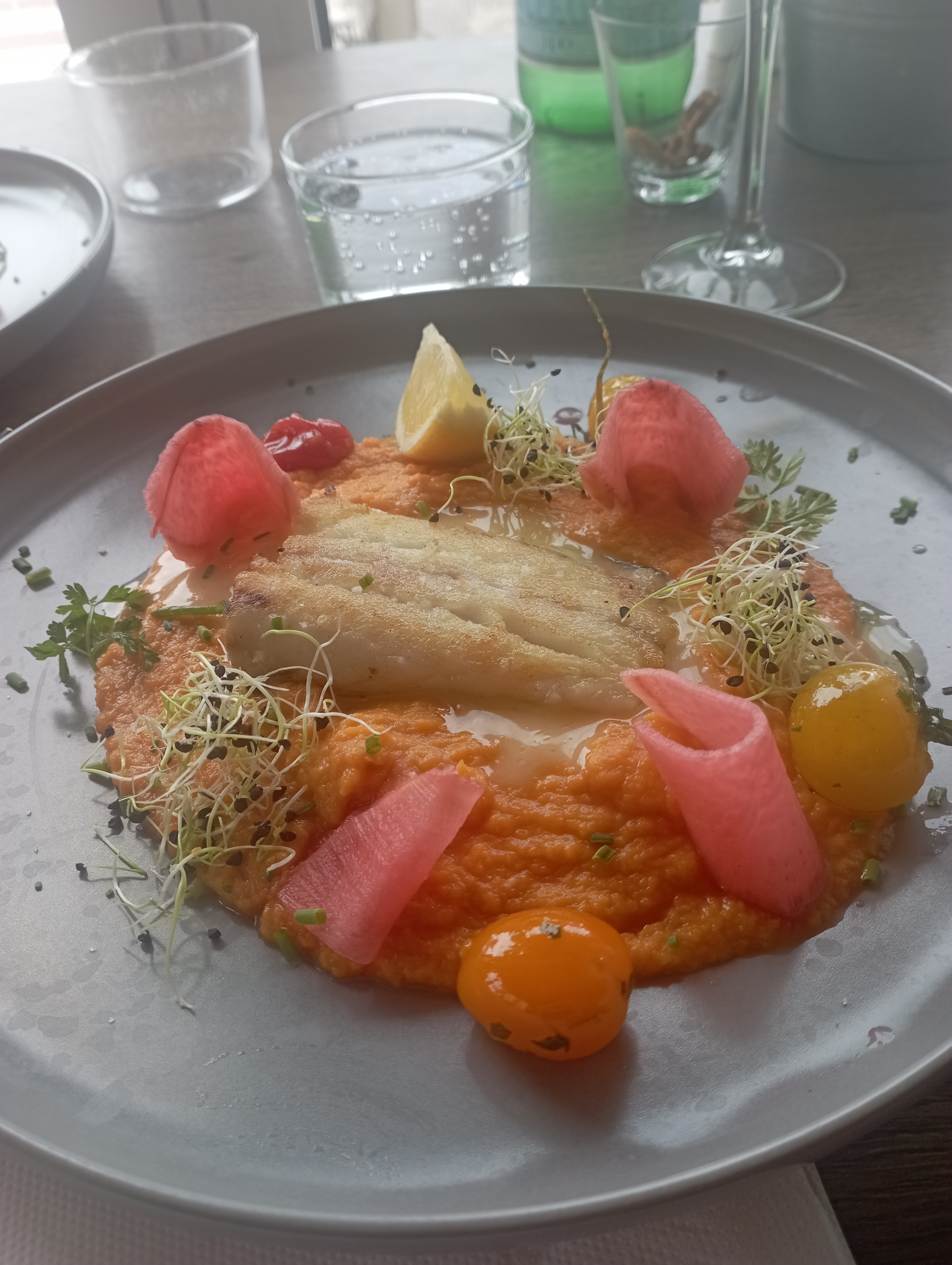Terrasse agréable, personnel agréable également. Plat joliment présenté avec de belles couleurs et de la nourriture de qualité.
