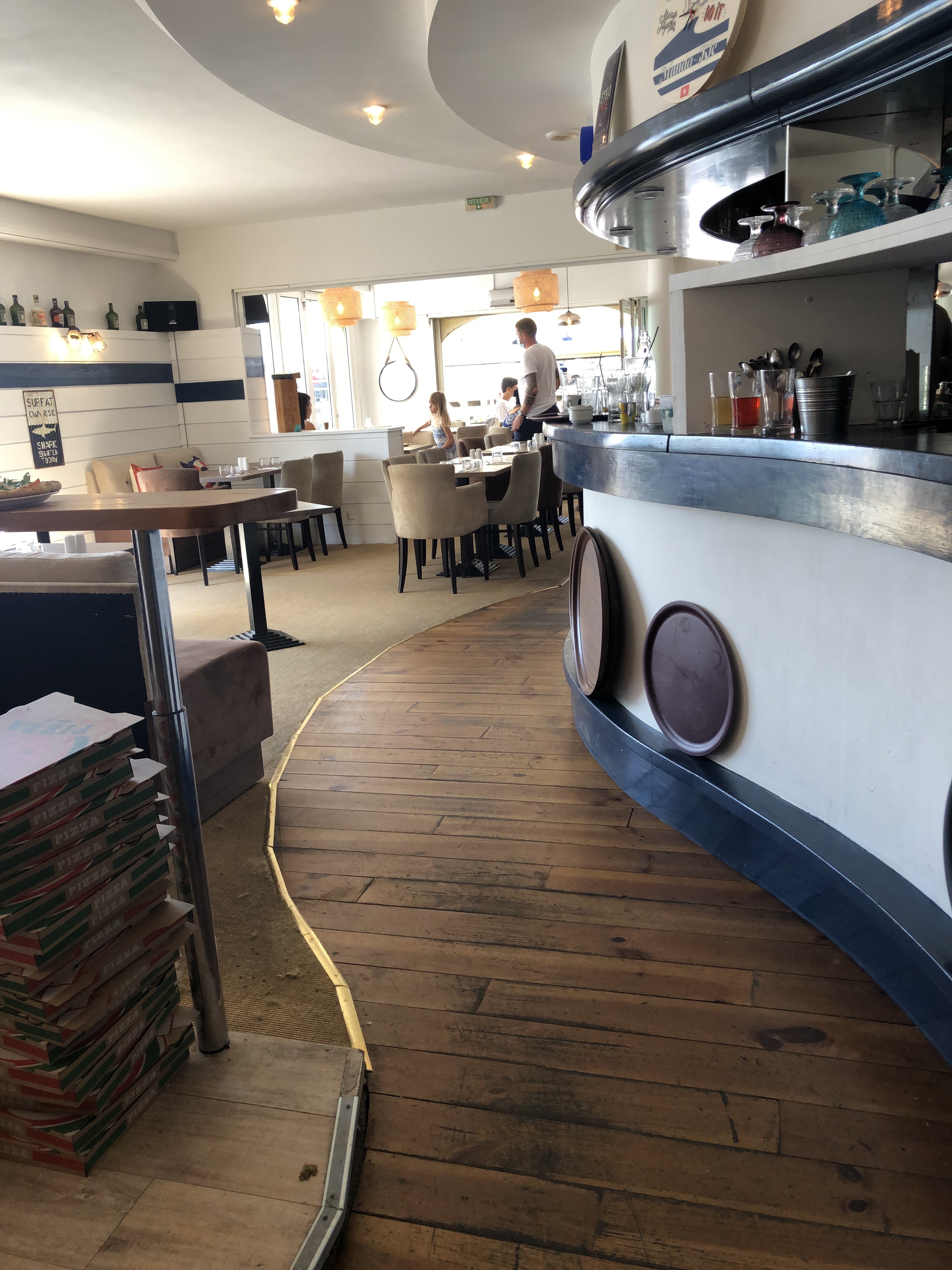 Restaurant sur le bord de mer . Accueil très agréable à l'extérieur , nous entrons un peu surpris sur un sol recouvert de sable , le temps ne permettant pas de déjeuner en terrasse , nous avons donc déjeuné à l'intérieur , nous avons pris le menu du jour , moules aux piquillos , merlu patates douces , riz au lait caramel , le tout excellent pour un prix raisonnable . Prochaine visite , on essaie les pizzas maison.