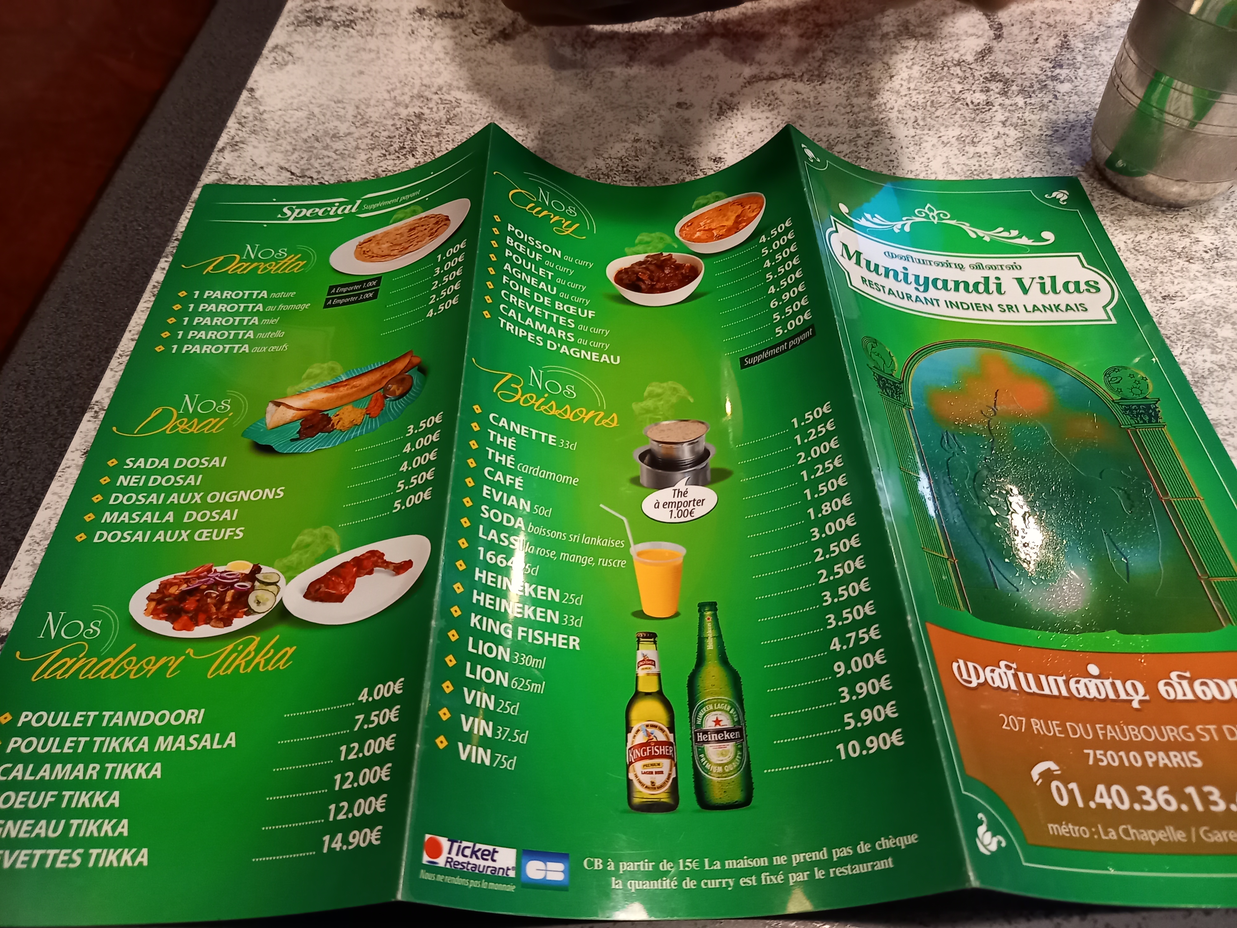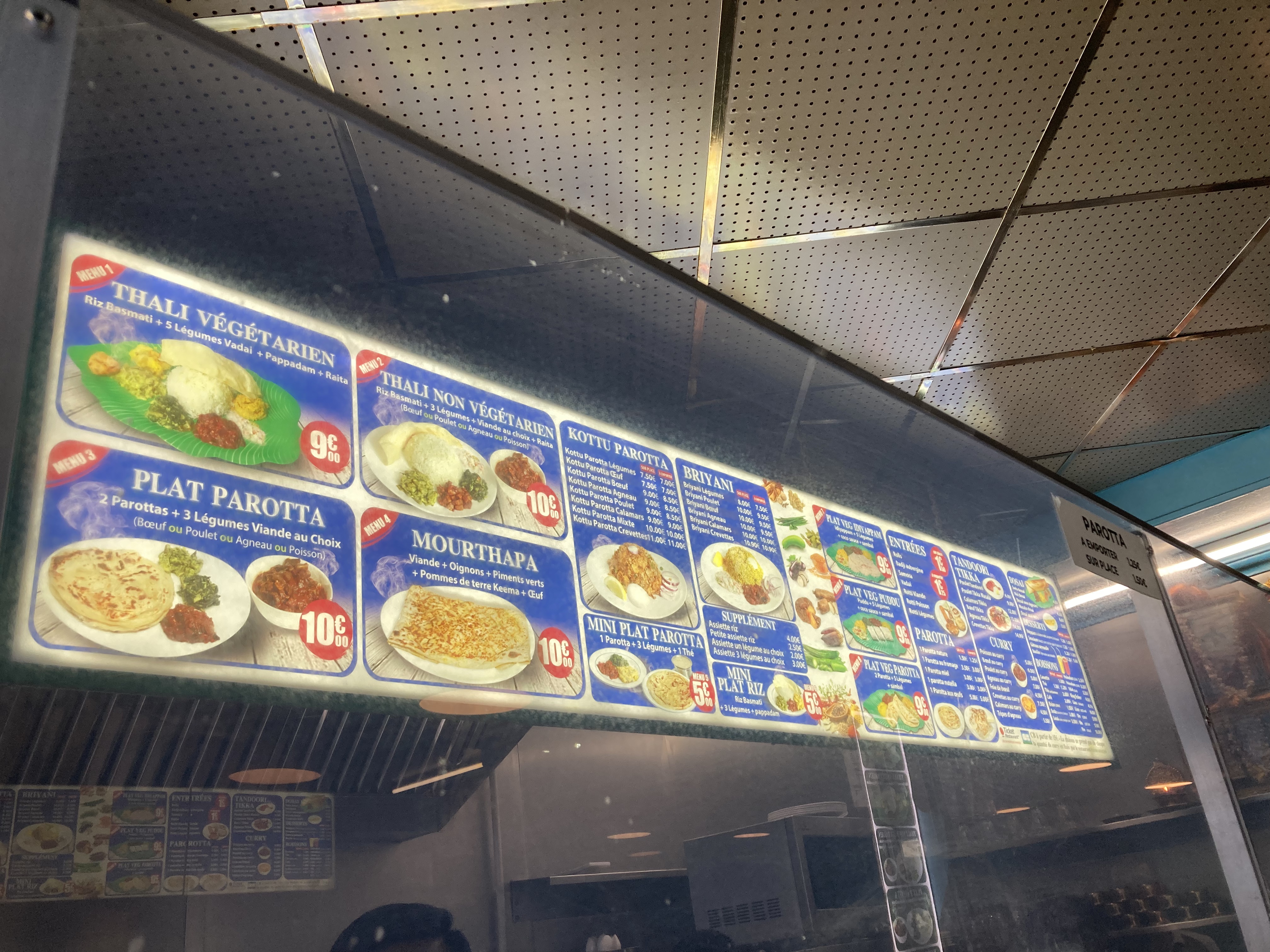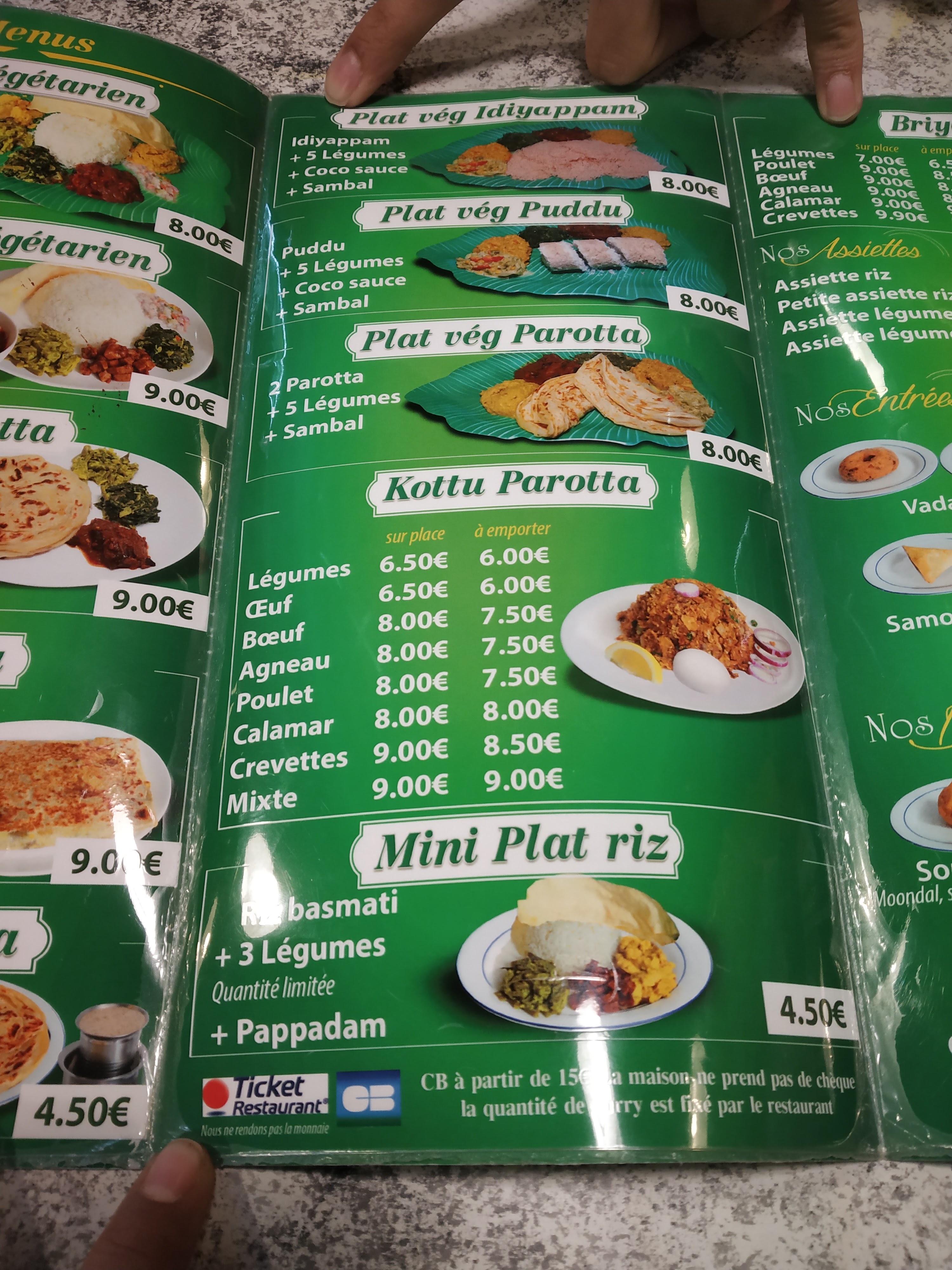 Une bonne ambiance dans le resto seul problème, il est trop petit. Pas de place pour manger sur place, les assiettes sont grand donc pas de place aussi pour mettre sur la table (si on achète plusieurs choses à manger). Je vous recommande pas le biryani à l'agneau, c'est vraiment pas bon limite jamais goûté un truc pareil. Mais le biryani au poulet était bien. Tant dis que les parrota et les kottu rothi sont très bon.