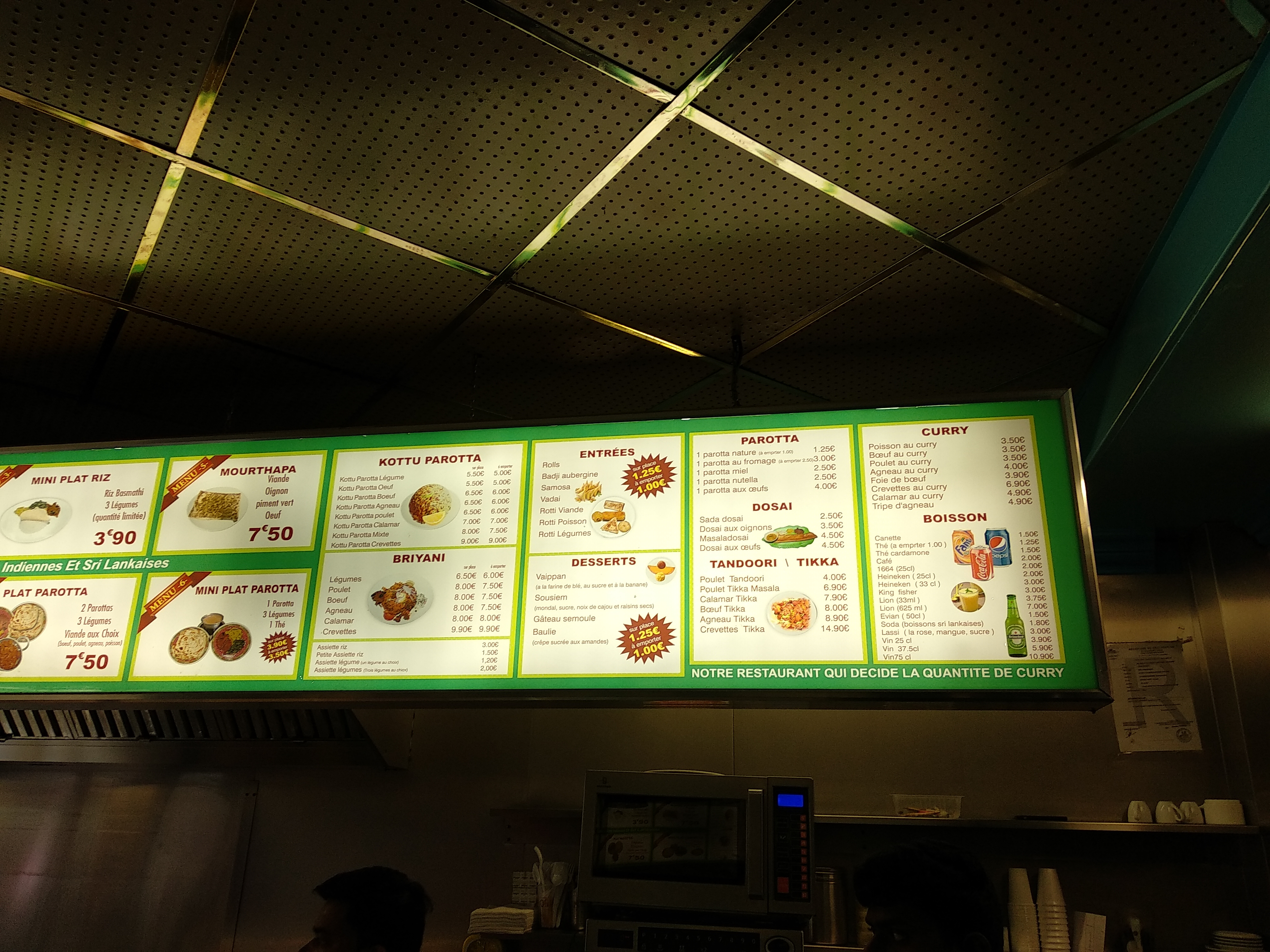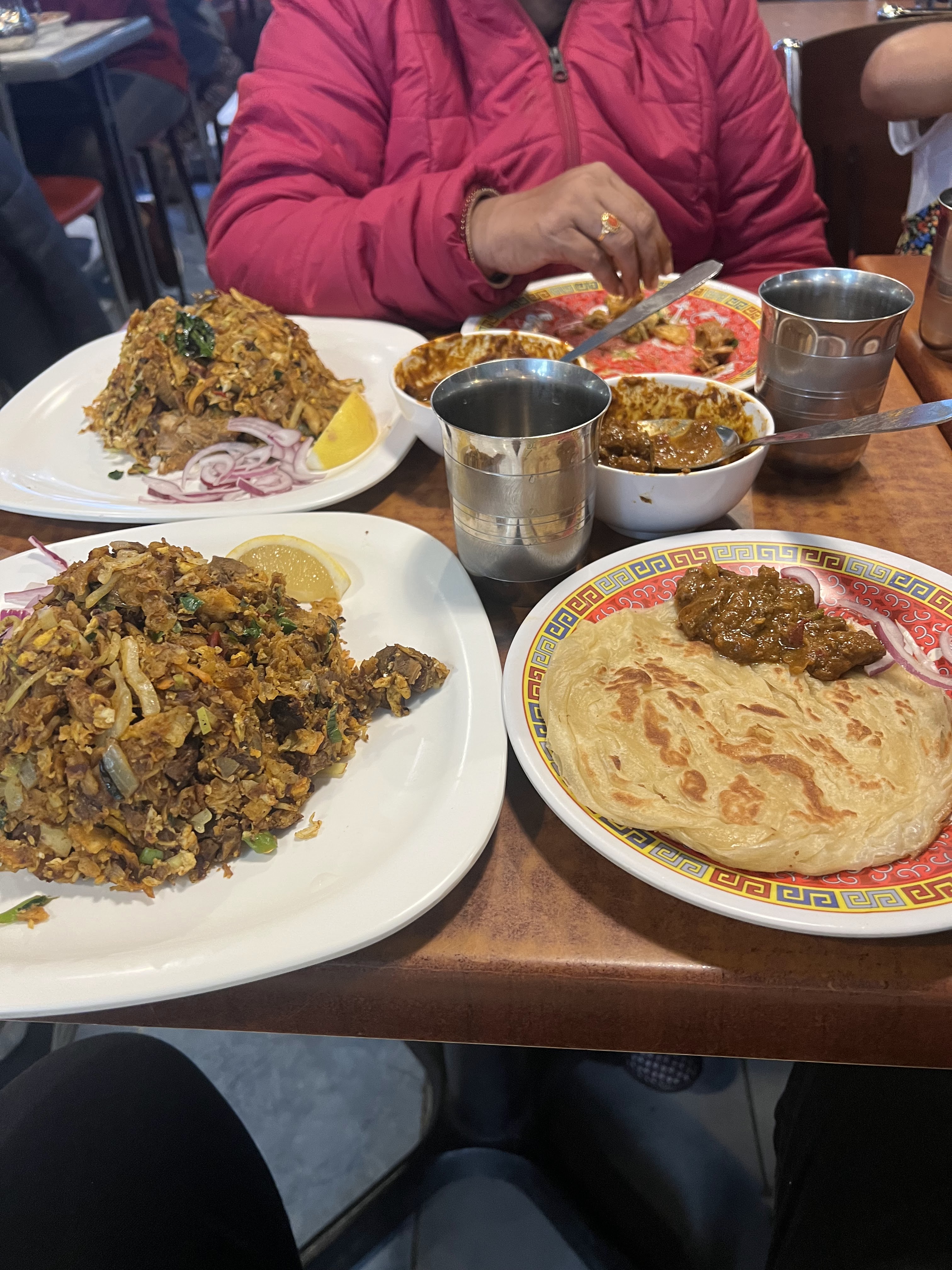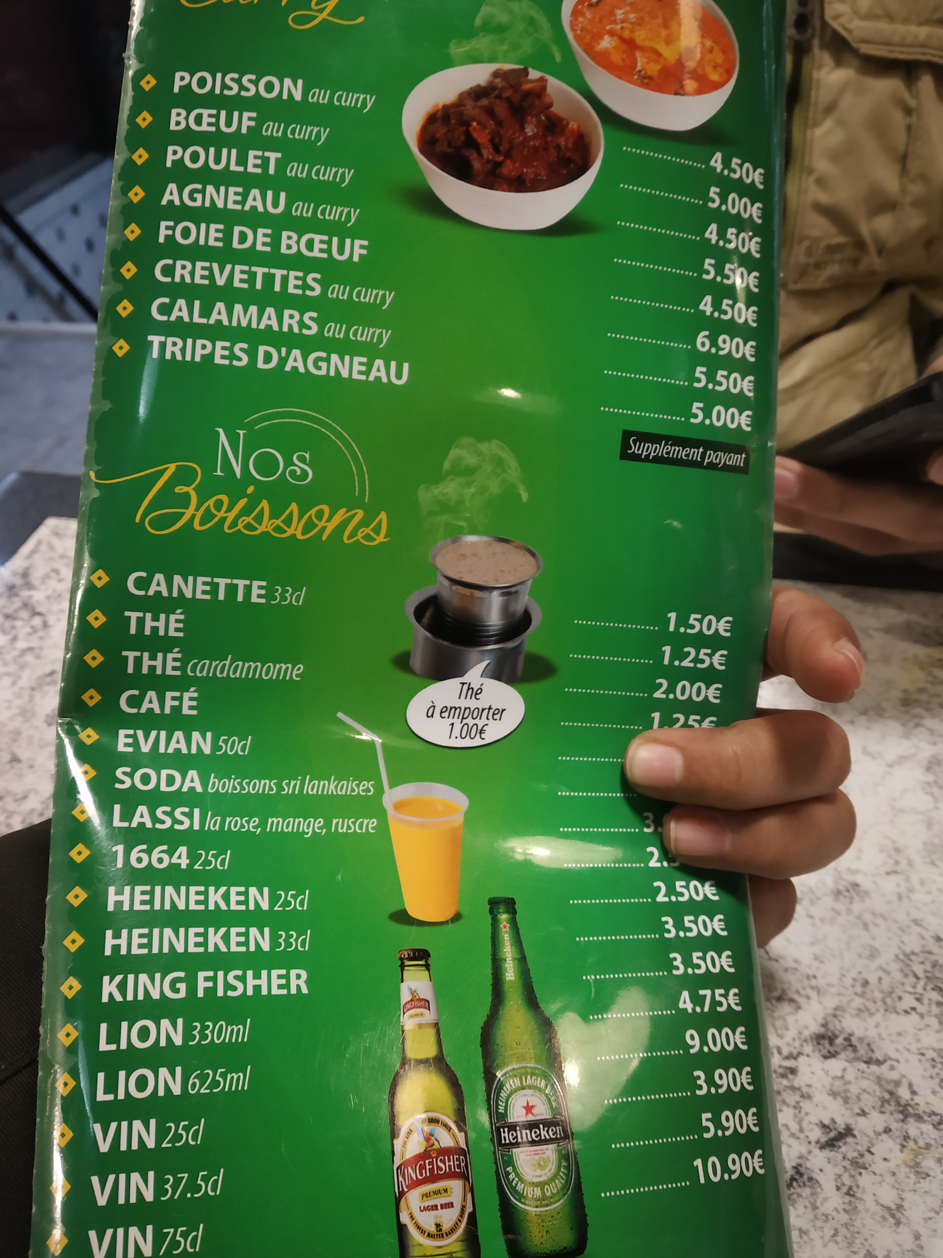 Une bonne ambiance dans le resto seul problème, il est trop petit. Pas de place pour manger sur place, les assiettes sont grand donc pas de place aussi pour mettre sur la table (si on achète plusieurs choses à manger). Je vous recommande pas le biryani à l'agneau, c'est vraiment pas bon limite jamais goûté un truc pareil. Mais le biryani au poulet était bien. Tant dis que les parrota et les kottu rothi sont très bon.