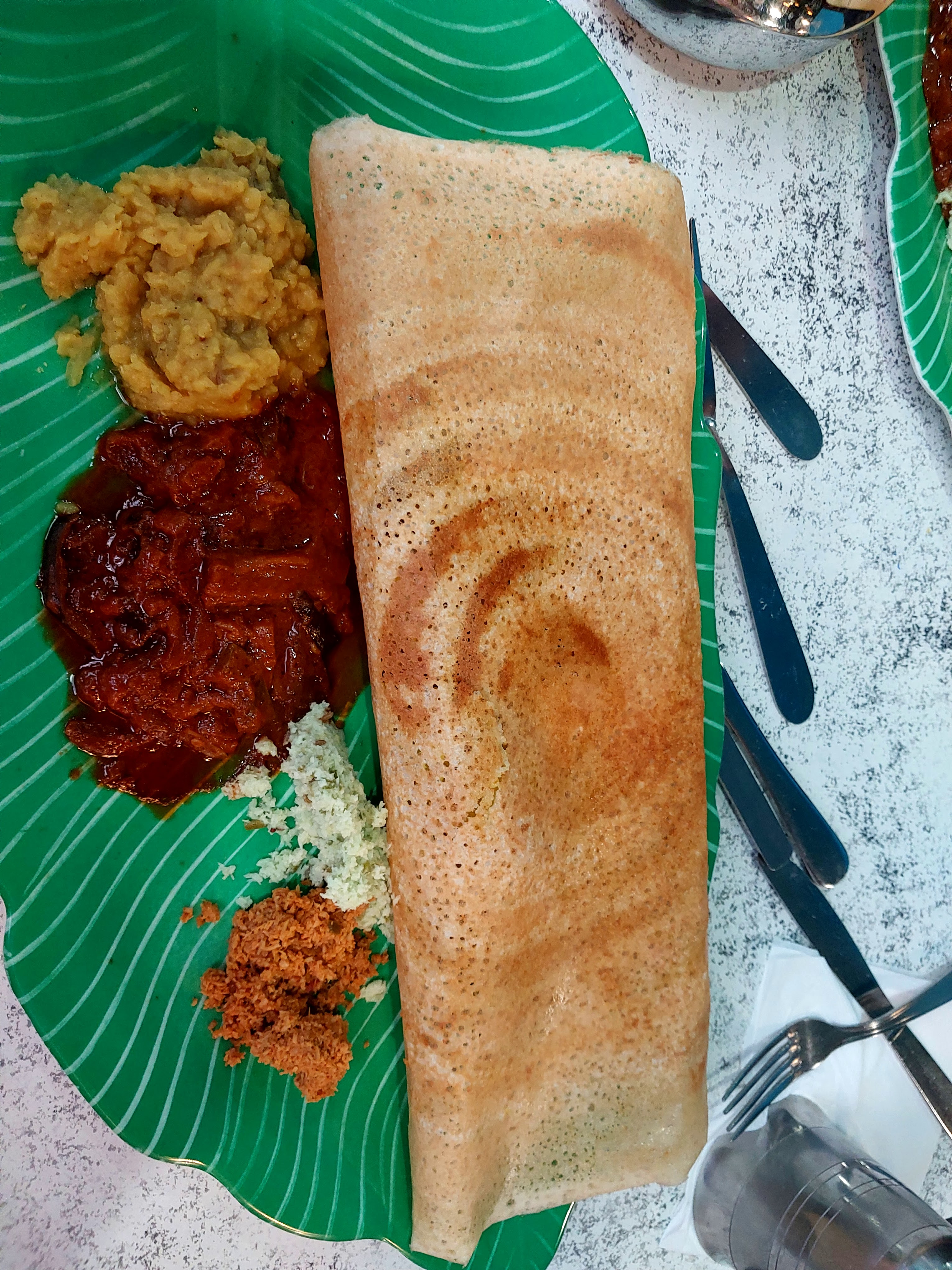 Dosa savoureux, grande portion de chutney de noix de coco et de sambal à l'oignon ! Cela me ramène en Malaisie ! Personnel sympathique et service rapide. Nourriture délicieuse. ❤️