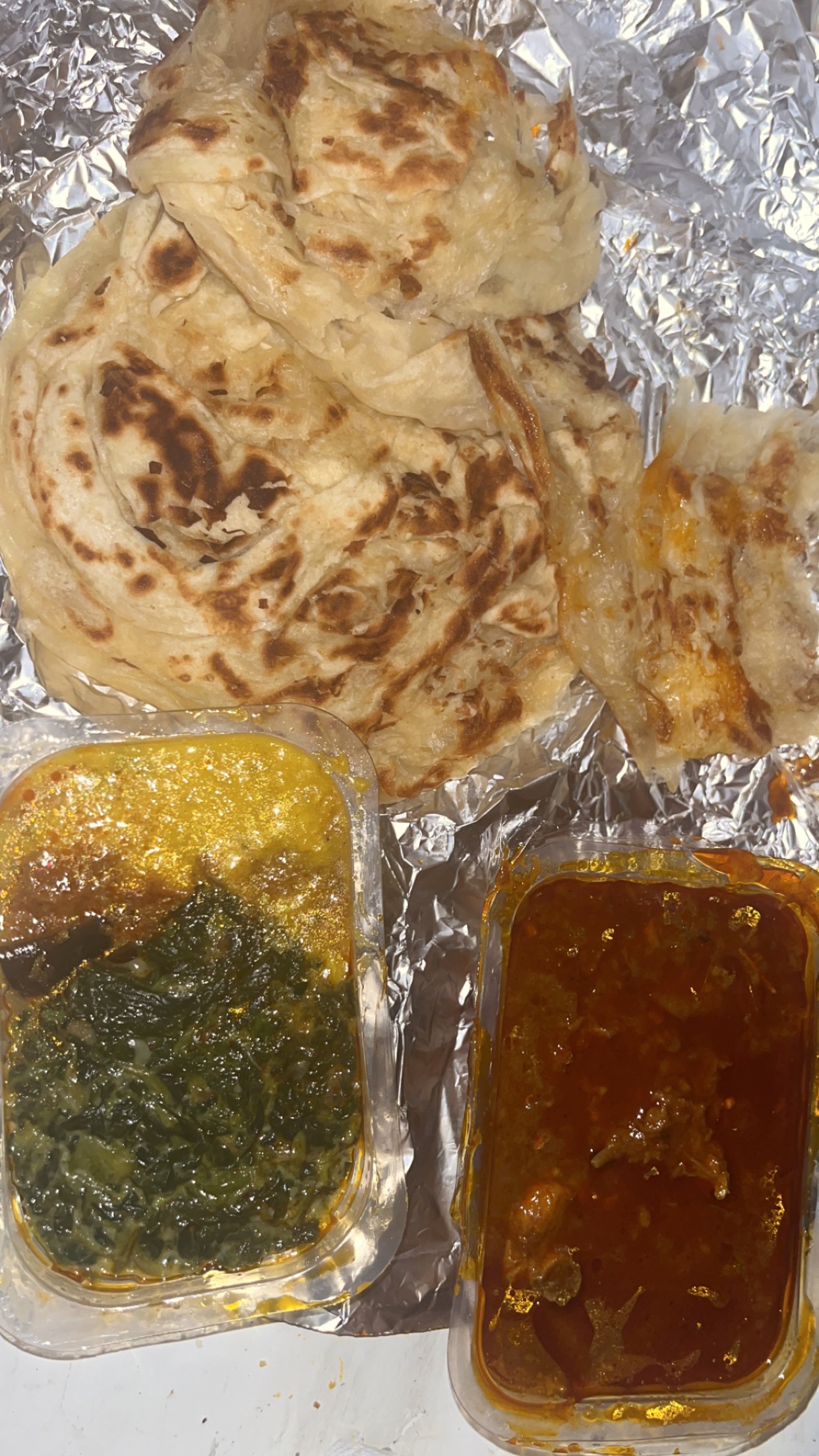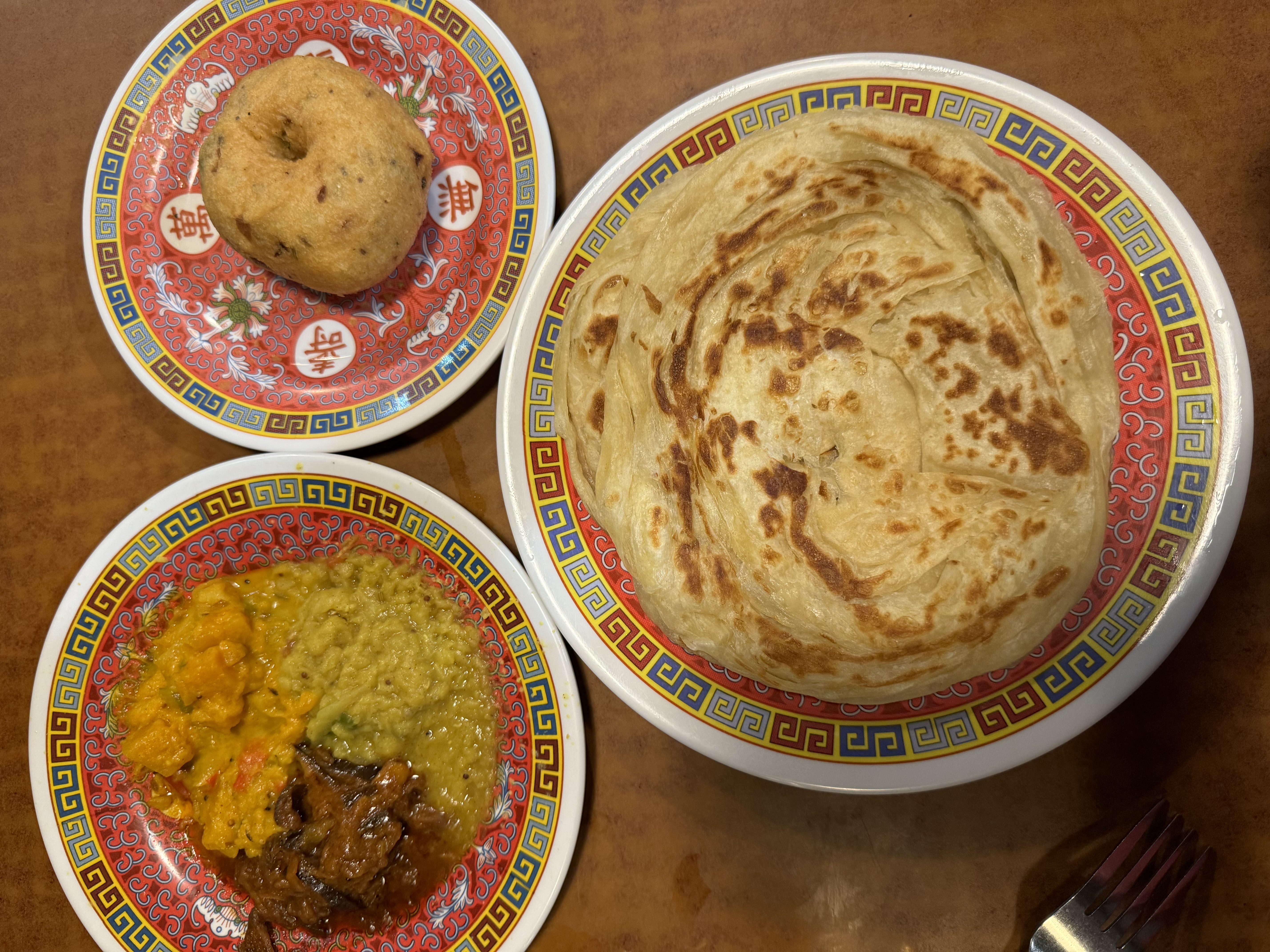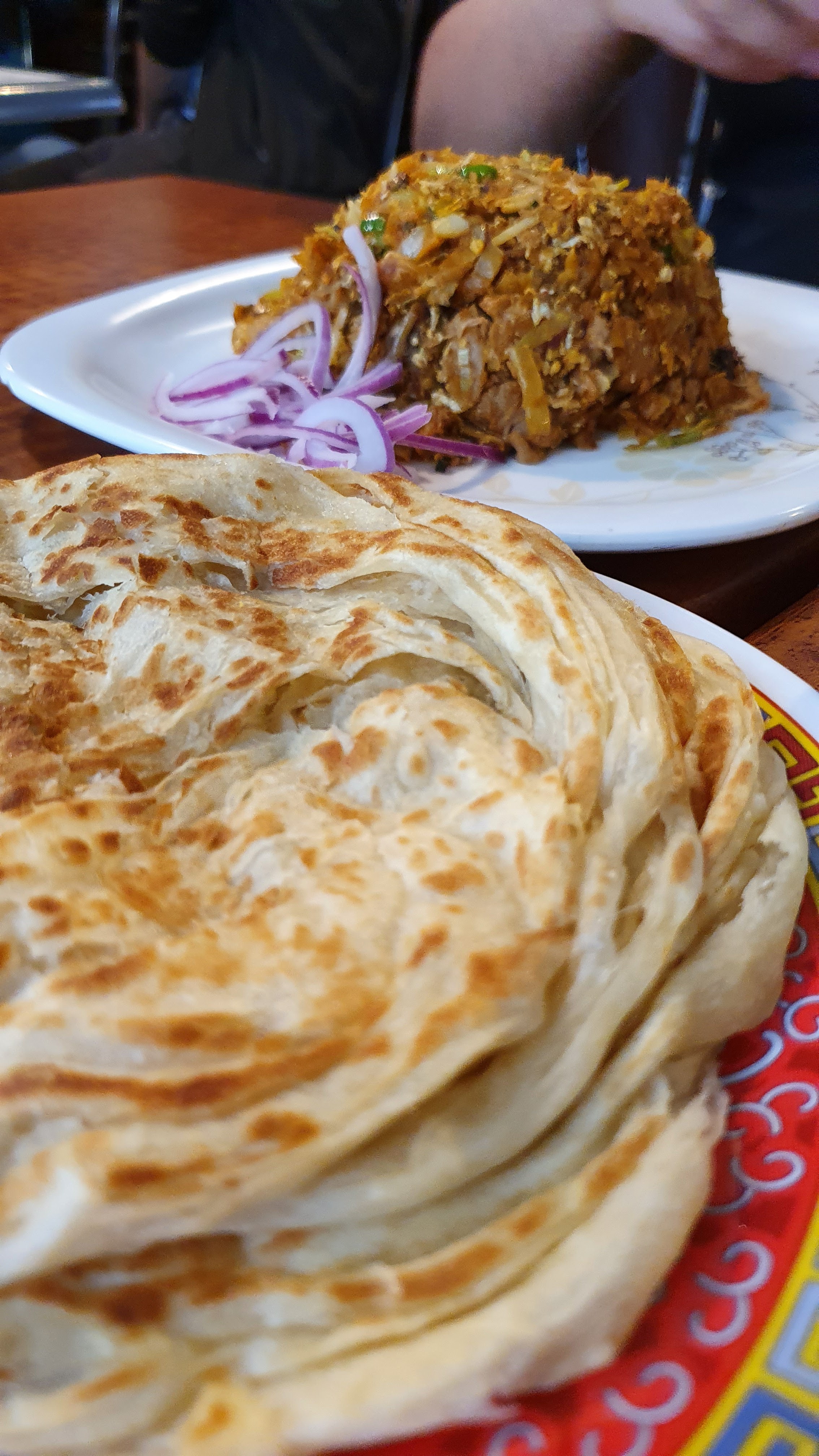 Nous avons commandé 3 Parotta (Roti Canai) avec du poisson au curry. Vous obtenez du chutney et du sambal avec le parota. Le curry vous l'obtenez séparément. Parota est fraîchement préparé et vous pouvez voir vous-même comment il est fabriqué en entrant dans le magasin. Parota avait un très bon goût.