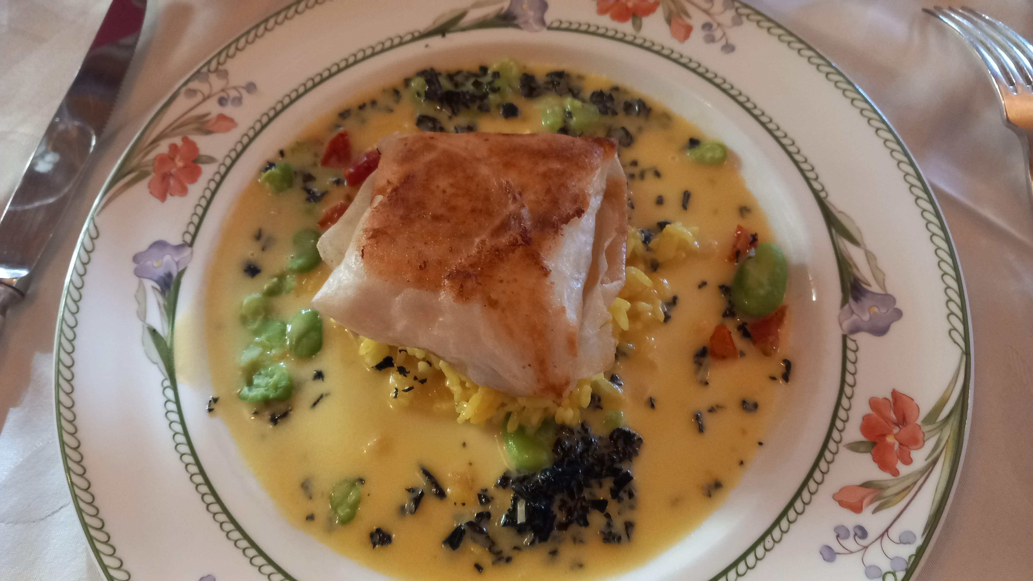 bel endroit avec des décorations florales, bon restaurant, le déjeuner avec du poisson était vraiment savoureux, service très sympathique