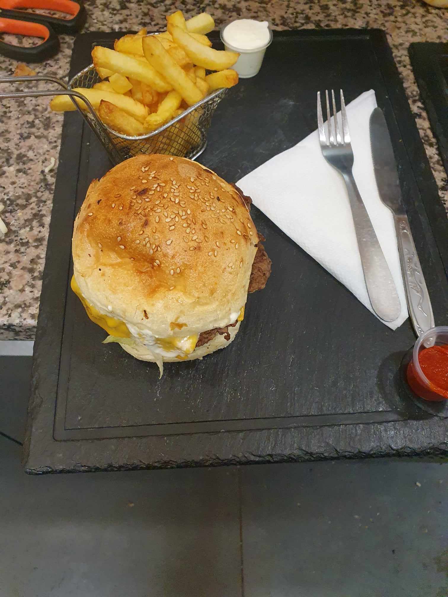 Bonjour, vraiment désolée très bonne tacos ,avec une sauce fromagerie délicieuse, et en a pris des hamburgers juste au toop ,fait maison et les frites aussi maison superbe,et un grand merci pour le personnel qui très accueillant et souriant , vraiment un endroit je le recommande