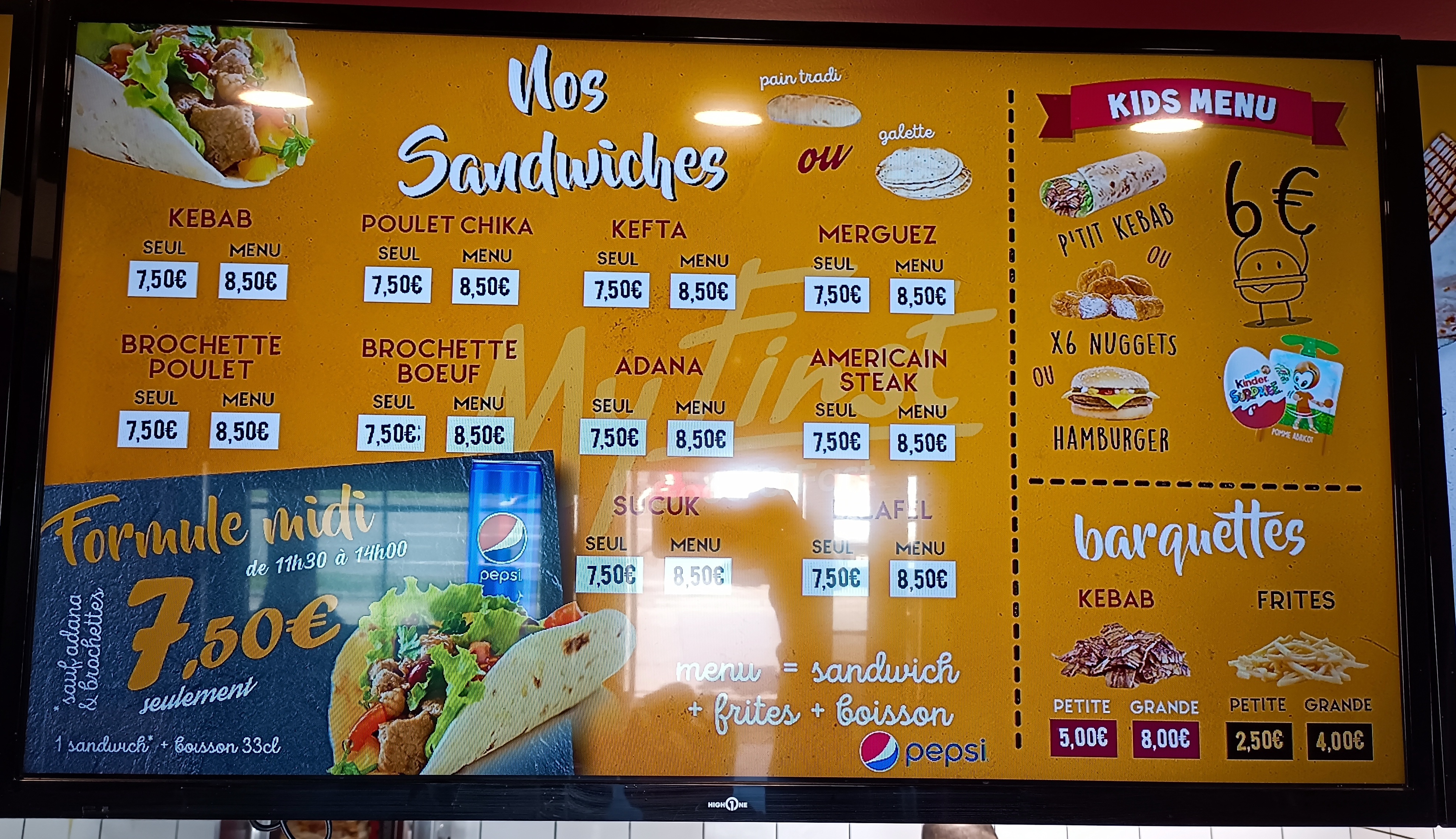 Je n'y suis allé qu'une seule fois mais je n'ai pas été déçu. J'y ai mangé un très bon kebab. Le personnel est accueillant et vous pouvez y manger sur place si vous le souhaitez. Le seul défaut, c'est que j'ai trouvé que la portion de frites accompagnant le kebab était assez légère. Les tarifs ne sont pas plus prohibitifs qu'ailleurs. Pour 7 à 8 euros, vous repartez avec un kebab, des frites et une boisson. Bon appétit...