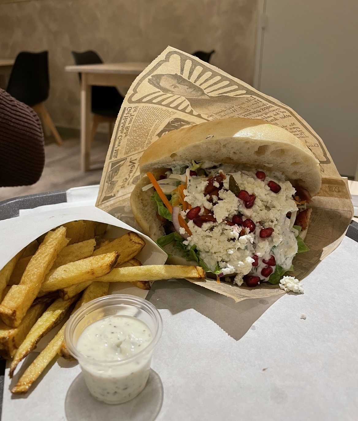Une très belle découverte ,un kebab surprenant qui ne ressemble pas à ce que l'on a l'habitude de déguster ,un mélange subtil d ingrédients qui se marie à la perfection (légumes frais ,feta ,grenade,poivrons)l'assiette est copieuse et l'ensemble est d'une fraîcheur indéniable ,le petit plus les frites sont maison ,vraiment très surprise d'avoir pris autant de plaisir à manger un sandwich ,le lieu est agréable propre de plus le personnel est très sympathique ,nous reviendrons sans hésiter en famille cette fois et avec grand plaisir ❤️