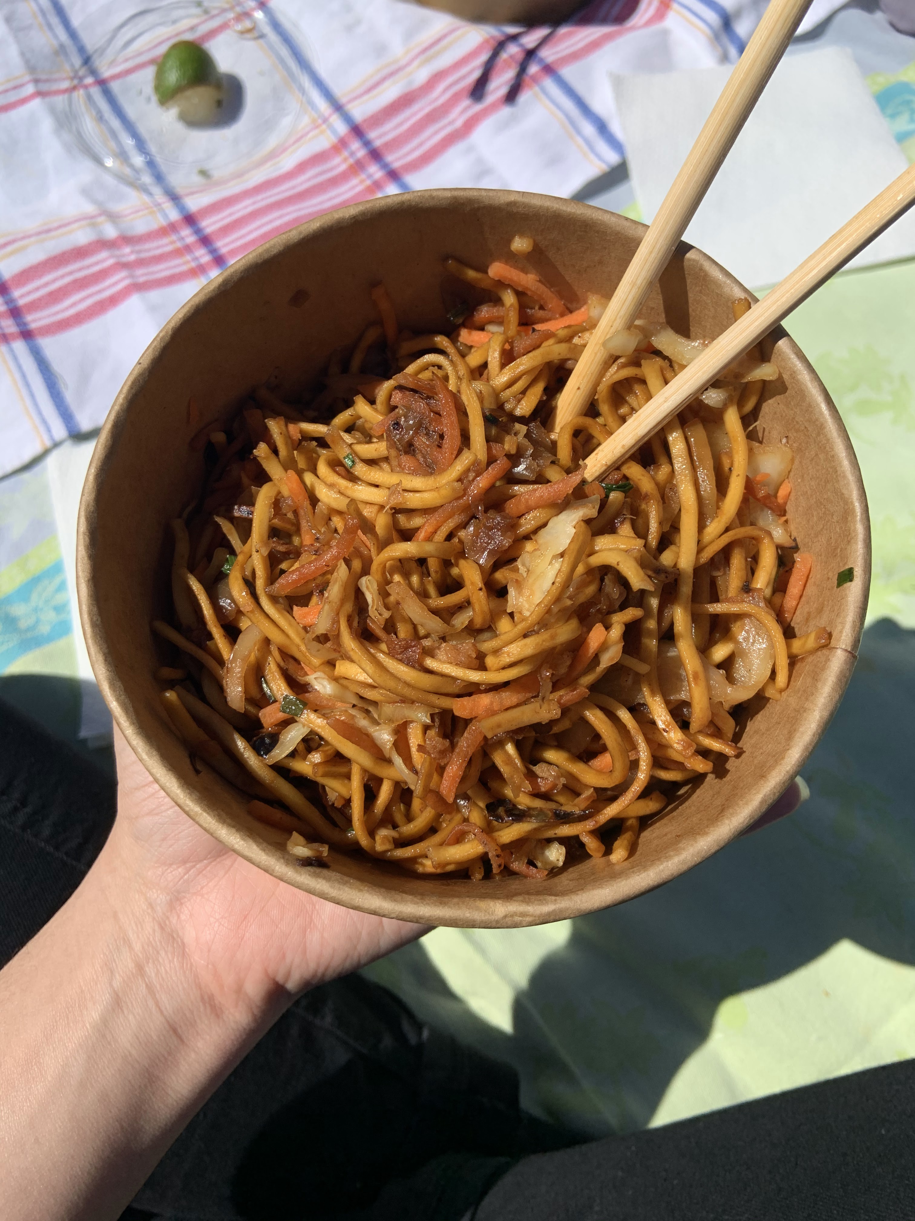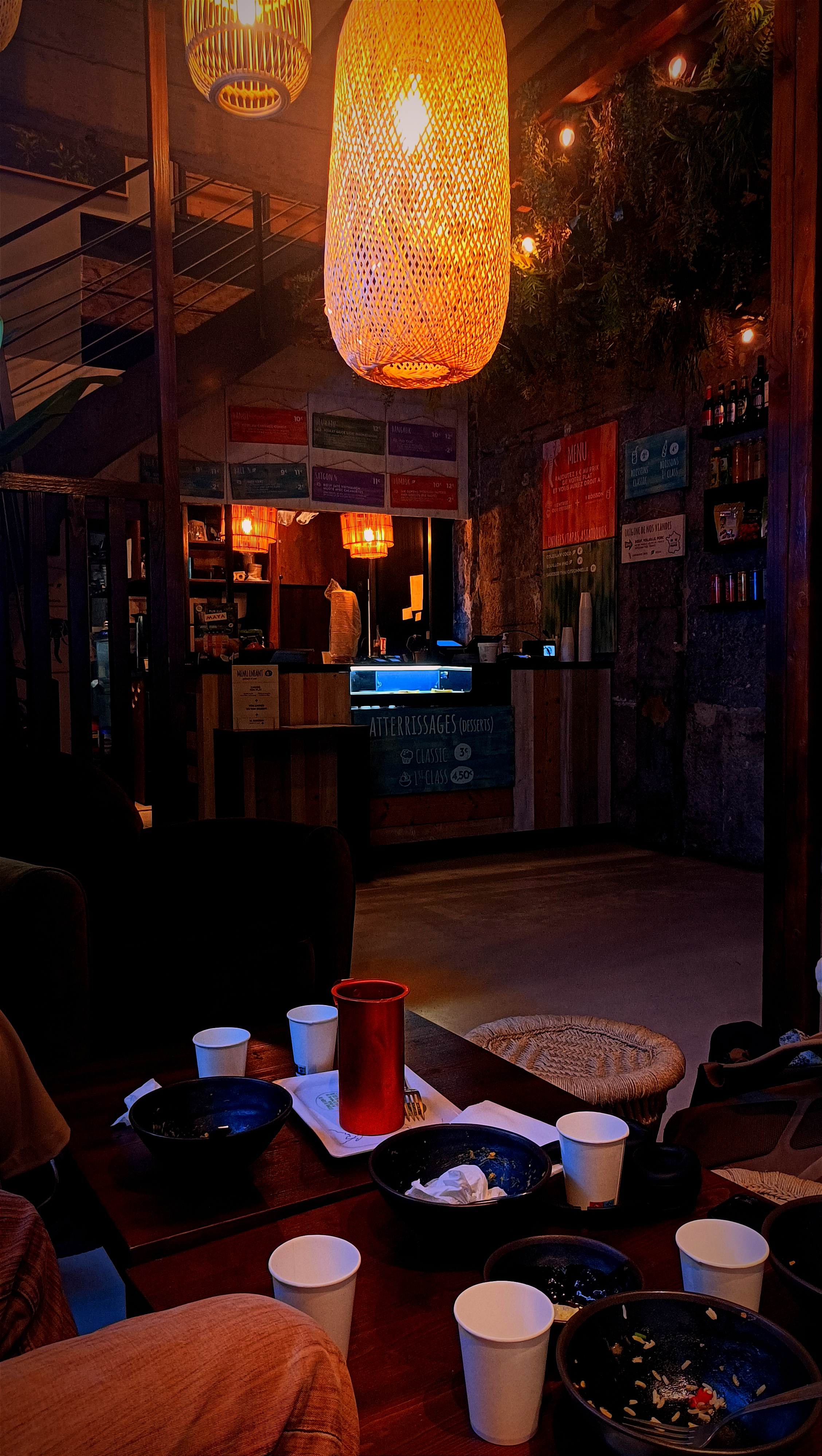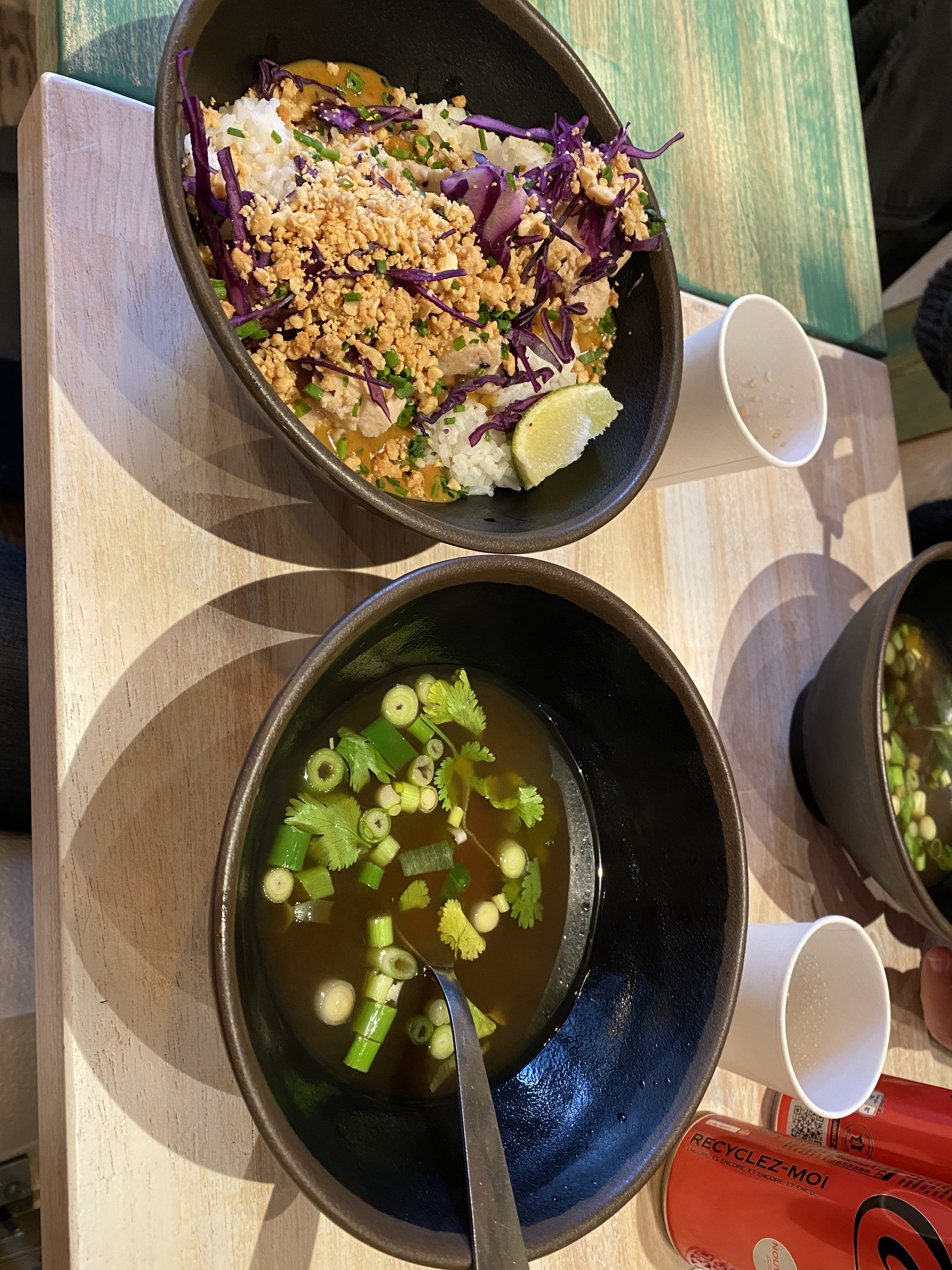 Nous nous installons dehors sur une table avec des morceaux de riz collés restants. Commande sur téléphone, d'abord étonné pour un restaurant, finalement le concept n'est pas si mal, c'est optimisé. Le bo bun que j'ai commandé était malheureusement fade. Les nems étaient mous et petits (1.50 eu de supplément nems n'y auront rien changé). Beaucoup trop de pousses de soja (fort en goût) par rapport au reste de l'assiette. J'ai fini mon plat dans un fond d'eau. Le pad Thaï de ma compagne était cependant un peu meilleur. Expérience moyenne moins. Les prix sont corrects. Je ne retenterai pas l'expérience je ne suis pas convaincu. Je vous souhaite toutefois une bonne continuation et de continuer à vous améliorer.