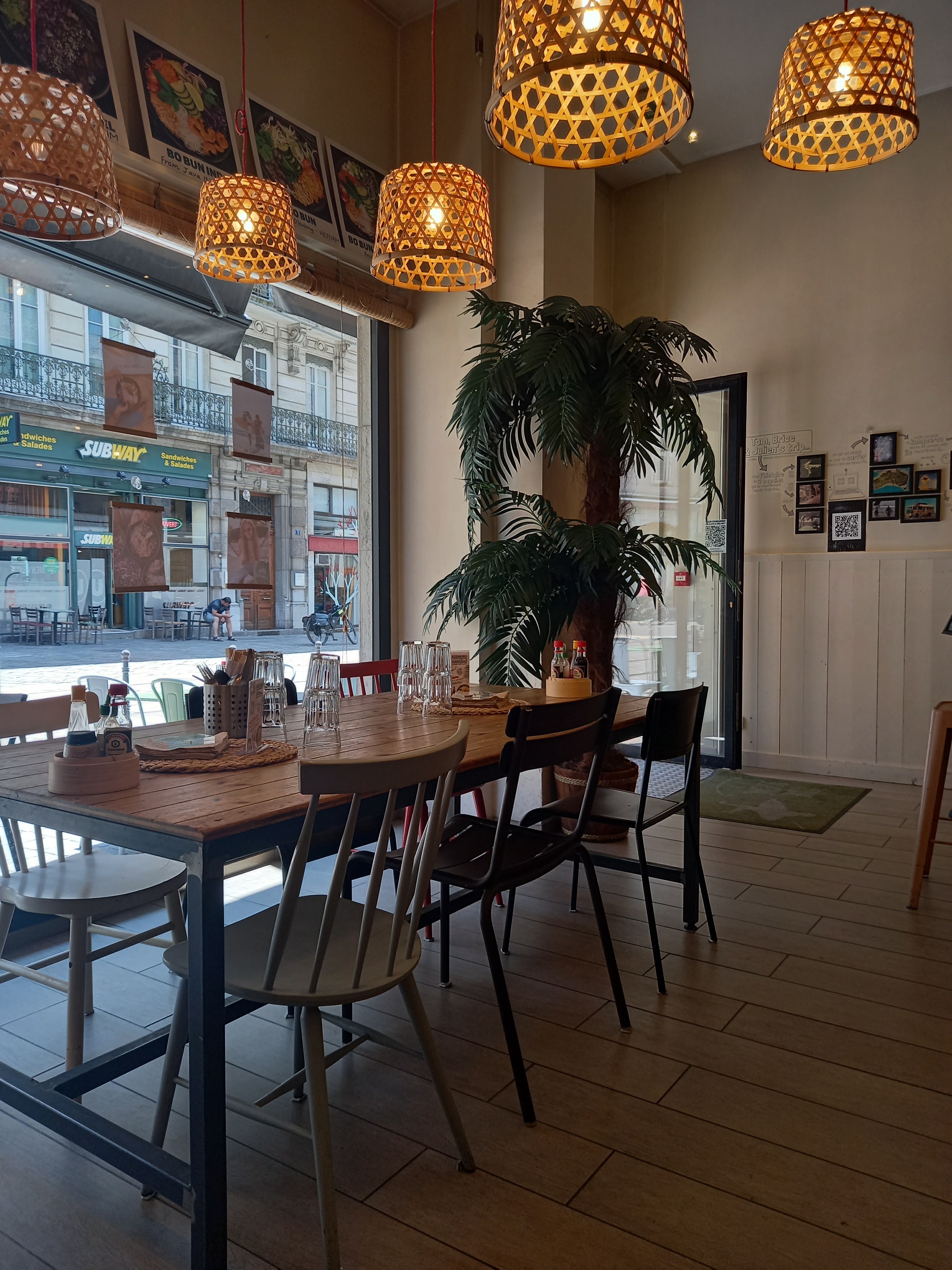 L'intérieur est très beau, on y mange des plats plutôt consistants que l'on peut remporter si c'est trop pour notre petit estomac Le service y est rapide, la jeune femme qui prend les commandes est de très bon conseil ! C'est très savoureux et le rapport qualité/prix est au rendez-vous.