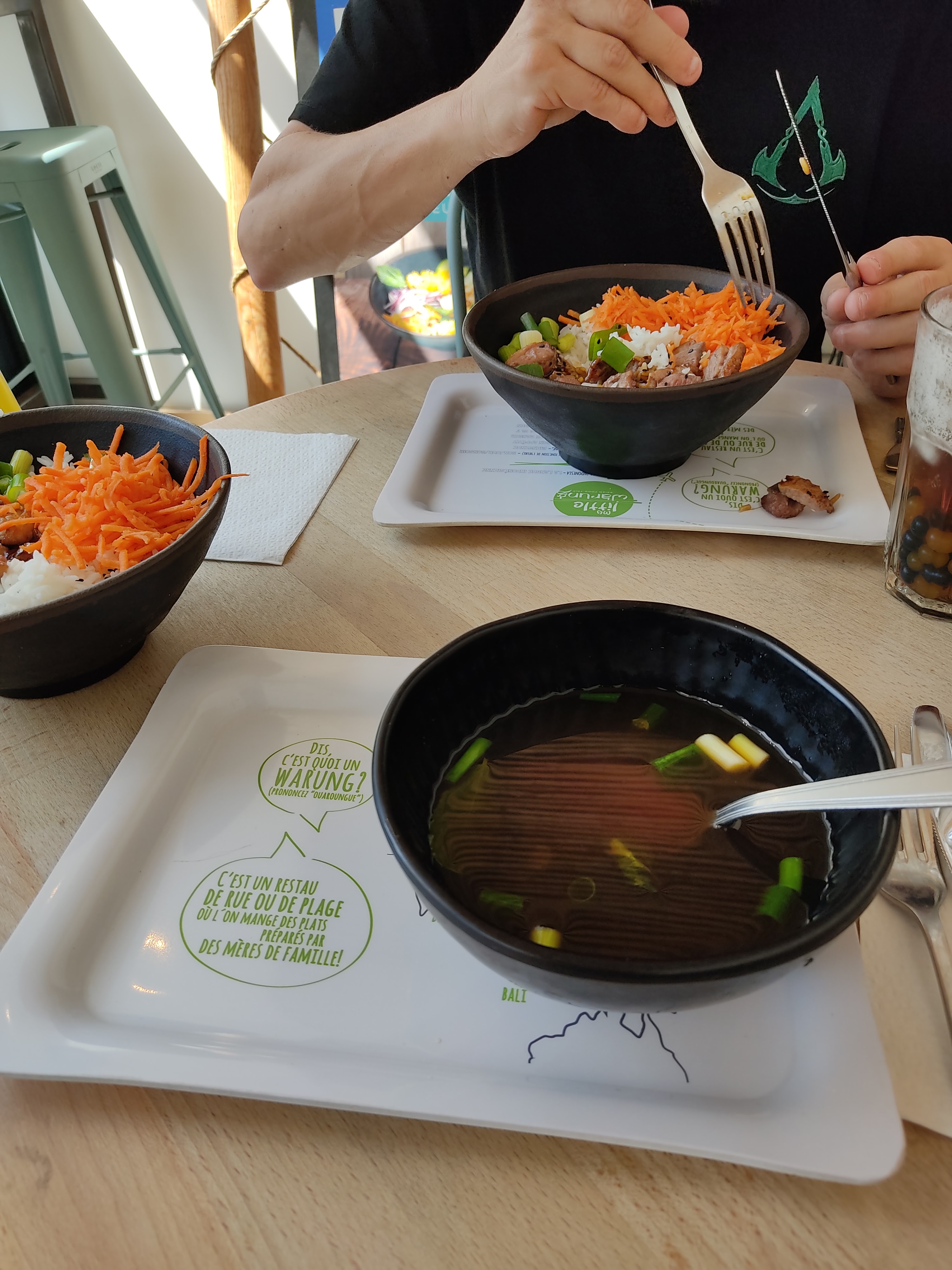 Il faudra revoir votre esprit Warung Bienvenue chez nous, vous êtes chez vous ! car je ne suis pas senti chez moi et encore moins le bienvenue. Accueil déplorable, je dis bonjour devant le serveur, il me regarde sans même me répondre et continue à papoter avec la cuisine. Il y rentre et au bout de 5 longues minutes la cuisinière prend conscience que j'attends. L'accueil est un peu mieux, un bonjour mais en tirant la gueule. Je suis déçu de mon plat, il devait y avoir une petite omelette mais elle n'y était pas. Et quand je demande, j'entends depuis la cuisine on a plus d'œuf, cela aurait bien de le dire avant la prise de commande. Les boissons ont été servis bien longtemps après. On était les seuls dans le resto' mais trop occupé avec les commandes uber and co'. Le plat était bon malgré l'absence de la petite omelette... Un manque de professionnalisme flagrant.