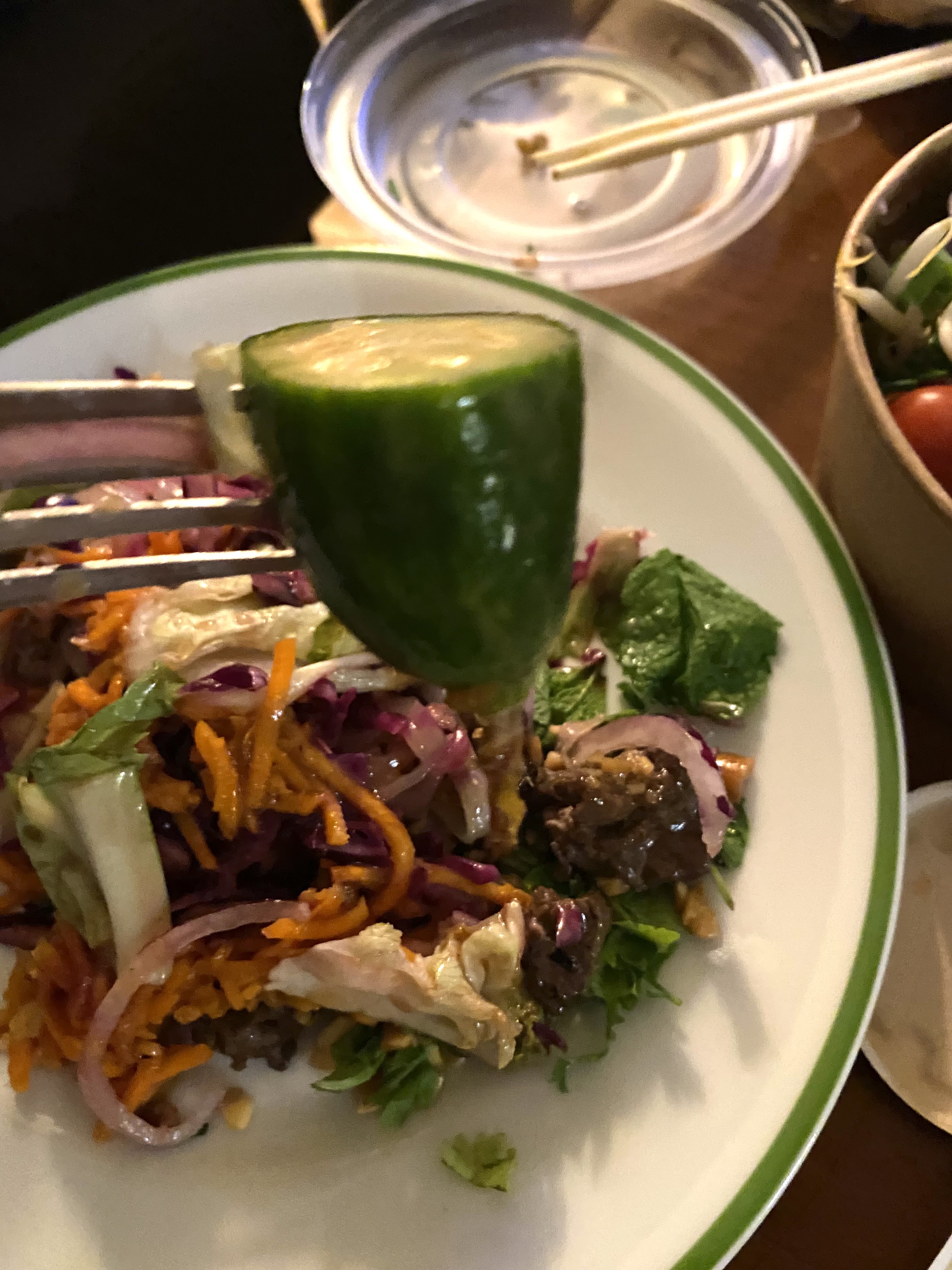 Nous avons commandé un poulet satay bobun... les prix sont abusifs : 12 euros un mini plat composé essentiellement de salade et de 3 morceaux de poulet.. je veux bien qu'il y ait l'inflation mais là ça dépasse ce stade... la prochaine fois on ira chez au resto voisin qui propose des plats asiat plus copieux!