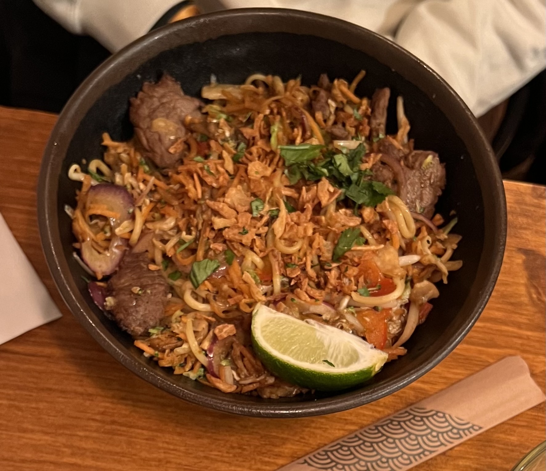 Des plats frais préparés devant vous. Service rapide. Prix raisonnable. La photo représente un Pad Thai au bœuf avec une sauce Teriyaki et des oignons croustillants.