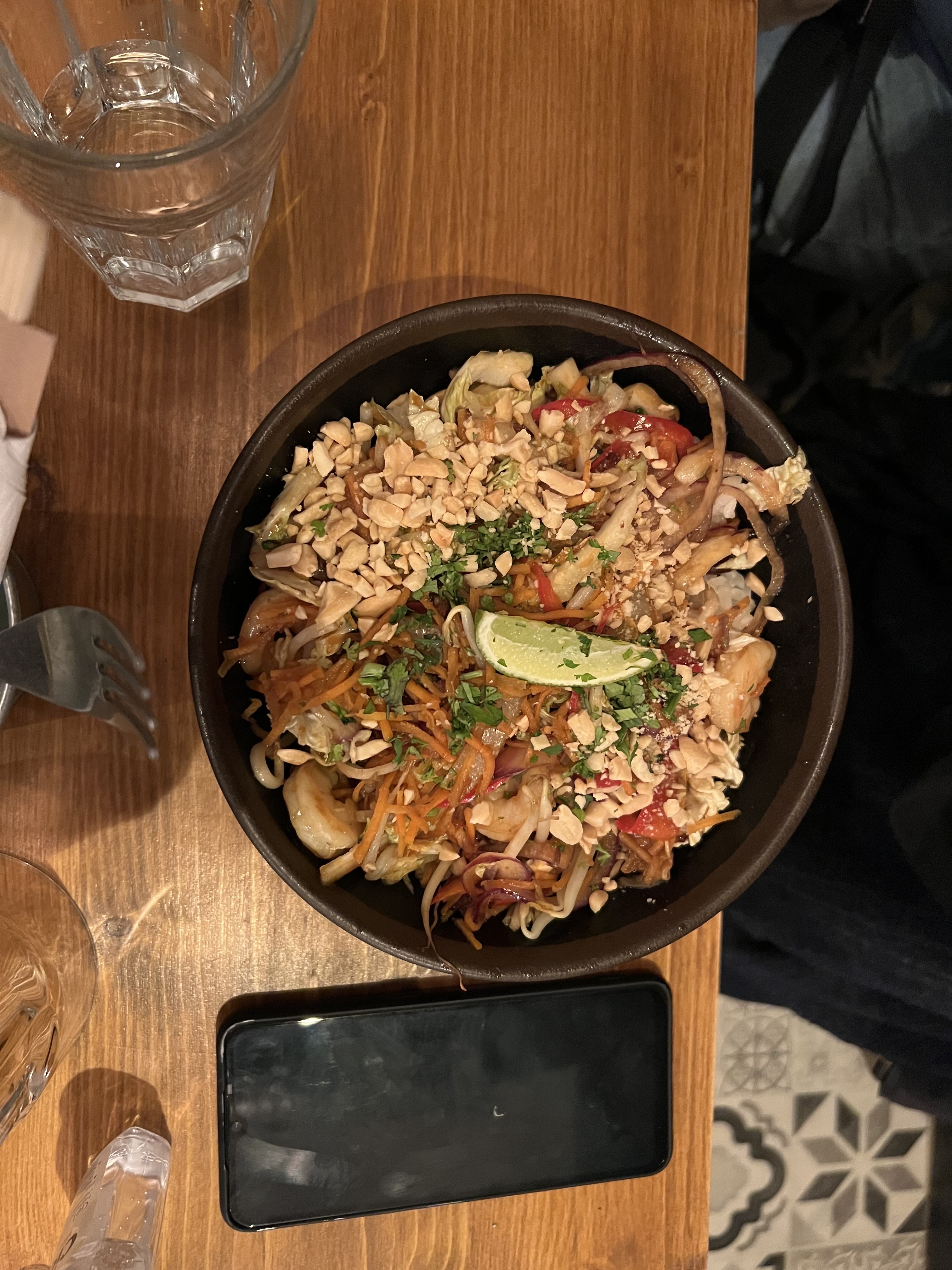 Pad Thaï très généreux et savoureux, avec de bons produits frais ! Le service était impeccable, le prix vraiment raisonnable pour la quantité et la diversité de la garniture. Foncez-y les yeux fermés !