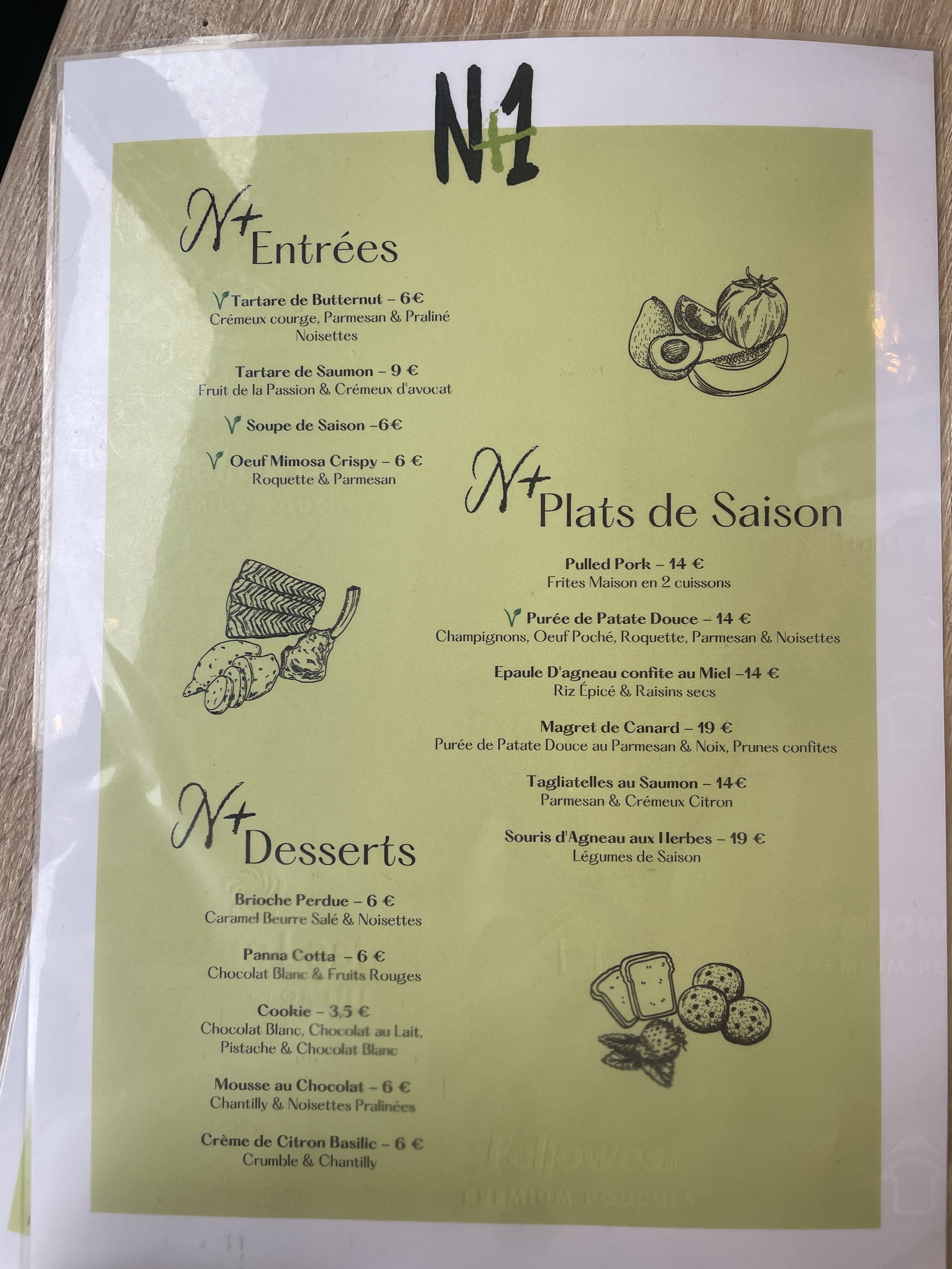 Une cuisine fraîche et gourmande avec une équipe sympathique. Chez N+1 il vaut mieux réserver. La petite salle était pleine et les clients s'enchaînent pour des plats à emporter. Les entrées étaient originales et les plats très bien réalisés avec quelques ingrédients qui ajoutent de belles saveurs. Option Végé et desserts au top. Le service était un poil lent, peut être prioriser les clients sur place qu'à emporter pour réduire l'attente ?