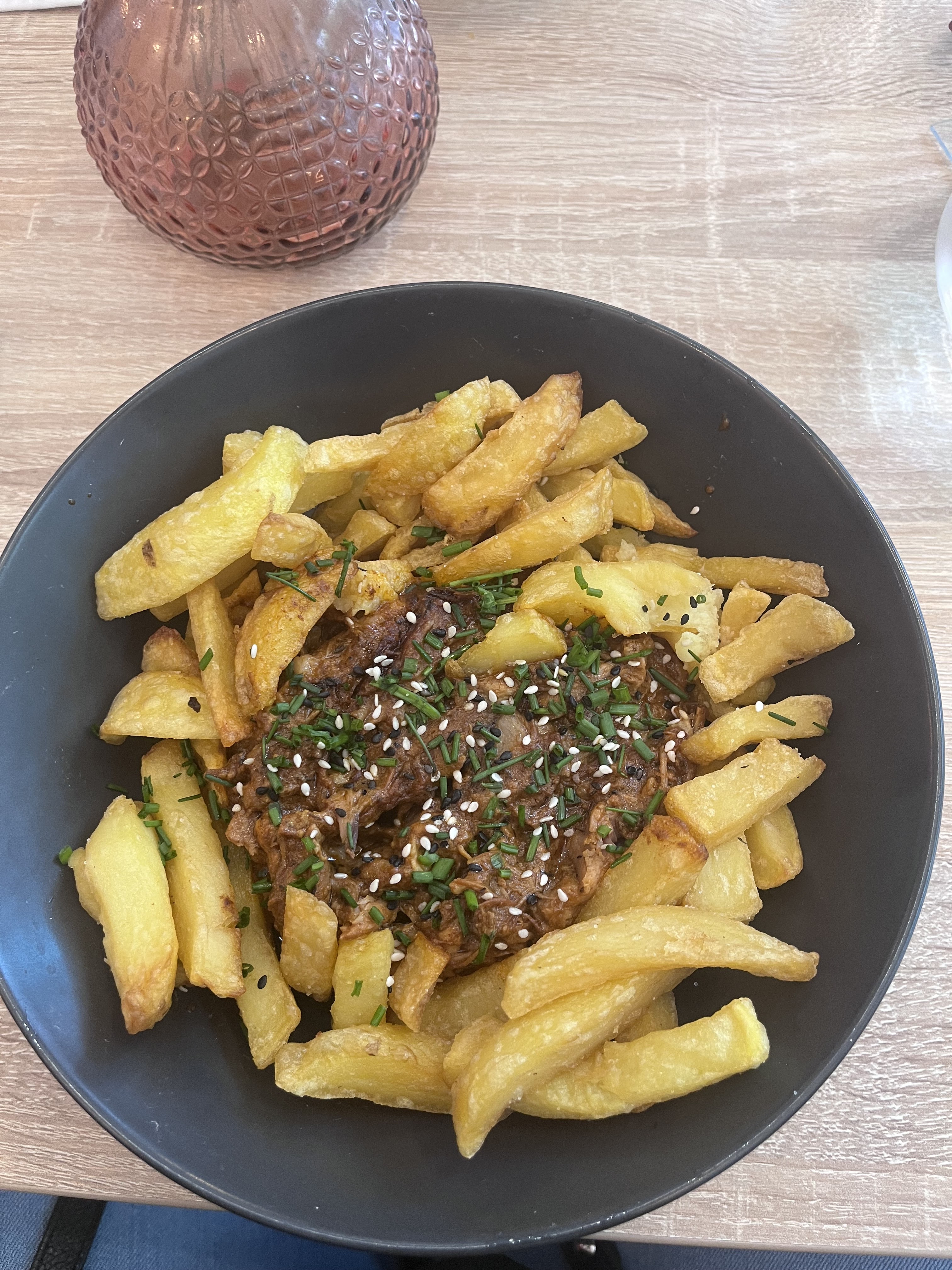 Je ne peux que recommander le porc mariné avec les frites maison : un régal ! Un plat réconfortant qui met tout le monde d’accord !