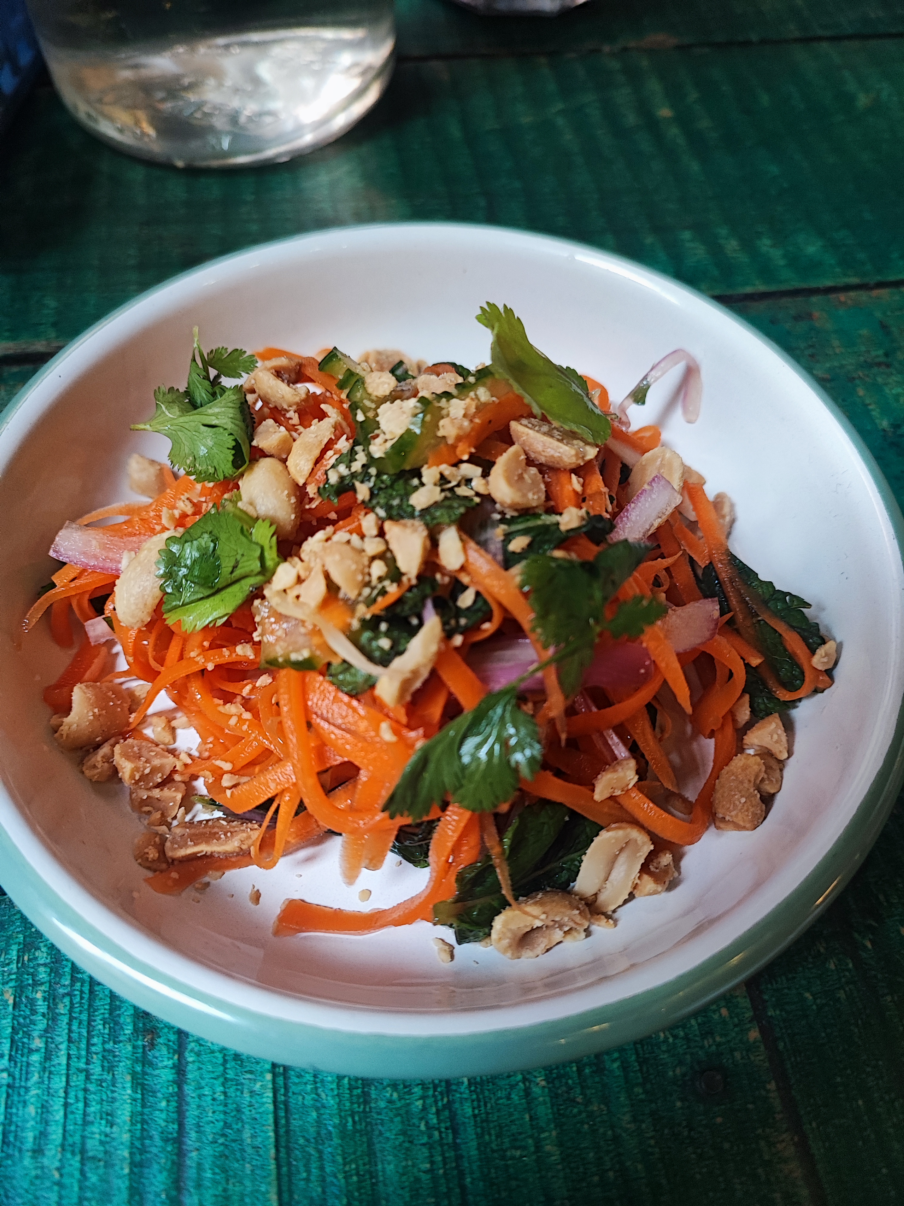 Excellents plats et les serveurs sont adorables, super expérience. On a gouté la salade thaïe en entrée, super bon mélange des saveurs avec le piquant hyper bien dosé. Le bœuf massaman est juste une dinguerie, la viande se coupe à la cuillère tellement c'est tendre (j'aurais bien aimé un petit peu plus de patate douce ;), c'est parfait pour les débutants au piquant. Les travers de porc également trop bons, la sauce est douce et se mélange trop bien avec les légumes. On a fini avec le flan au coco...divin, texture moelleuse avec une fine couche croquante, une tuerie. On reviendra 🥰
