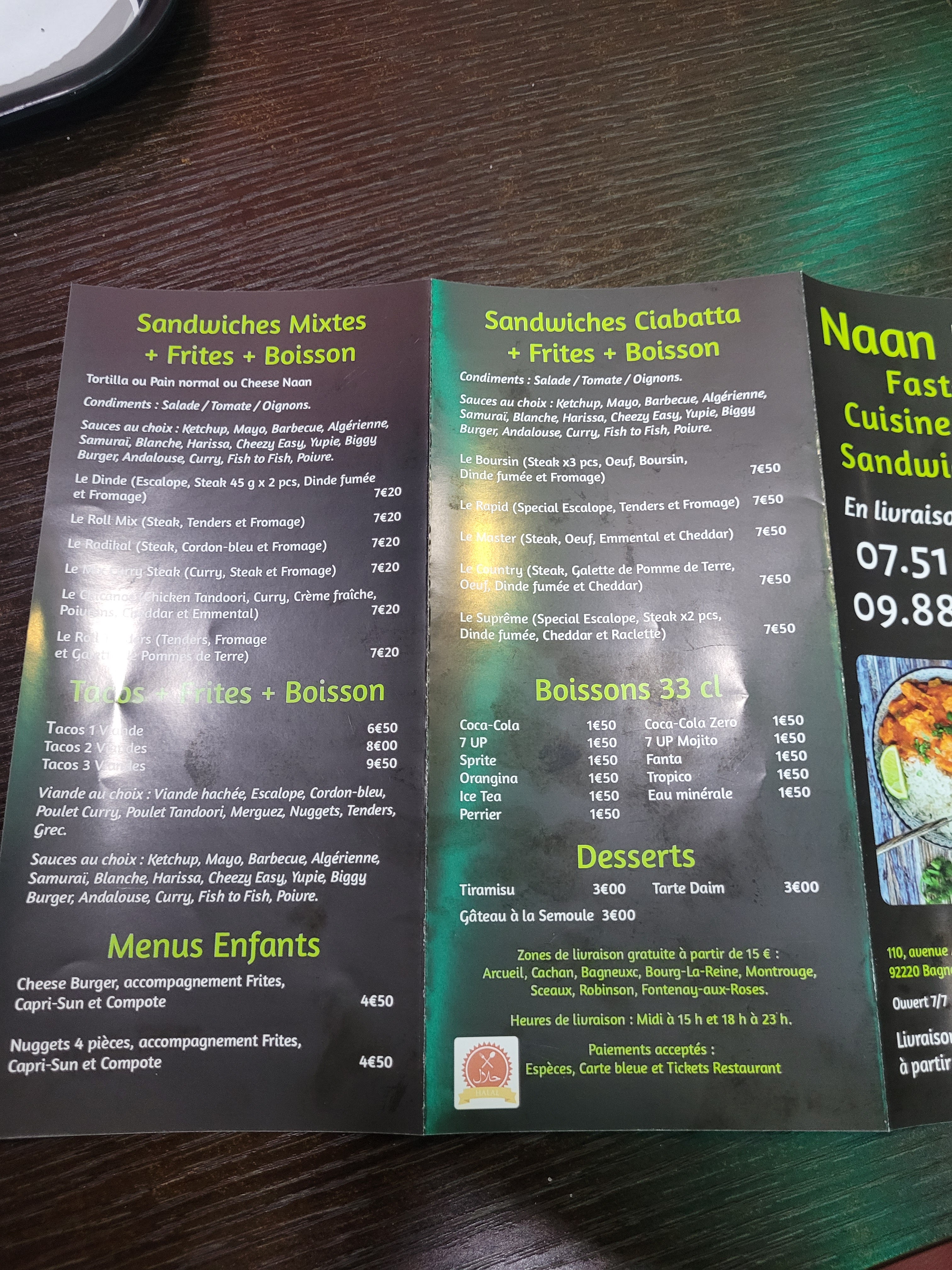 Très bon fast food, leur Naan est vraiment top ! Carte très fournie, sandwich, plat a base de riz, burger, panini vraiment un large choix !
