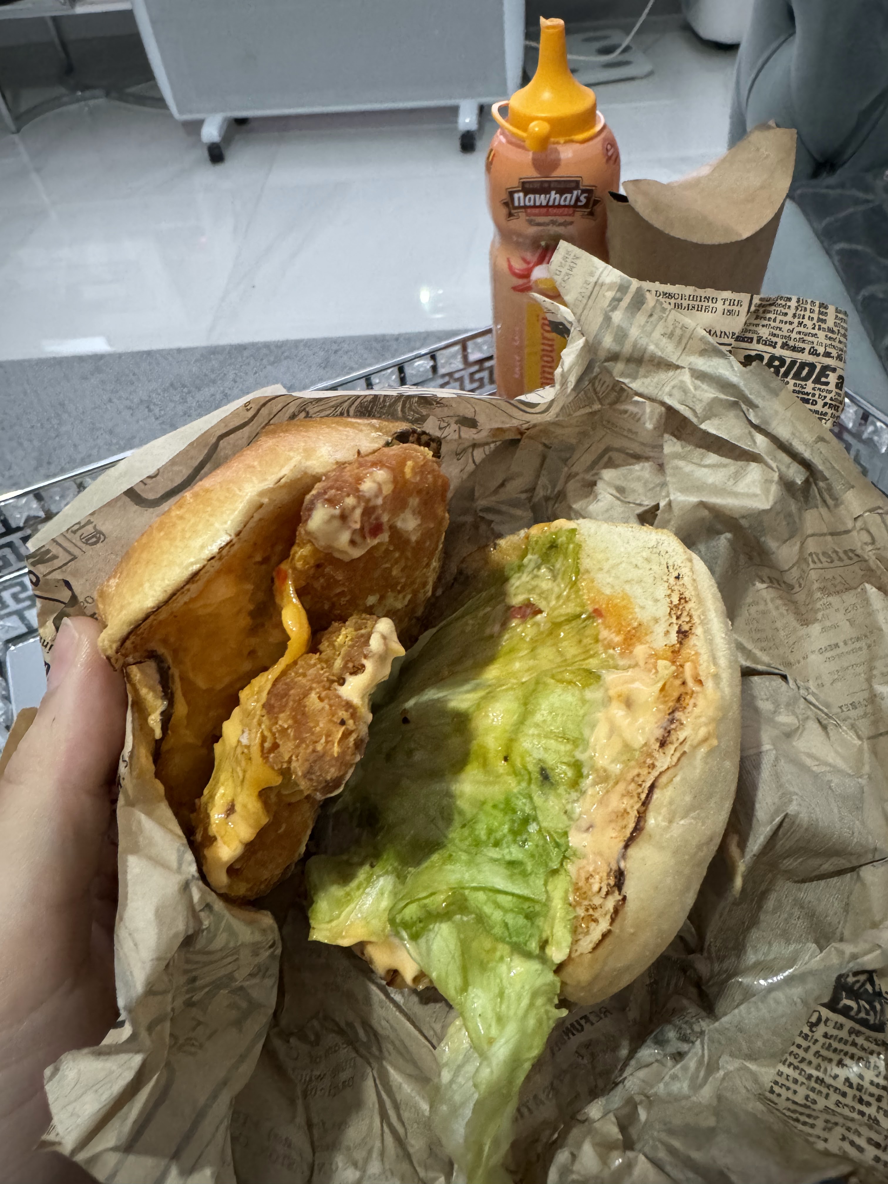 on a commandé cheese nan poulet avec salade et tomate et avec sauce fromagère et sauce biggy, on a senti qu’on a mangé le cheese nan sans poulet, par contre l’assiette poulet tender était vachement mieux que le nan « poulet »