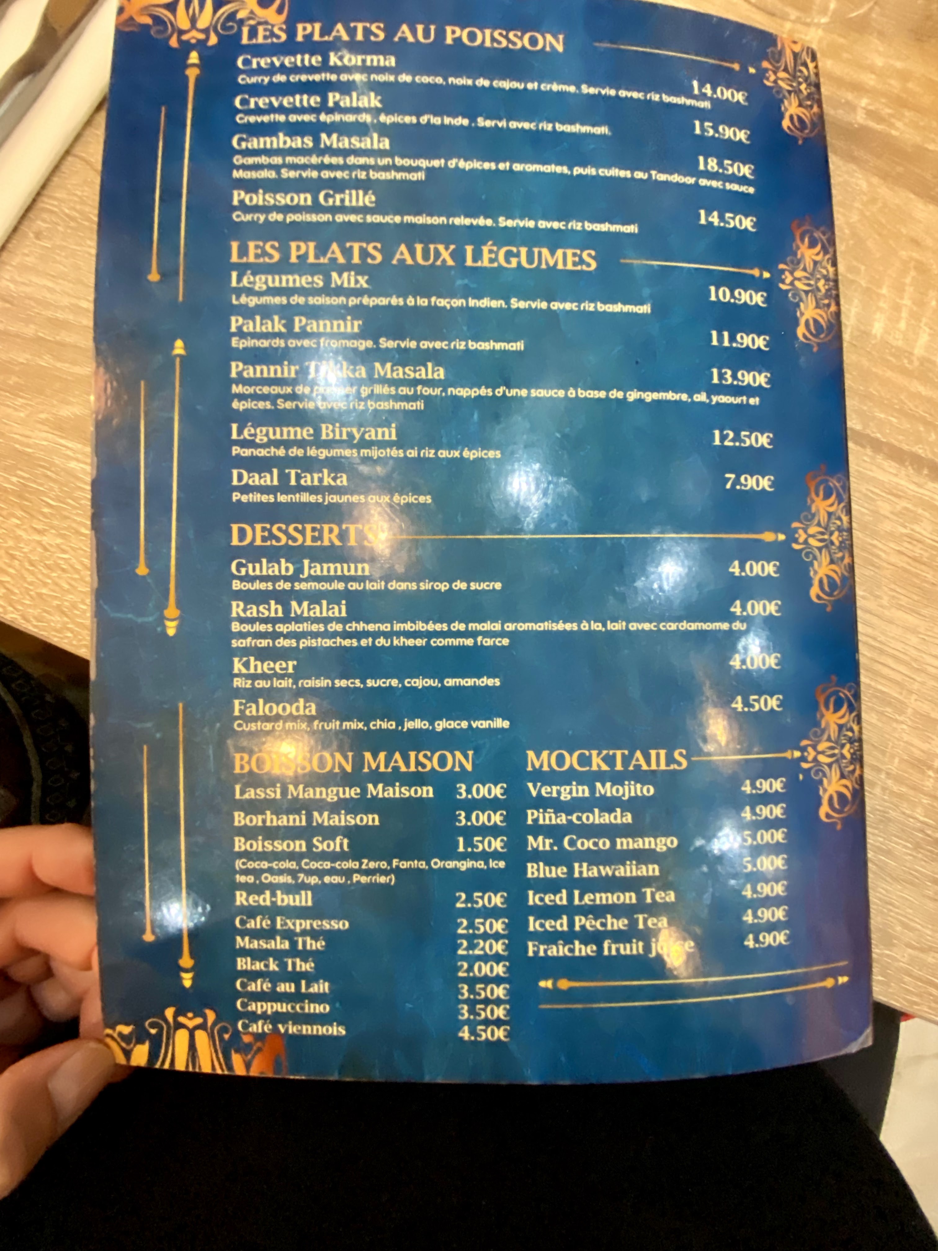 Nourriture délicieuse. Poulet 65, poulet korma, tandori et biryani. 55EUR avec boissons. Personnel sympa et serviable, ouvert toute la journée. Ça vaut vraiment le détour.
