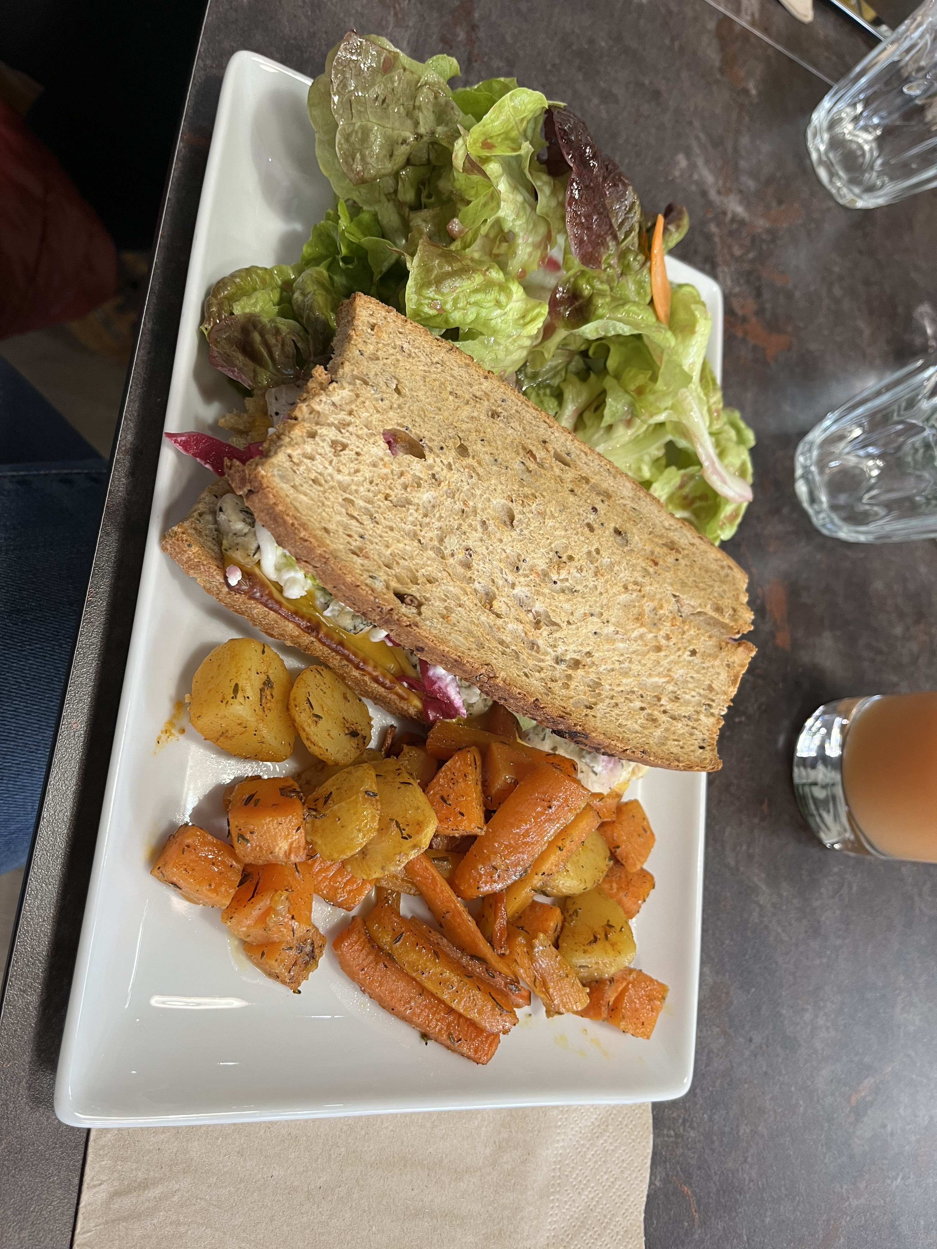 Assez déçue de l’expérience client. Je pensais le garder pour moi mais finalement vu l’accueil à la critique constructive donné en caisse, je préfère prévenir. Je regrette l’absence de sens commercial. Le carrot cake n’est pas une réussite (sec, sableux, assez fade) le sans gluten ne peut pas être bon à base de farine de riz uniquement, il faut travailler ces recettes quand on veut proposer du sans gluten (à peine une bouchée de déguster impossible d’en manger) aucun geste de la part du personnel frustration +++ d’avoir payer un menu à presque 10€ pour uniquement boire un thé et un verre de 25cl de thé glacé. Ni même une considération. Le pain perdu est bon mais 3 morceaux de baguette blanche, quelques morceaux en dés de pomme et 3 raisins coupé en 2, peu m’y mieux faire. Le sens du commerce se perd et c’est malheureux. On ne reviendra pas. C’est dommage. Vu le coût, on attend une réelle expérience plaisir, au final, juste un café qui surfe sur la hype du sans gluten et vg sans mettre en avant une réelle expérience pour le client.